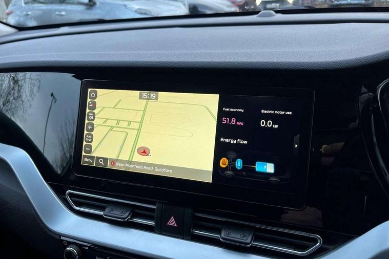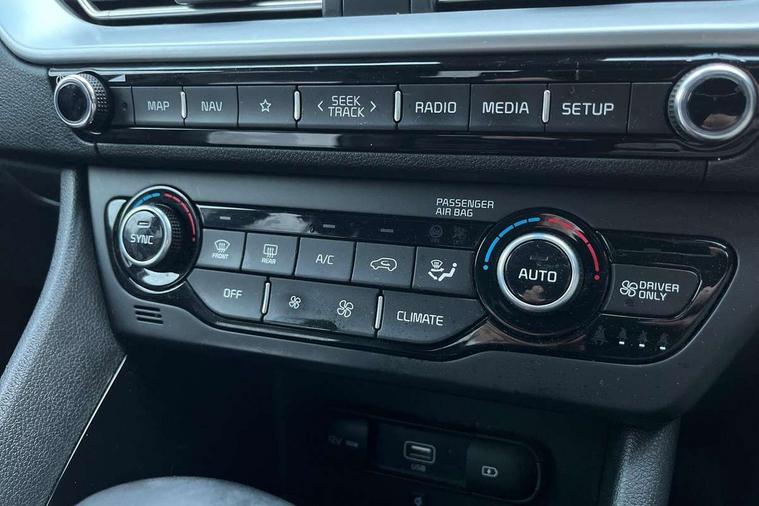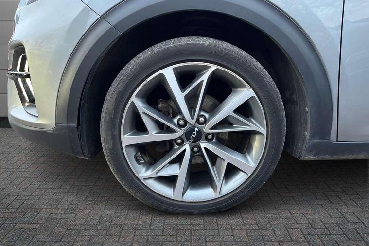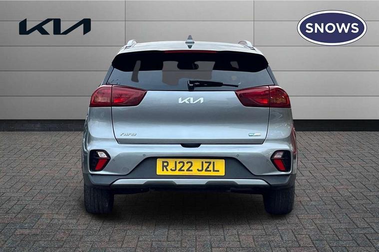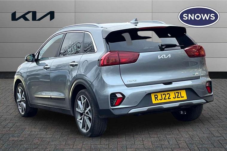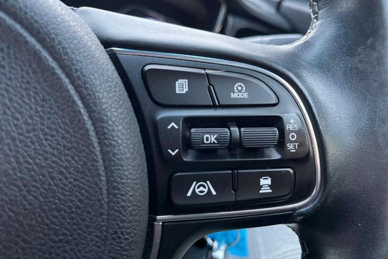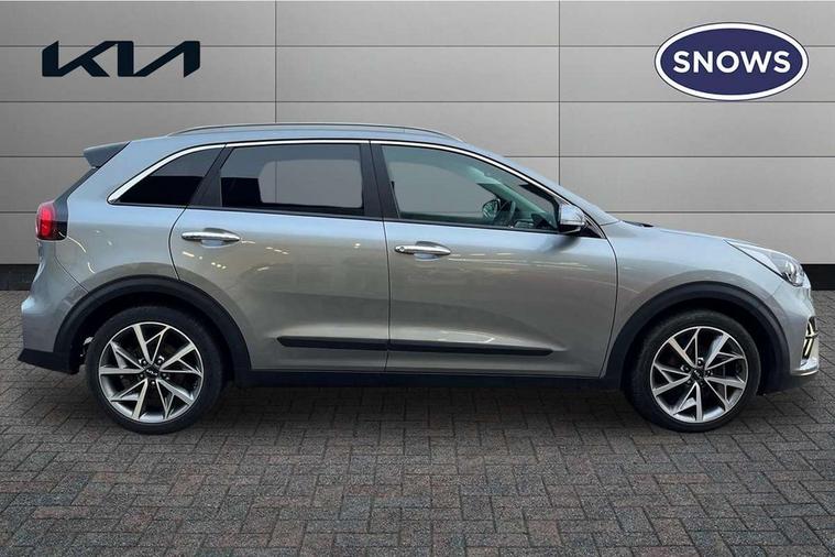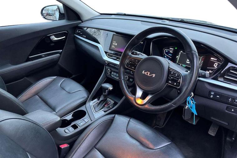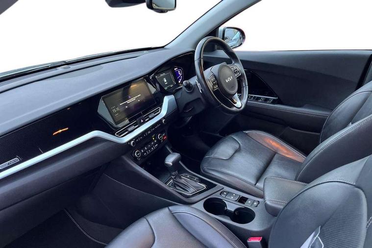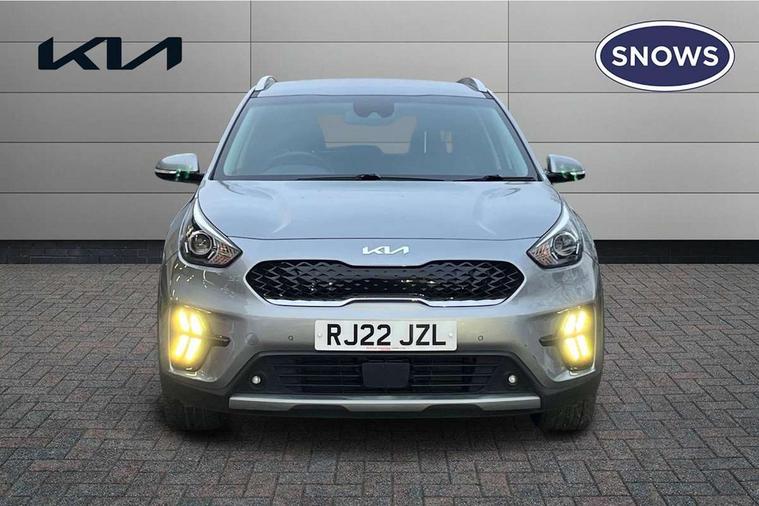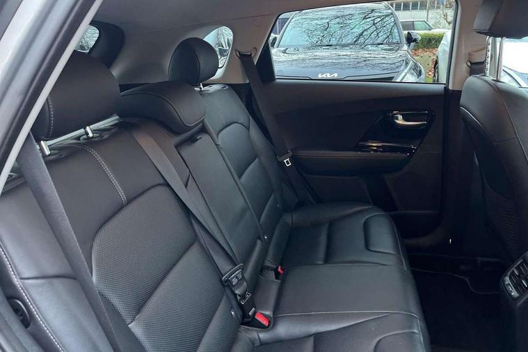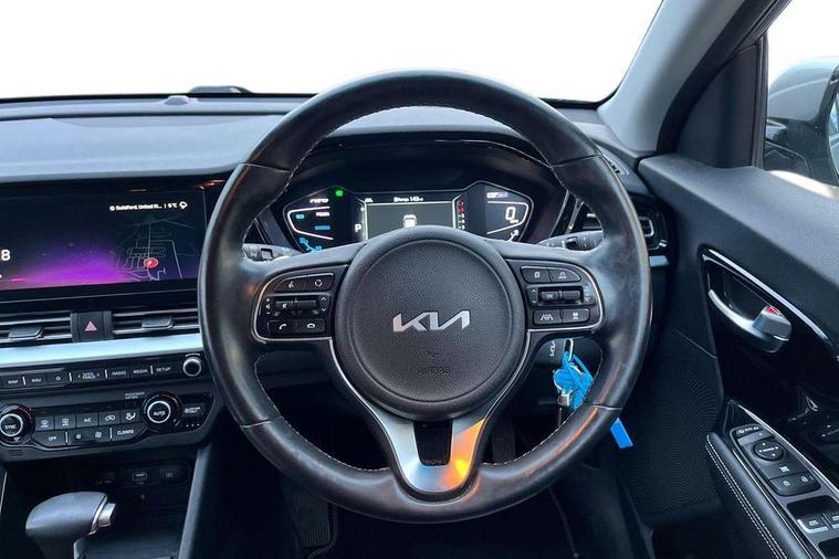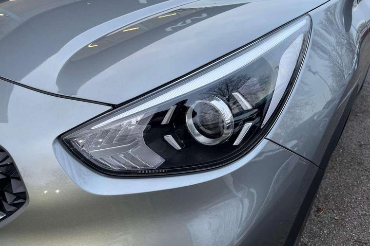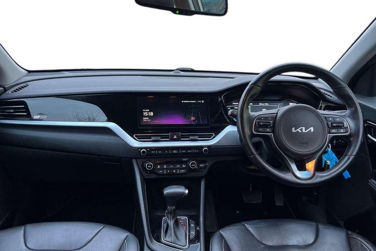 10.25" Touch screen satellite navigation with european mapping and traffic messaging channel, 7" full supervision cluster with TFT colour display, Adaptive smart cruise control function (SCC) with stop and go, Apple car play/Android Auto with voice control, Digital clock, Drive mode selector, Driver attention warning, Emergency call service, Emergency stop signalling system, Forward collision avoidance assist, Front parking sensors, Kia connected services featuring TomTom live, Lane Following Assist (LFA), Lane keep assist, Motor driven power steering, Rear parking sensors, Reversing camera, Speed limiter, Trip computer with distance/fuel consumption/average speed, UVO connect, Wireless Smartphone charger, 'Shark fin' mobile antenna, 6 speakers, Bluetooth with music streaming, DAB Radio with MP3, Steering wheel mounted controls, USB connection located in centre console, USB port, All round electric windows with drivers and front passenger auto up/down function, Auto dimming rear view mirror, Automatic defog system, Automatic headlight control system, Black beltline mouldings, Black side sills, Black wheel arch mouldings, Body colour bumpers, Body coloured/high gloss door mirrors, Chrome door handles, Driver's side wide angle mirror, Electrically folding/adjustable/heated door mirrors with LED indicators, LED daytime running lights, LED fog lights, LED rear combination lights, LED third brake light, Manual headlight levelling, Matt black radiator grille, Privacy glass - Rear windows and tailgate, Projector headlamps, Rain sensing front wipers, Rear side wing doors, Rear spoiler, Rear wiper, Roof rails, Solar glass, Variable front intermittent wipers, Waistline black paint, Welcome and follow-me home light functionality, 3 seat bench in 2nd row, 3 x passenger assist grips, 60/40 split/folding 2nd row of seats, 8 way electric adjustable drivers seat, All-round height adjustable headrests, Aluminium door scuff plates, Bulb type overhead console lamp with sunglasses case, Centre console storage box, Centre room lamp, Cupholders in rear armrest, Driver/passenger sunvisors with illuminated vanity mirrors, Drivers seat power lumbar support, Dual zone automatic air conditioning, Front and rear door storage, Front/rear centre armrests, Headlining in Light grey, Heated front seats, Heated steering wheel, High gloss black lower console trim, High gloss black steering wheel trim, Illuminated ignition key hole, Interior door lock/unlock function, ISOFIX Child seat top tethers and anchor fixings, Leather trimmed door armrests, Leather trimmed steering wheel, Leather trimmed steering wheel and gearshift, Leather upholstery, Luggage area lamp, Luggage area load cover, Luggage net with hooks, Paddle shifts, Passenger seat height adjuster, Satin finish inner door handles, Seatback pocket - driver, Seatback pocket - front passenger, Single front passenger seat, Tilt/telescopic adjustable steering wheel, Under floor storage box, Ventiliation ducts to rear compartment, Towing pack - Niro, 3 point seatbelts on all seats, ABS, Automatic unlocking of doors in case of impact, Drivers knee airbag, Electric parking brake with auto hold function, Electronic stability control, Front passenger airbag cut-off switch, Height adjustable front seatbelts, Hill start assist control (HAC), Manual child lock in rear doors, Traction control, Twin curtain airbags with roll over sensor, Twin front and side airbags, Tyre pressure monitoring system, Alarm system and engine immobiliser, Deadlocks, Locking wheel nuts, Remote central door locking with fold away key, Speed sensitive auto door locking, Visible vehicle identification number, High gloss black centre fascia, High gloss black door inserts, 18" Alloy wheels, Tyre mobility kit,