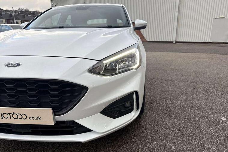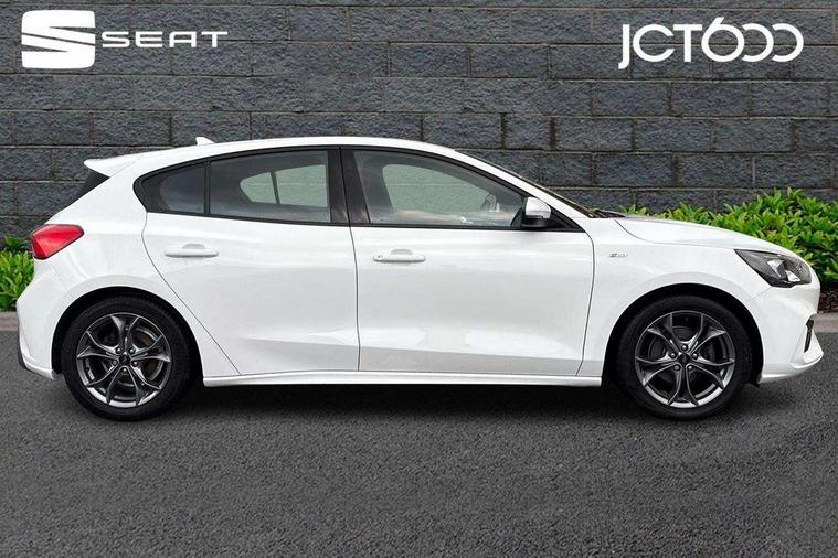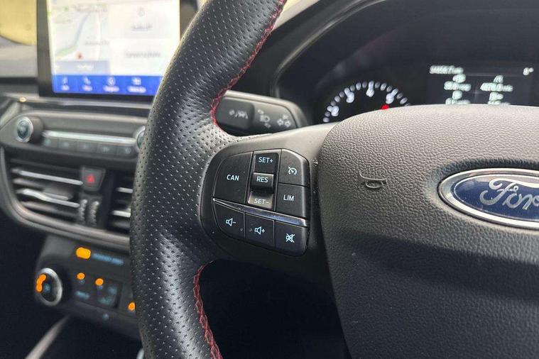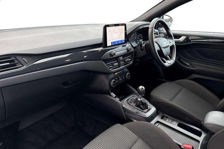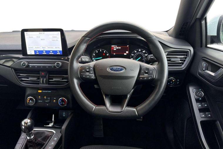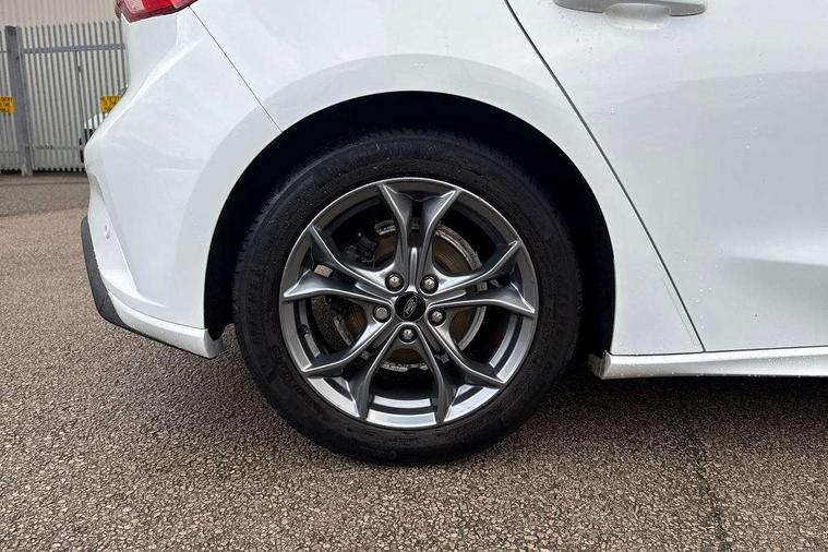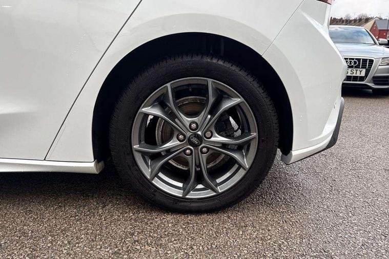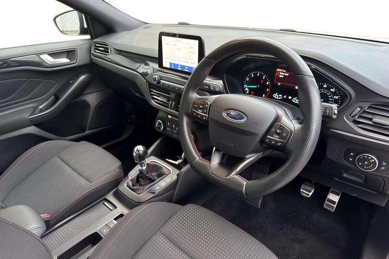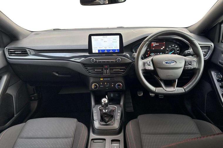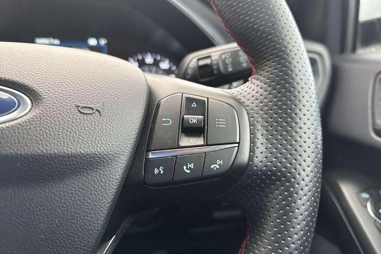 Bluetooth system, Digital clock, Easy fuel capless refuelling system, Eco mode, Ford pass connect, Ford SYNC 3 with 8" TFT touchscreen, and app link Android auto/Apple carplay, Intelligent speed assist, Lane keeping aid with lane departure warning, PAS, Selectable drive mode, Trip computer, Sports tuned suspension, 6 speakers, Aux input, 'Quickclear' heated windscreen/heated washer jets, Auto headlamps (on/off), Body colour large rear spoiler, Body colour side skirt, Body coloured bumpers, Body coloured door handles, Body coloured electrically operated and heated door mirrors with side indicators, Electrically operated front and rear windows with one touch opening and closing, Front variable intermittent wipers with electric wash, Halogen reflector headlamps, Heated rear window, LED daytime running lamp, LED front fog lamps with cornering function, Polished twin tailpipe, ST-Line upper and lower grille with full body styling kit and wing badges, Tailgate wash/wipe, 3 spoke flat bottomed leather steering wheel with red stitching, 60/40 split back and cushion rear seats with 2 height adjustable headrests, Alloy finish pedals, Aluminium gear knob, Centre console with armrest, Cloth upholstery with red stitching, Dark headliner, Driver's lumbar support, Front floor mats, Height adjustable front headrests, Isofix child seat preparation, Manual air conditioning, Reach + rake adjustable steering column, Rear centre headrest, ABS+Electronic Brake force Distribution, Auto hold function, Driver airbag, Electronic parking brake, Electronic stability control, Front and rear seatbelt reminder, Front inertia reel height adjustable seatbelts with pre-tensioners, Front passenger airbag, Front side airbags, Hill start assist, Passenger airbag deactivate switch, Post collision braking, Pre collision assist with autonomous emergency braking and pedestrian/cyclist detection, Side curtain airbags, Three rear inertia reel lap/diagonal seatbelts, Tyre pressure monitoring system, Keyless start with 'Ford Power' starter button, MyKey system, Remote central locking & engine immobiliser, Thatcham category 1 alarm, Contrast stitching - Red, 17" 5x2 spoke alloy wheels with rock metallic finish, Mini steel spare wheel,