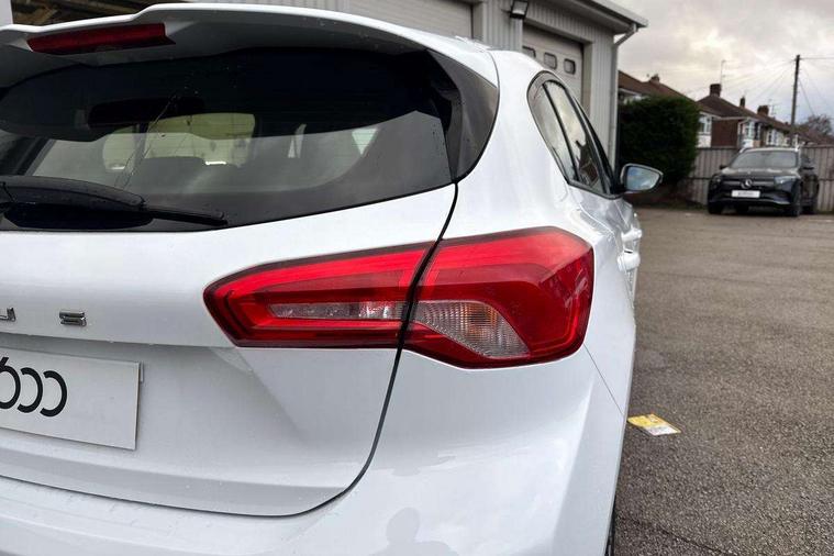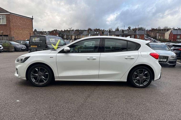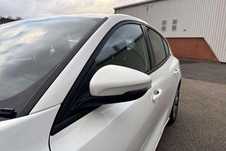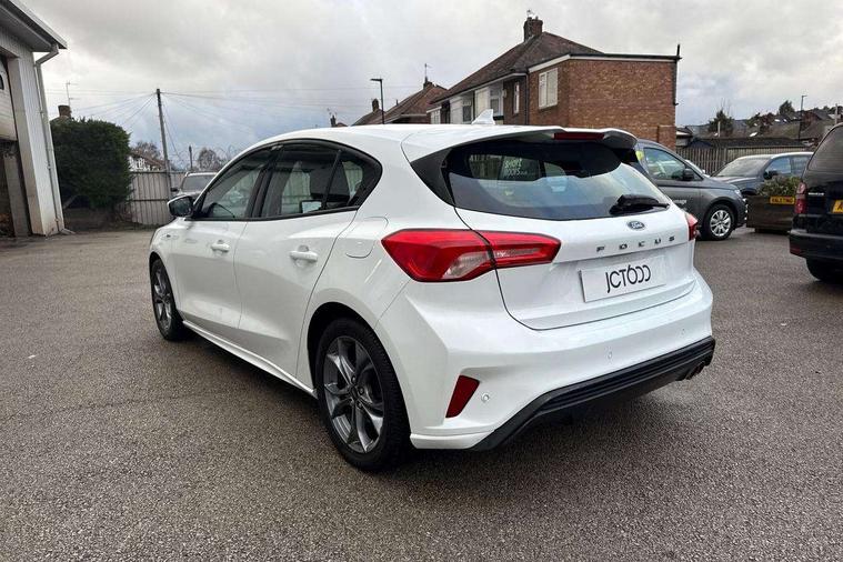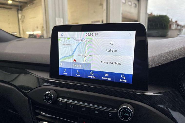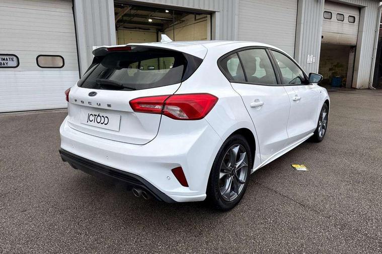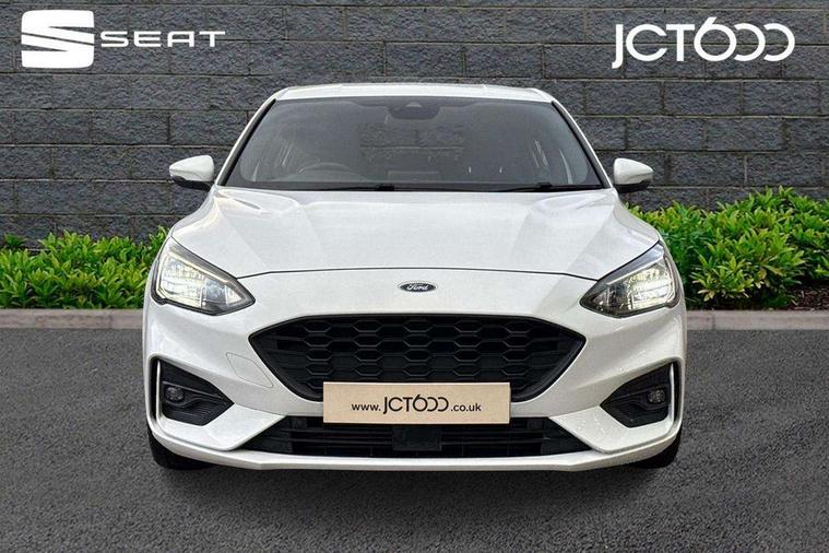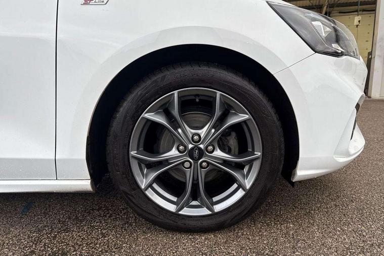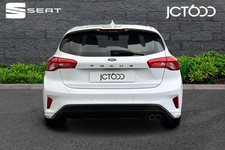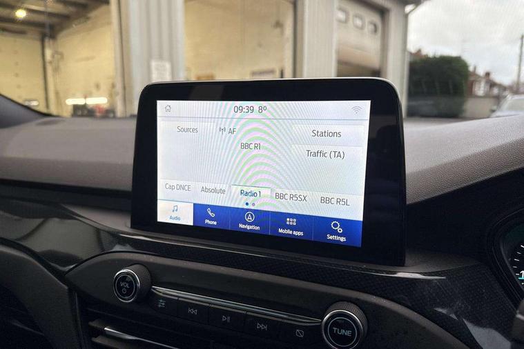 Bluetooth system, Digital clock, Easy fuel capless refuelling system, Eco mode, Ford pass connect, Ford SYNC 3 with 8" TFT touchscreen, and app link Android auto/Apple carplay, Intelligent speed assist, Lane keeping aid with lane departure warning, PAS, Selectable drive mode, Trip computer, Sports tuned suspension, 6 speakers, Aux input, 'Quickclear' heated windscreen/heated washer jets, Auto headlamps (on/off), Body colour large rear spoiler, Body colour side skirt, Body coloured bumpers, Body coloured door handles, Body coloured electrically operated and heated door mirrors with side indicators, Electrically operated front and rear windows with one touch opening and closing, Front variable intermittent wipers with electric wash, Halogen reflector headlamps, Heated rear window, LED daytime running lamp, LED front fog lamps with cornering function, Polished twin tailpipe, ST-Line upper and lower grille with full body styling kit and wing badges, Tailgate wash/wipe, 3 spoke flat bottomed leather steering wheel with red stitching, 60/40 split back and cushion rear seats with 2 height adjustable headrests, Alloy finish pedals, Aluminium gear knob, Centre console with armrest, Cloth upholstery with red stitching, Dark headliner, Driver's lumbar support, Front floor mats, Height adjustable front headrests, Isofix child seat preparation, Manual air conditioning, Reach + rake adjustable steering column, Rear centre headrest, ABS+Electronic Brake force Distribution, Auto hold function, Driver airbag, Electronic parking brake, Electronic stability control, Front and rear seatbelt reminder, Front inertia reel height adjustable seatbelts with pre-tensioners, Front passenger airbag, Front side airbags, Hill start assist, Passenger airbag deactivate switch, Post collision braking, Pre collision assist with autonomous emergency braking and pedestrian/cyclist detection, Side curtain airbags, Three rear inertia reel lap/diagonal seatbelts, Tyre pressure monitoring system, Keyless start with 'Ford Power' starter button, MyKey system, Remote central locking & engine immobiliser, Thatcham category 1 alarm, Contrast stitching - Red, 17" 5x2 spoke alloy wheels with rock metallic finish, Mini steel spare wheel,