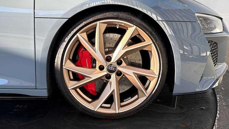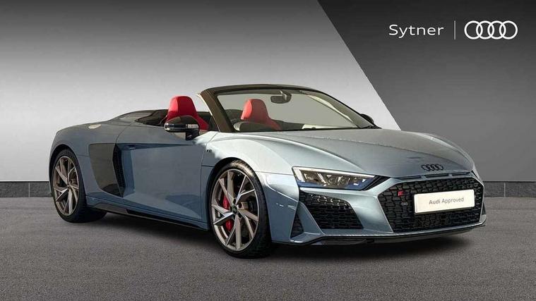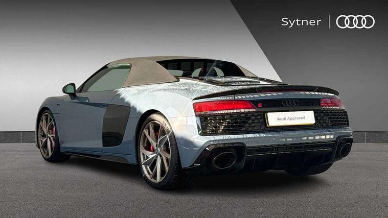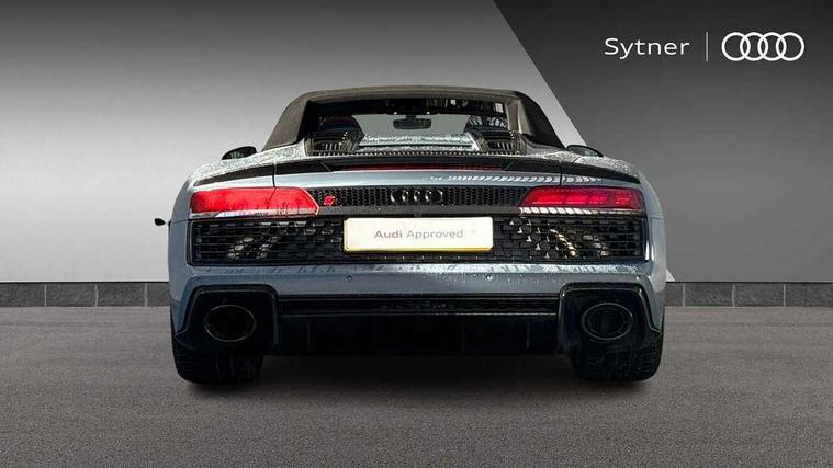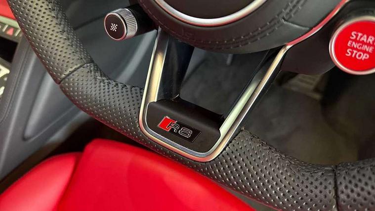 Audi connect, Audi drive select, Audi parking system plus with front and rear sensors, Audi phone box with wireless charging, Audi smartphone interface, Audi virtual cockpit, Bluetooth interface, Cruise control with speed above 18mph, Emergency call service, MMI navigation plus with MMI touch, PAS, Reversing camera, Service interval indicator, Start/Stop system with energy recuperation, Voice control system, 80 litre fuel tank, Audi cylinder on demand, S tronic transmission with hill hold assist, Sports suspension, Audi music interface with 2 USB ports with charge and data functions, Bang and Olufsen Sound System with loudspeakers in the head restraints, DAB Digital radio, 3rd brake light, Audi beam, Audi space frame, Auto dimming rear view mirror and frameless with light and rain sensor, Black mirrors, Electric front windows, Electrically adjustable, heated, folding and automatically dimming door mirrors with integrated LED indicator, Fixed rear lip spoiler in Gloss Carbon, Gloss black oval tailpipe trim, Gloss black radiator grille with R8 emblem, Heated rear window, High beam assist, LED headlights with dipped beam, daytime running lights, indicator and static turning light in LED technology, LED rear lights with dynamic rear indicators, Light and rain sensor, Rear boot, Sideblades in gloss carbon, Variable front intermittent wipers, 3 spoke flat bottomed multi-functional perforated performance leather steering wheel with 3 operating satellites, Deluxe automatic climate control air conditioning, Hood lining in black, Illuminated door sills with aluminium insert, Pneumatic seat backrest and side bolster adjustment, Seat heating, Single front passenger seat, Stainless steel pedals and footrest, Black styling pack - R8 Spyder, Gloss black styling pack - R8, Interior light pack - R8, ABS, Ceramic brakes in front with brake calipers in gloss red, Driver/front passenger airbag, EDL traction control, ESP, Front side airbags, Seatbelt monitoring, Tyre pressure warning light, Warning triangle and first aid kit, Wave brake discs, Advanced key with safelock, Anti theft alarm and immobiliser, Locking wheel bolts, Remote central locking, Belt loops, top section of centre console, centre armrest, door pull handle and speaker trim on front pass. side in fine Nappa leather seat up. colour, Door armrests and map compartments in fine Nappa leather in seat upholstery colour, Loudspeaker on drivers side in artificial black leather, Matt anthracite titanium finish inlays, Piano black lower inlays, Steering wheel impact absorber trim, lower part of centre console, door rails, rear panel rail and side panel trims in black Fine Nappa Leather, Upper and lower section of dashboard, cowl, monoposto, knee pad on the drivers side, airbag cover in black Fine Nappa Leather, Tool kit, Tyre repair kit,