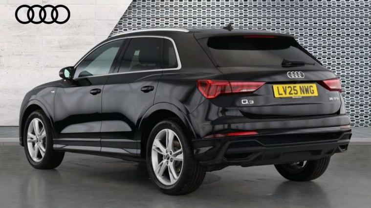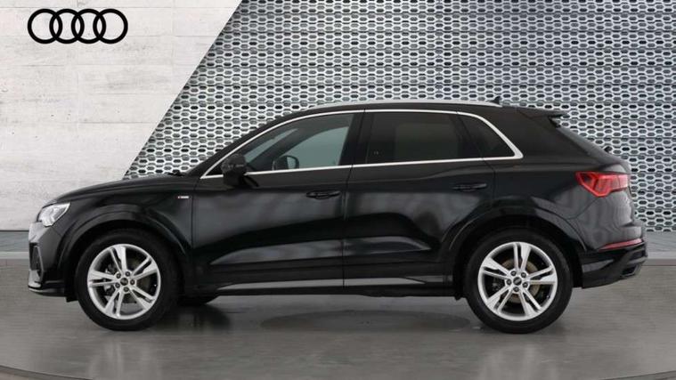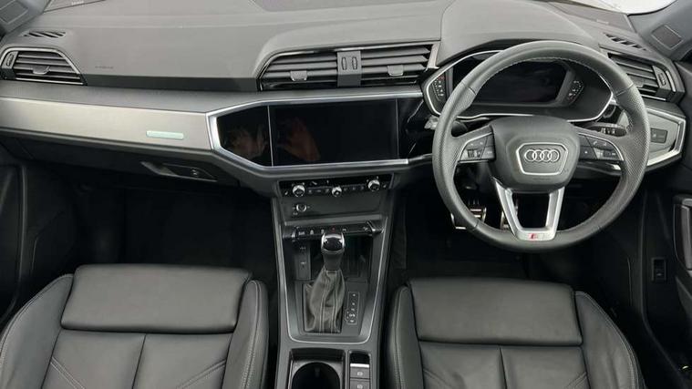 Amazon alexa Integration, Audi connect safety and service, Audi drive select, Audi lane departure warning, Audi Virtual Cockpit - 10.25" display, Bluetooth interface, Camera based traffic sign recognition, Distraction and Fatigue warning, Legal emergency call, MMI Navigation Plus with high resolution 10.1 inch touchscreen colour display, Power operated tailgate, Progressive steering, Service interval indicator, Smartphone interface includes wireless Apple carplay/Android Auto, Start stop system with recuperation, Voice control system with natural language interaction, Sports suspension, 2 USB-C ports with charge and data functions, 6 passive loudspeakers, DAB digital radio module, Acoustic windscreen, Aluminium roof rails, Aluminium window trim, Anthracite black radiator grille, Auto dimming door mirrors, Auto dimming frameless rear view mirror, Body colour front spoiler blade, Electrically folding, adjustable and heated door mirrors with integrated LED side indicators and kerb view function for passenger side, Front and rear electric windows, Front fog lights, Front side air inlets in matt platinum grey, Grille vertical bars in aluminium silver/Matt, High gloss black finish B and C pillars, LED Dynamic rear indicators, LED headlights with LED daytime running lights, LED rear lights, LED third brake light, Privacy glass dark tinted rear and rear-side windows (from B-pillar backwards), Rain and light sensors, Rear diffuser grille in grained matt black, Rear diffuser strip in matt anthracite black, Rear side wing doors, Rear wiper, S line badges on front wings, S line front and rear bumpers and side skirts in contrasting Manhattan grey paint finish, Side skirt insert in matt Platinium grey, Variable front intermittent wipers, 12V socket in rear centre console, 3 seat bench in 2nd row, 3 spoke leather multifunction steering wheel features S badging and grips in perforated leather with contrast stitching, 40:20:40 folding with manual adjustment for 60:40 forwards/backwards position and backrest angle, Adjustable rear seat bench/backrest with centre armrest and cupholder, Black cloth headlining, Dual zone electronic climate control, Electric lumbar support, Front and rear black floor mats with contrast stitching in rock grey, Front and rear headrests, Front centre armrest, Height and reach adjustable steering wheel, Illuminated door sill trims with S logo, ISOFIX child seat mounting for front passenger with airbag deactivation and outer rear seat including top tether attachment point for outer rear seats, Manual front seats with height adjustment, Perforated leather gearknob, Single front passenger seat, Stainless steel luggage compartment sill finisher, Stainless steel pedals, Twin leather upholstery with front sport seats + S embossing, Non smoking pack - Q3, 3x3 point rear seatbelts, 6 airbags - Driver, front passenger, curtain and side windows, Audi pre-sense front with pedestrain and cyclist recognition, Electrically operated child locks on rear doors, Electromechanical parking brake, Electronic stabilisation control including ABS, ASR and EDL, Front seatbelt reminder, Hill descent control, Hill hold assist, Pre sense basic, Seatbelt monitoring, Tyre pressure warning, Warning triangle and first aid kit, Anti theft wheel bolts, Immobiliser, Remote central locking, Thatcham approved category 1 anti theft alarm, Aluminium look interior elements, Dark matt brushed aluminium inlay, Detail dashboard around MMI touch colour display in glass look, black with surround in aluminium look, Leatherette door armrest,