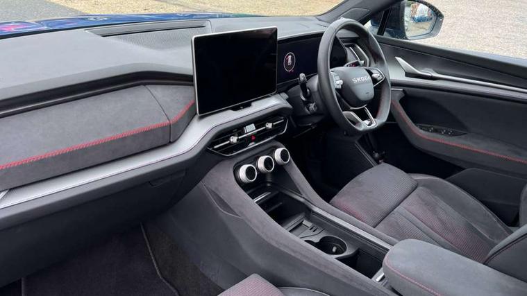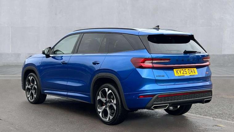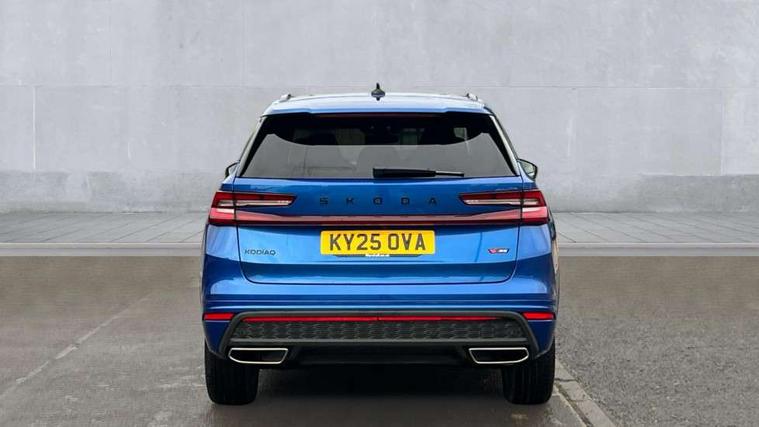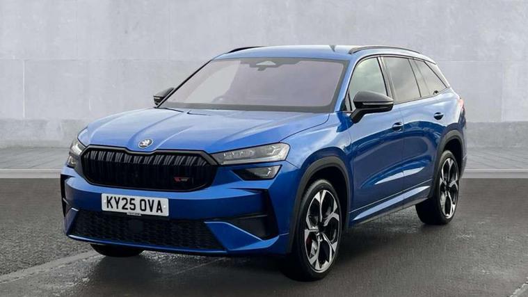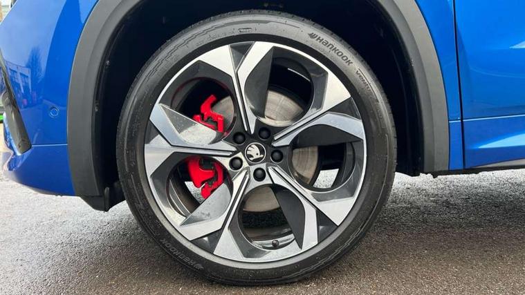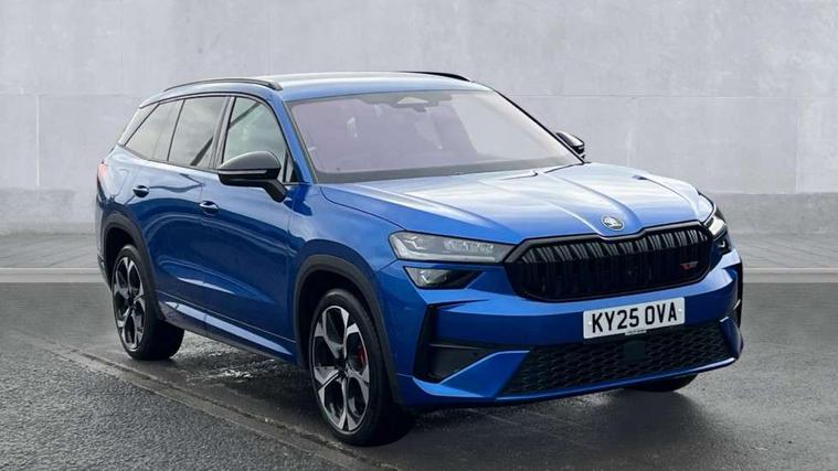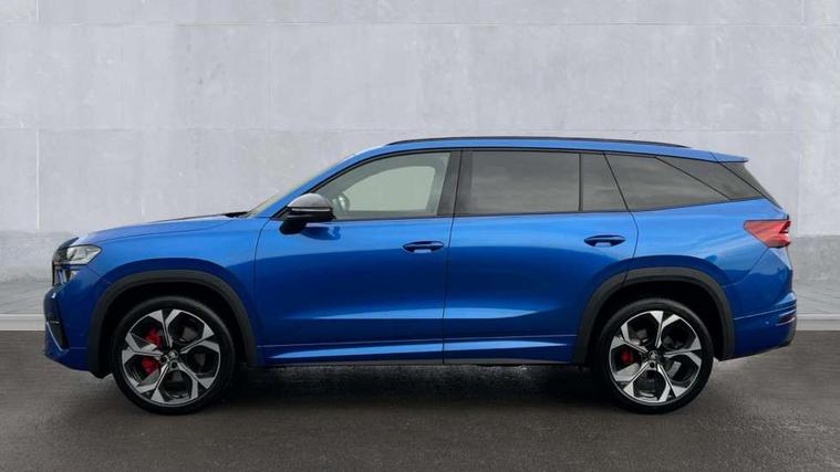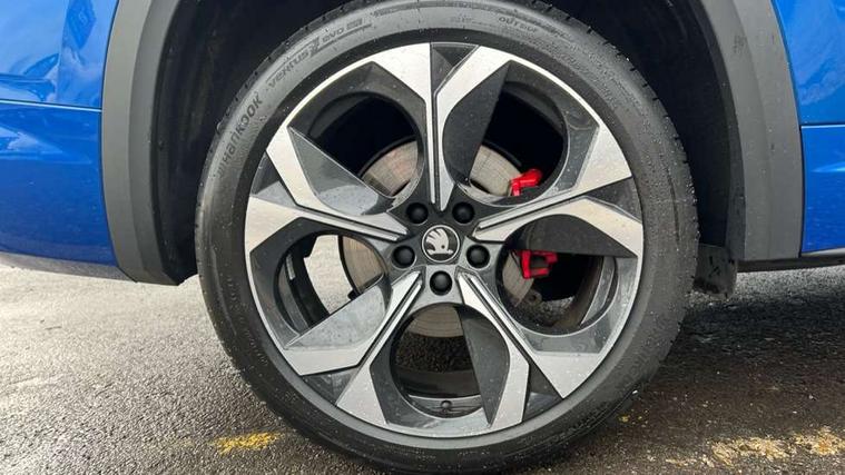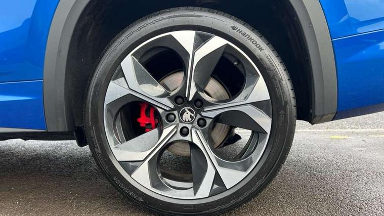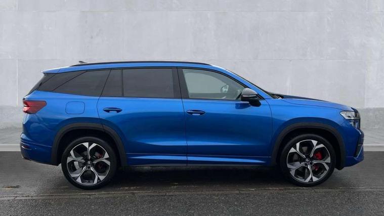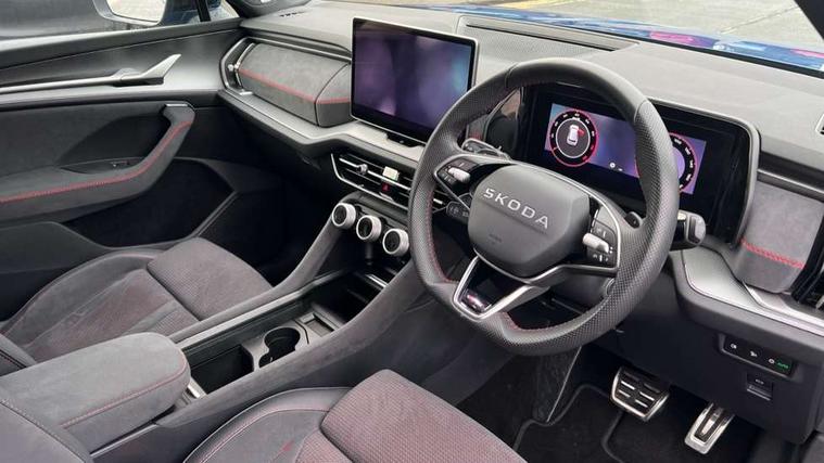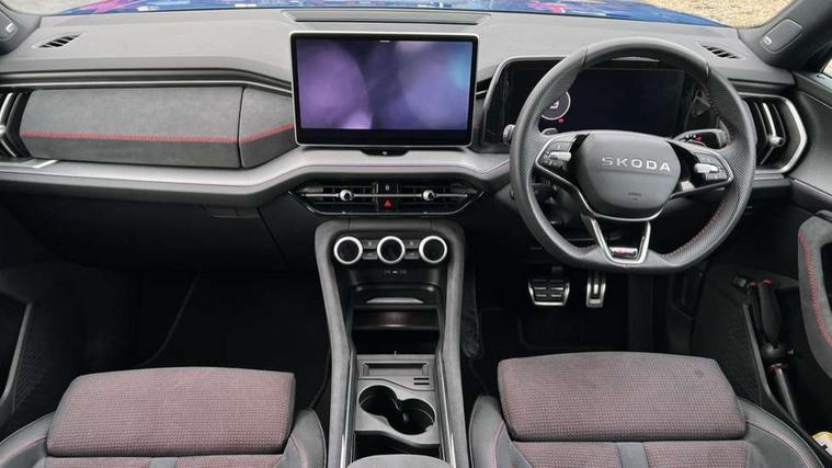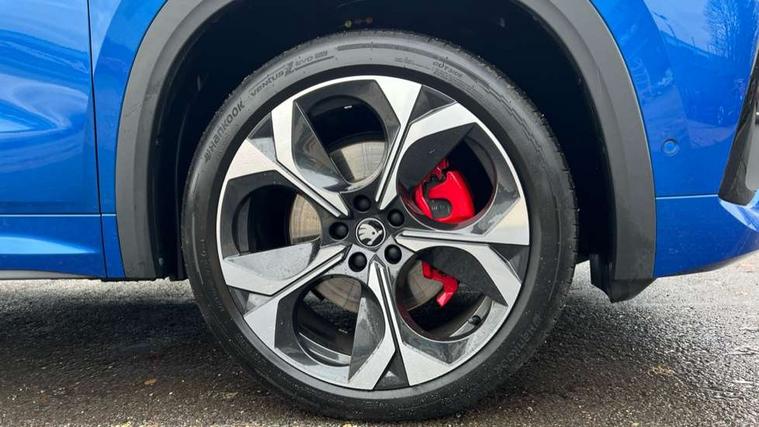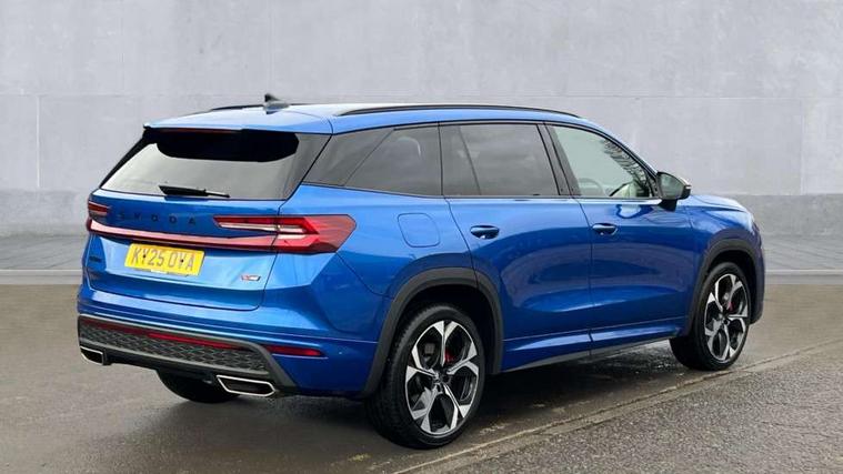 13" satellite navigation touchscreen display, Blind spot detection with door exit warning, Bluetooth system, ChatGPT functionality, Driver alert - Fatigue and drowsiness monitor, Dry display cleaner, Emergency call, Front and rear parking sensors, Front cross traffic assist, Lane assist, Off road modes, PAS, Rear traffic assist, Tailgate unlocking from outside, Traffic sign recognition, USB C Port x 2 in front centre console, Virtual Cockpit - 10.25" digital display, Voice control system, Wireless charging for two smartphones (15W) with cooling function, Wireless SmartLink for Apple CarPlay and Android Auto, Stop/start function, 2x USB-C in the rear, DAB Digital radio, Dynamic sound booster, Aero front windscreen wipers with intermittent function, Auto dimming rear view mirror, AWL (all weather lighting) and all weather light with cornering function, Black roof rails, Black vRS styling including front grille surround and upper part of window surround, Black wheel arch surrounds, Body colour door handles, Cornering light and poor weather light, Electric folding /adjustable/separted heated/folding door mirrors, auto dimming with boarding sports and memory function, Electric front and rear windows, Exterior black decorative trims, Gloss black door mirrors, Gloss black window frame and D pillar, Heat insulating glass in windshield, Heated rear window, Ice scraper in fuel tank cap, LED daytime running lights, LED third brake light in rear spoiler, Light assistant with automatic headlight control and coming home feature, Logo projection in door mirrors, Privacy glass, Rear roof spoiler, Rear side wing doors, Rear window wiper, Red decorative strip between rear LED lights, Safety reflectors on front and rear doors, Tailgate lettering in Black, Unique dark chrome design logo on alloy wheels, vRS badging on front grille and tailgate, vRS front and rear bumpers, vRS rear diffuser and visible tailpipe in stainless steel, Window control switches with black trim, Windscreen wipers with rain sensor, Without engine designation, 1.5l bottle holder points in all door, 1x centre rear reading light, 2 seat bench in 3rd row, 3 configurable smart dials with 32mm coloured display, 3 seat bench in 2nd row, 4 foldable roof handles with rear coat hooks, Aluminium pedals, Ambient interior lighting - Dashboard, front-door stowage compartments, front and rear door panels and footwell lighting, Automatic gear selector on steering column, Chrome interior door handles, Driver/front passenger reading lights, Fabric headlining, Fixed bench 40:60:40 split folding backrests, Front and rear floor mats, Front centre armrest with jumbo box storage compartment, cup holder and 12V socket, Front sport seats, Height adjustable front headrests, Interior black decorative trims, Isofix child seat fittings in outer middle row rear seats and front passenger with top tether, Manually adjustable steering column, Pollen filter, Rear centre armrest with cupholders, Rear seat boot backrest release, Single front passenger seat, Skoda lettering on steering wheel, Storage pocket including mobile phone pockets on the backs of the front seats, Sunvisors with illuminated vanity mirrors, Three rear height adjustable headrests, Ticket holder on A Pillar, Tri zone climate control, Umbrella in door panel x1 made from sustainable materials, Upper and lower glovebox with card holder and coin compartment, USB C port by rear view mirror for charging only (15W), Acoustic package - Kodiaq, Convenience plus pack - Kodiaq SE L/Sport Line/vRS, Light and view plus package - Kodiaq, Performance package - Kodiaq vRS, Simply clever cargo package - Kodiaq, Auto door release and activation of warning lights in the event of an accident, Driver and front passenger airbag with knee airbag and front passenger airbag deactivation, Electric child locks, Electronic parking brake, ESC (incl. ABS+EMD+MSR+ASR+EDL+HBA+DSR+RBS+ESBS+MCB+TSA+XDS), Front assist with braking reaction to vehicles, pedestrians and cyclists, Front disc brakes, Fuel cut off safety device, Height adjustable front 3 point seatbelts + pretensioners, Hill hold assist, Junction assist with automatic emergency braking, Rear disc brakes, Red brake calipers, Safety vest holder in door, Seat belt reminder for all seats, Three point rear seat belts, Two tone horn, Tyre pressure monitor, Alarm with interior monitoring and tilt sensor with safe function, Anti-theft wheel bolts, Immobiliser, Remote central locking with 2 keys, 20" Elias black polished alloy wheel,
