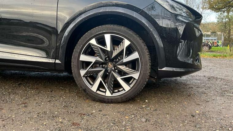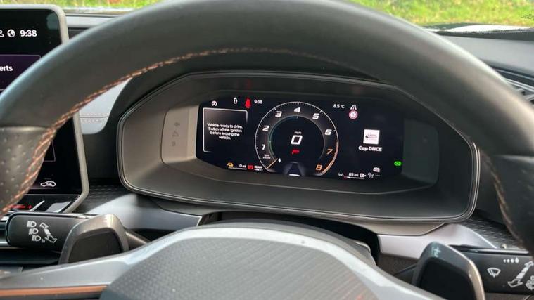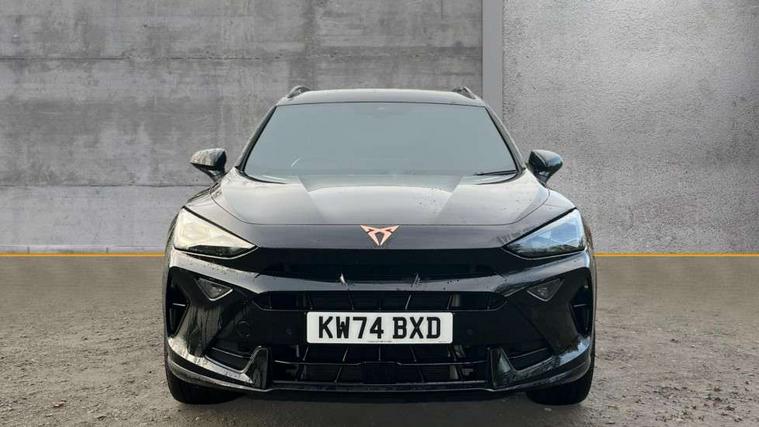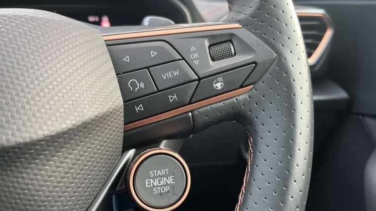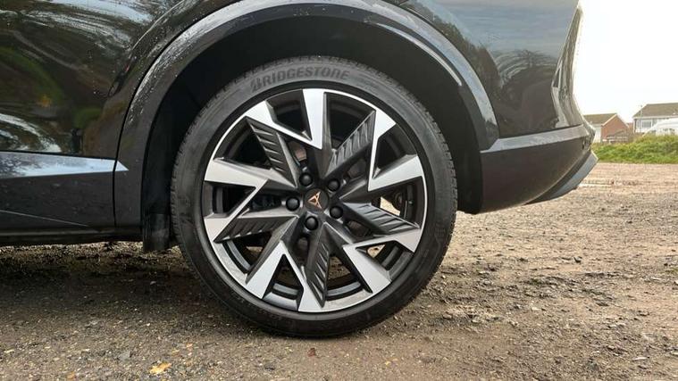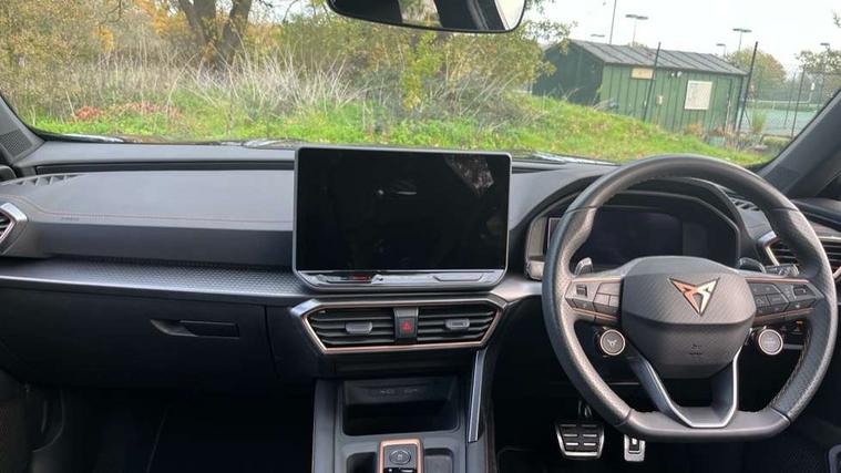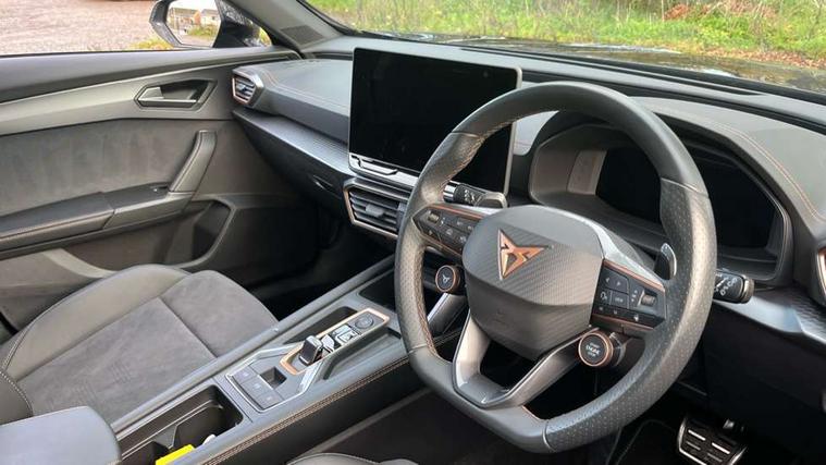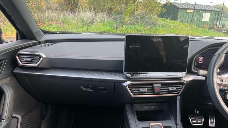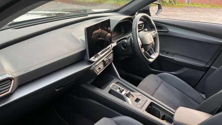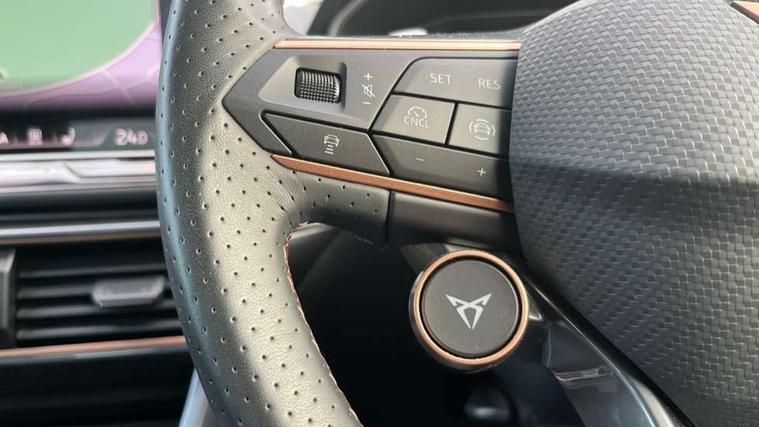 10.25" digital cockpit and configurable dashboard, Adaptive cruise control with follow-to-stop and speed limiter, Advanced driver alert system, Dynamic chassis control with driving profile selection (Comfort, Sport, CUPRA, Individual), Dynamic road sign display, Emergency steering support with turn assist, Forward collision warning with automatic braking, Front and rear parking sensors, Full link phone integration, Lane assist, Rear view camera, RPM, trip computer, outside temp gauge, instrument light brightness, low fuel warning light, lights on reminder, gearshift indicator, Service interval indicator, Speed sensitive power steering, Start/stop system with regenerative braking, Virtual pedal and electric tailgate, Voice control system, Wired Android Auto, Wireless apple carplay, Wireless phone charger, 10 amp mode 2 charging cable, 32 amp mode 3 charging cable, Adaptive chassis control with continuous operation, CUPRA sport suspension, Electronic locking differential and dynamic traction support, 2 front and 2 rear USB type C sockets, Media system with navigation, 12.9" touchscreen display, voice control, DAB, steering wheel mounted controls, Auto dimming rear view mirror, Body colour door handles, Body coloured bumpers, Dark grey wing mirror, Daytime running light with automatic headlight control and coming home feature, Door panel ambient lighting, Dynamic headlight range control, Electric front/rear windows, Electrically adjustable heated and folding door mirrors with memory function, Gloss black roof rails and window surrounds, High beam assist, LED 3rd brake light, LED front fog lamps with cornering function, LED Taillights with dynamic indicator, Matrix LED headlights with multifunction camera, Rain sensing wipers, Rear diffuser with copper simulated exhaust pipes, Rear fog lights, Rear side wing doors, Rear wash/wipe, Tinted rear windows, Welcome lights (within exterior mirror housing), 12V socket, 2 front and 2 rear reading lights, 3 seat bench in 2nd row, 60/40 split rear bench seat with armrest and mechanical seat release, Black headlining, Black interior roof lining, Cupra sports pedals, Dust/pollen filter, Electrically adjustable front seats with lumbar support and memory function, Front and rear head restraints, Front centre armrest, Heated front seats, Heated supersports multifunction leather steering wheel with satellite buttons and gear shift paddles, Height/reach adjust steering wheel, Illuminated aluminium doorsteps, Illuminated interior front door sills, Illuminated sunvisor with mirror, Isofix, Leather dashboard, door insert and side trim panel, LED smart wraparound lighting, PVC/Dinamica microfiber upholstery + bucket seats, Satellite steering wheel, Single front passenger seat, Storage pockets on rear of front seats, Three zone climate control with control panel in rear, 3 point seatbelts on all rear seats, ABS, Brake control system - ESC and brake booster, Child proof door locks, Driver and front passenger airbags with front passenger airbag de-activation, Electronic parking brake, Front and rear disc brakes, Front side curtain airbags, Hill hold control, Public e-call, Seat belt reminder for front and rear seats, Tyre pressure monitoring system, Anti theft alarm system, KESSY Advanced - Keyless start, keyless entry with SAFELOCK, Locking wheel bolts, Copper and aluminium interior detailing, 19" Sandstorm machined sport black and silver alloy wheels, Breakdown and tool kit,