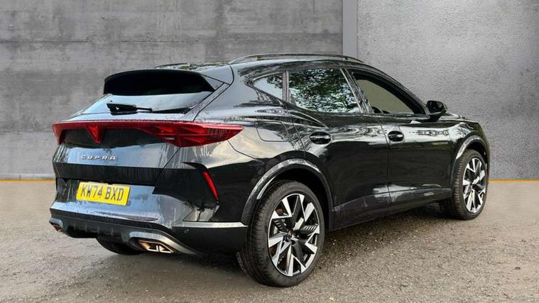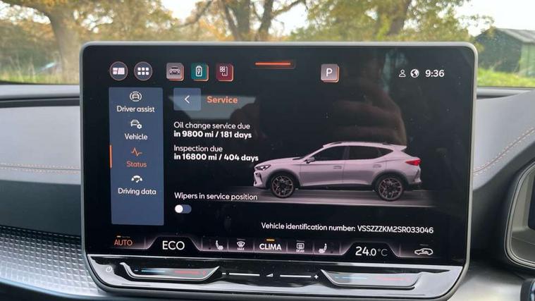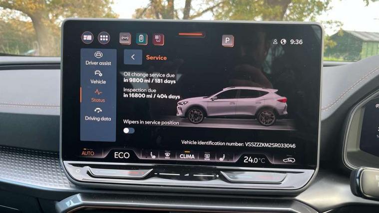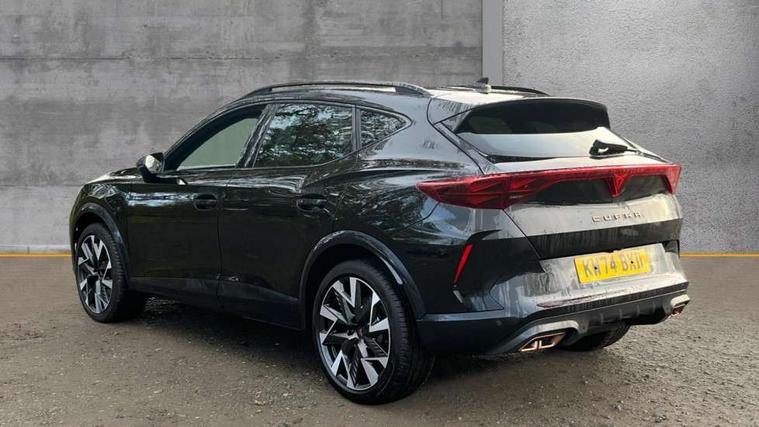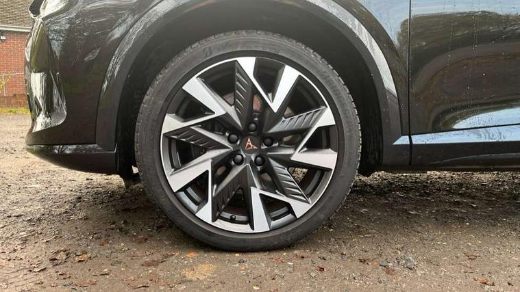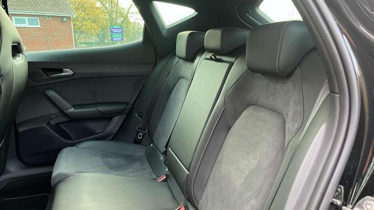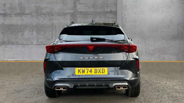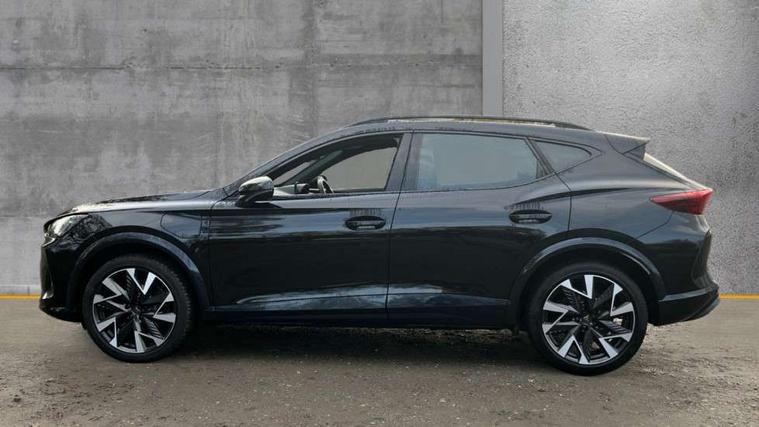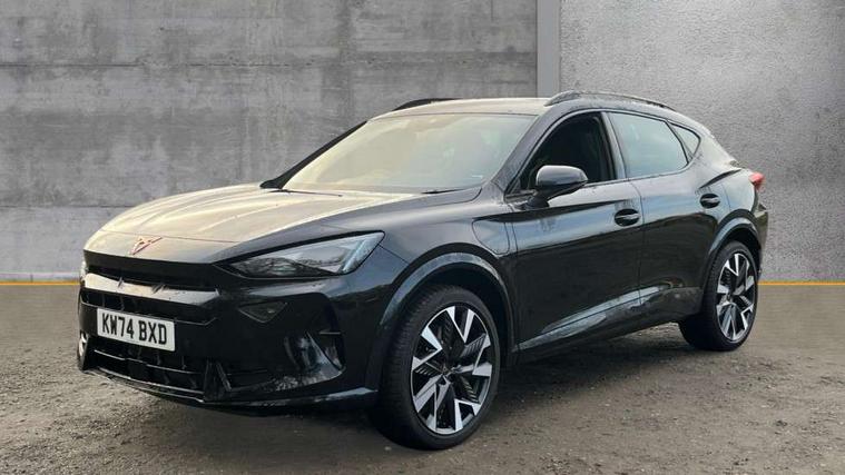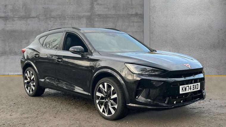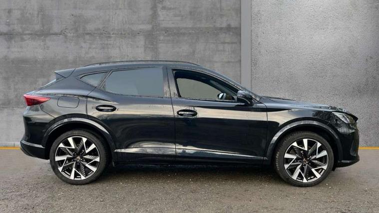 10.25" digital cockpit and configurable dashboard, Adaptive cruise control with follow-to-stop and speed limiter, Advanced driver alert system, Dynamic chassis control with driving profile selection (Comfort, Sport, CUPRA, Individual), Dynamic road sign display, Emergency steering support with turn assist, Forward collision warning with automatic braking, Front and rear parking sensors, Full link phone integration, Lane assist, Rear view camera, RPM, trip computer, outside temp gauge, instrument light brightness, low fuel warning light, lights on reminder, gearshift indicator, Service interval indicator, Speed sensitive power steering, Start/stop system with regenerative braking, Virtual pedal and electric tailgate, Voice control system, Wired Android Auto, Wireless apple carplay, Wireless phone charger, 10 amp mode 2 charging cable, 32 amp mode 3 charging cable, Adaptive chassis control with continuous operation, CUPRA sport suspension, Electronic locking differential and dynamic traction support, 2 front and 2 rear USB type C sockets, Media system with navigation, 12.9" touchscreen display, voice control, DAB, steering wheel mounted controls, Auto dimming rear view mirror, Body colour door handles, Body coloured bumpers, Dark grey wing mirror, Daytime running light with automatic headlight control and coming home feature, Door panel ambient lighting, Dynamic headlight range control, Electric front/rear windows, Electrically adjustable heated and folding door mirrors with memory function, Gloss black roof rails and window surrounds, High beam assist, LED 3rd brake light, LED front fog lamps with cornering function, LED Taillights with dynamic indicator, Matrix LED headlights with multifunction camera, Rain sensing wipers, Rear diffuser with copper simulated exhaust pipes, Rear fog lights, Rear side wing doors, Rear wash/wipe, Tinted rear windows, Welcome lights (within exterior mirror housing), 12V socket, 2 front and 2 rear reading lights, 3 seat bench in 2nd row, 60/40 split rear bench seat with armrest and mechanical seat release, Black headlining, Black interior roof lining, Cupra sports pedals, Dust/pollen filter, Electrically adjustable front seats with lumbar support and memory function, Front and rear head restraints, Front centre armrest, Heated front seats, Heated supersports multifunction leather steering wheel with satellite buttons and gear shift paddles, Height/reach adjust steering wheel, Illuminated aluminium doorsteps, Illuminated interior front door sills, Illuminated sunvisor with mirror, Isofix, Leather dashboard, door insert and side trim panel, LED smart wraparound lighting, PVC/Dinamica microfiber upholstery + bucket seats, Satellite steering wheel, Single front passenger seat, Storage pockets on rear of front seats, Three zone climate control with control panel in rear, 3 point seatbelts on all rear seats, ABS, Brake control system - ESC and brake booster, Child proof door locks, Driver and front passenger airbags with front passenger airbag de-activation, Electronic parking brake, Front and rear disc brakes, Front side curtain airbags, Hill hold control, Public e-call, Seat belt reminder for front and rear seats, Tyre pressure monitoring system, Anti theft alarm system, KESSY Advanced - Keyless start, keyless entry with SAFELOCK, Locking wheel bolts, Copper and aluminium interior detailing, 19" Sandstorm machined sport black and silver alloy wheels, Breakdown and tool kit,