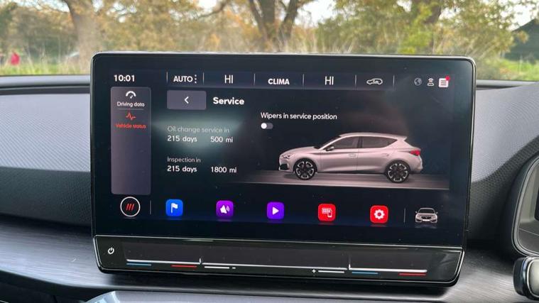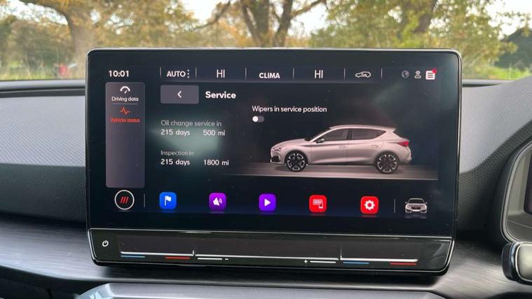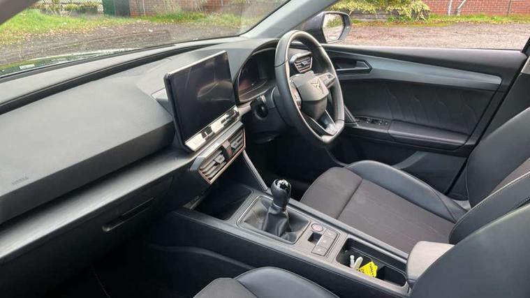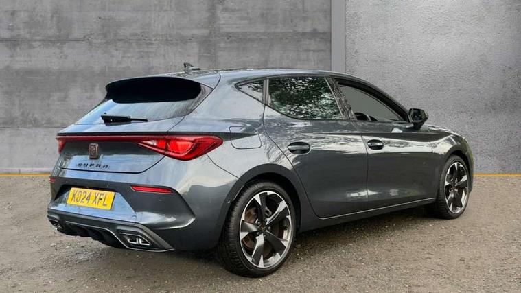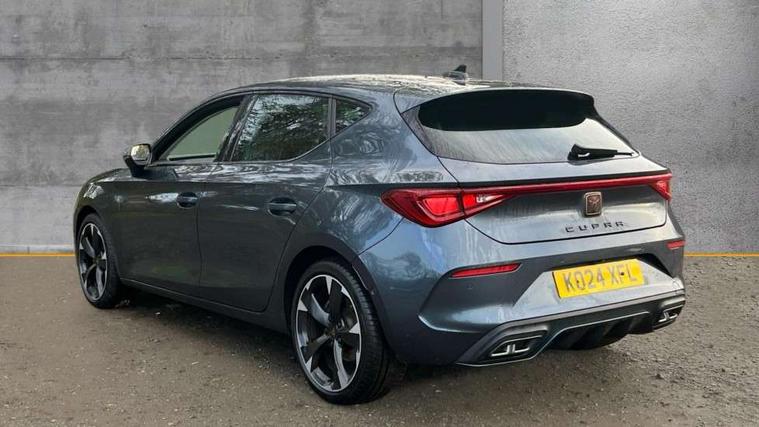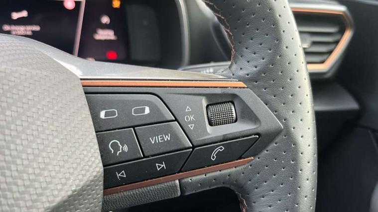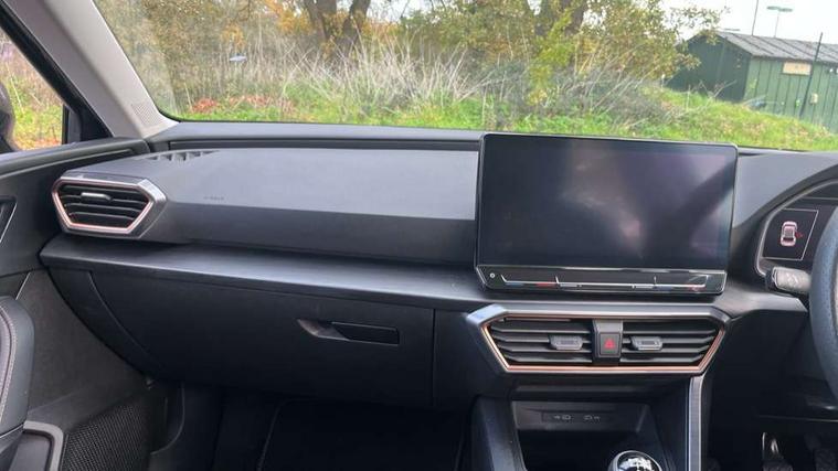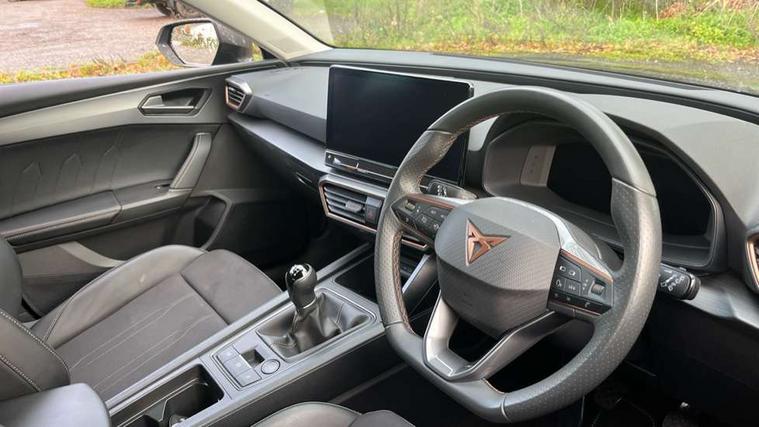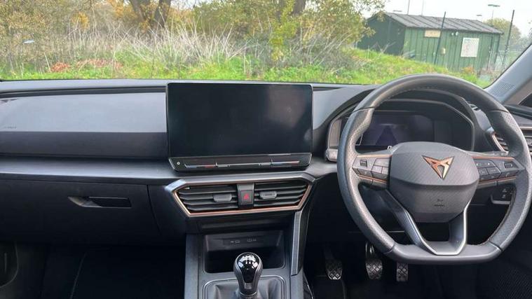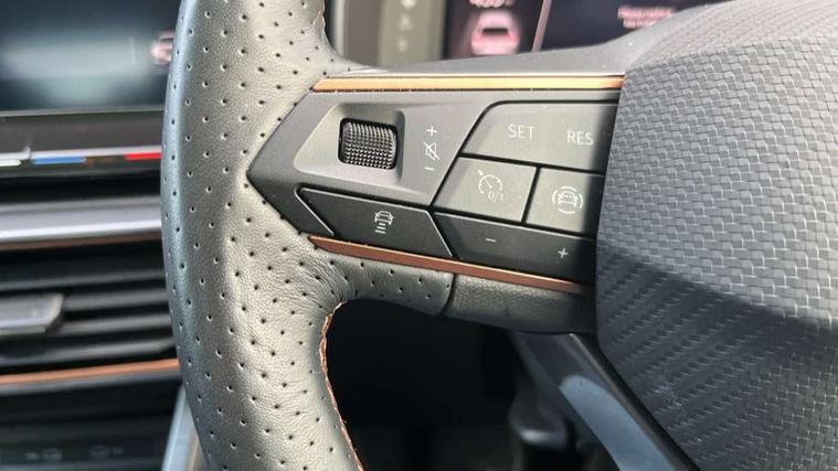 CUPRA drive profile selection with (Comfort/Sport/Individual), throttle response and gearshift mode, Digital cockpit, E-call, Electro mechanical speed sensitive power steering, Four x USB Type C ports (2 in front and 2 in rear), Front assist with forward collision warning braking reaction to vehicles, pedestrians and cyclists, Full link smartphone integration with Mirror Link, wireless Apple CarPlay and wired Google Android Auto, Lane assist, Lockable tailgate, Park assist (inc front/rear parking sensors), Rear view camera, RPM, trip computer, outside temp gauge, instrument light brightness, low fuel warning light, lights on reminder, gearshift indicator, Service interval indicator, Start/stop system with regenerative braking, Wireless phone charger, Sports suspension, Auxiliary input socket, Auto dimming rear view mirror, Body colour door handles, Body coloured bumpers, Cupra sports bumpers, Dark tinted rear windows, Electric front/rear windows, Electrically adjustable, heated and folding door mirrors, LED front fog lamps with cornering function, LED headlights with dynamic turn signals, tail lights, rear fog lights with rear coast to coast lighting, Rain sensing wipers, Rear diffuser with twin exhaust pipe on each side, Rear side wing doors, Rear wash/wipe, Separate daytime running light with automatic headlight control and coming home feature, Third brake light, 12v power supply in centre console, 3 seat bench in 2nd row, 5 headrests, 60/40 split rear bench seat with armrest, Ambient lighting with glovebox, footwell and single monocolour, Cupra Leather flat bottomed, perforated steering wheel, Driver/passenger manual seat height adjustment, Folding boot cover, Front and rear reading lights X 4, Front centre armrest, Front seats manual lumbar adjustment, Grey headlining, Height/reach adjust steering wheel, Illuminated interior front door sills, ISOFIX points in outer rear seats with top tether anchorage points, Jack and tool kit, PVC/Cloth upholstery with copper stitching, Single front passenger seat, Sports seats, Sunvisors with illuminated mirror, Three zone climate control, Media system plus with navigation pack - Leon Cupra, Safety and driving pack (M) - Cupra leon, 3 point seatbelts on all rear seats, ABS, Brake control system - ESC and brake booster, Child proof door locks, Cupra black brake calipers, Driver and front passenger airbags with front passenger airbag de-activation, front side and curtain airbags, Electronic parking brake, Extended safety system - seat belt tensioner, window closure and hazard lights, Hill hold control, Rear disc brakes, Seat belt reminder for front and rear seats, Tiredness recognition system, Tyre pressure monitoring system, Anti theft alarm system with interior monitoring in cab, backup horn and towing protection, KESSY Advanced - Keyless start, keyless entry, Locking wheel bolts, Chrome and copper interior detailing, 18" Machined sport black and silver alloy wheels with 92Y tyres,