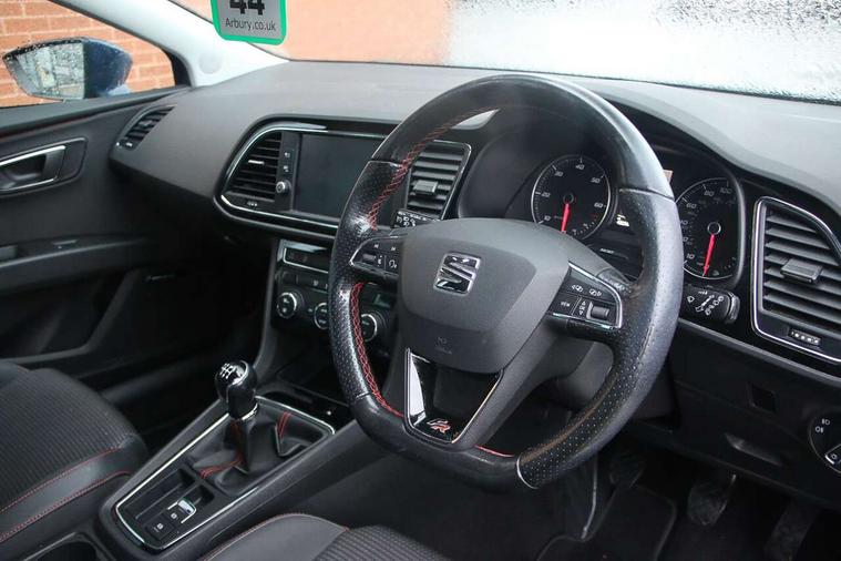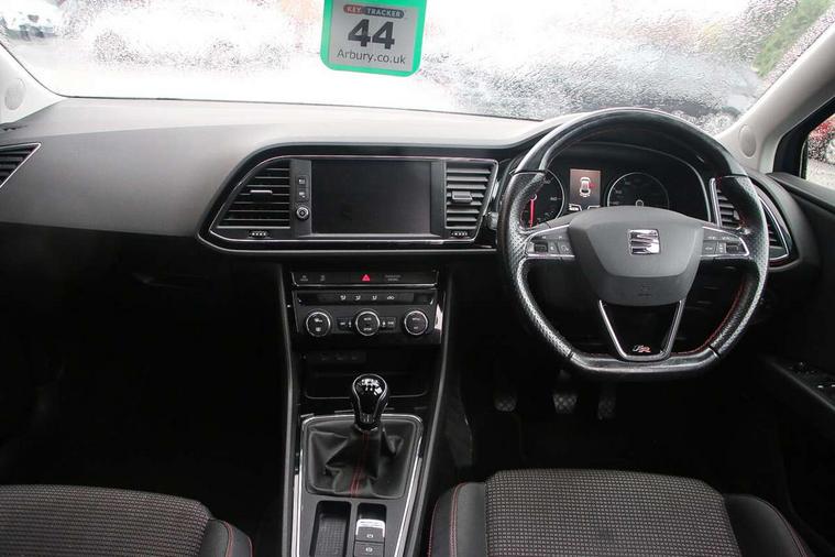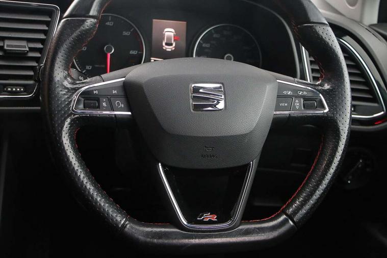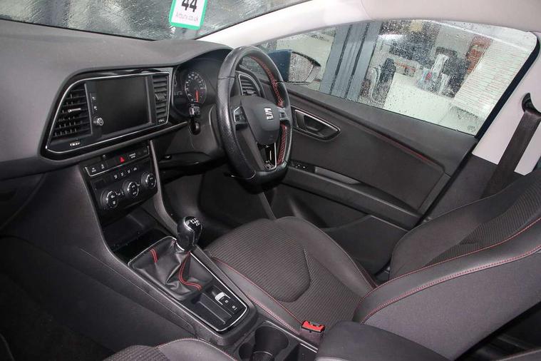 'Lights On' Reminder warning buzzer, 8" touch screen, Bluetooth Handsfree Phone Connection, Low fuel warning light, Outside temperature gauge, Rear parking sensors, Remote fuel flap release, SEAT Drive profile, SEAT logo boot release, Service interval indicator, Trip computer, Voice control system, XDS electronic differential lock, 2 USB ports, 2 USB sockets in rear, 2x SD card slot, Auxiliary input socket, Bluetooth audio streaming, DAB Digital radio, Radio/CD + MP3, Steering wheel mounted audio/phone controls, Aluminium front door sills, Black grille with chrome surround, Body colour door handles, Body coloured bumpers, Body coloured door mirrors, Dark tinted rear windows, Electric adjustable/heated/folding door mirrors, Electric front/rear windows with one touch/auto up/down, Electric headlamp adjustment, High gloss black finish B and C pillars, LED daytime running lights, LED front fog lights, LED Headlights, LED indicators in door mirrors, LED number plate light, LED tail lights, Rear wash/wipe, Reverse activated kerb-view adjustment on passenger's door mirror, Twin exhaust pipes, 12v power point in centre console, 3 height adjustable rear headrests, 60/40 split folding rear seat, Active head restraints, Additional heating and ventilation outlet in rear of centre console, Boot net, Chrome loading sill, Double boot floor, Driver seat height adjust, Driver seat lumbar adjustment, Driver/passenger sunvisors with illuminated vanity mirrors, Dual zone climate control, Dust/pollen filter, Front adjustable head restraints, Front armrest with storage box, Front cupholders x 2, Front seat and rear pockets, Front sports seats, Front/rear floor mats, Height/reach adjust steering wheel, Illuminated boot, Illuminated door sills, Illuminated glovebox, Instrument lighting with brightness control, Leather handbrake, Luggage compartment cover, Luggage tie-down hooks, Passenger seat height adjuster, Passenger seat lumbar adjust, Perforated leather steering wheel with red stitching + gear knob, Rear top tether child seat ISOFIX attachment, Rear window curtains, Storage boxes under front seats, 3 point seatbelts on all rear seats, ABS + traction control, Active pedestrian safety system, Child proof door locks, Collision mitigation braking system, Curtain airbags, Driver/Front Passenger airbags, Drivers knee airbag, Electronic parking brake with auto hold, ESP+EBA, Front assist including city emergency braking, Front seatbelt pretensioners, Front Seatbelt warning, Front side airbags, Hill hold control, Passenger airbag deactivation system, Tyre pressure monitoring system, 2 folding remote keys with window open/close function, Engine immobiliser, Locking wheel bolts, Remote central locking + deadlocks, Volumetric alarm with back up horn, Chrome interior trim,