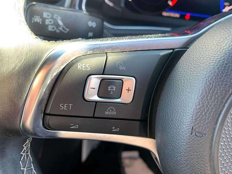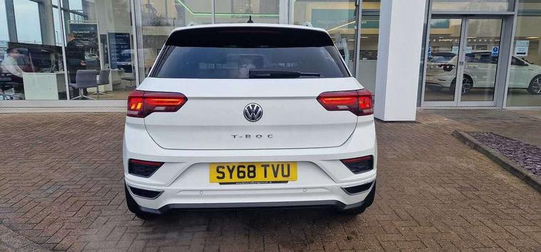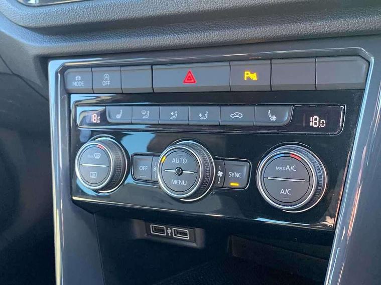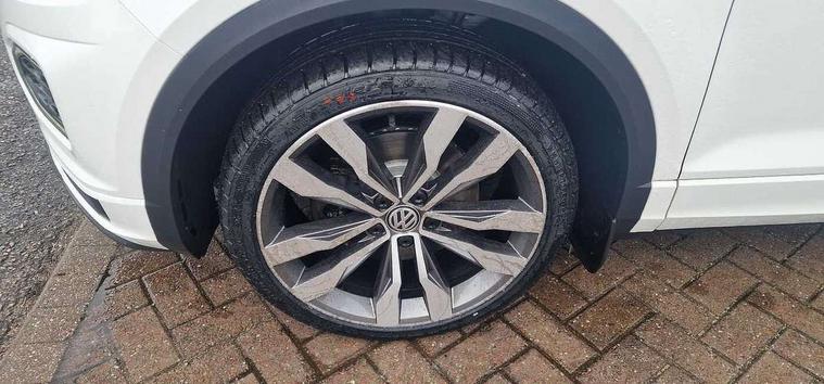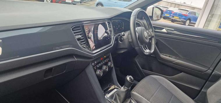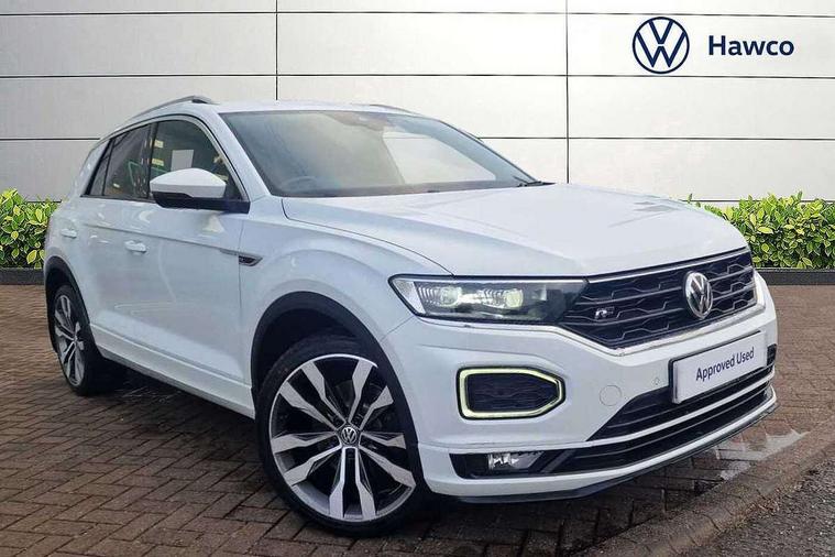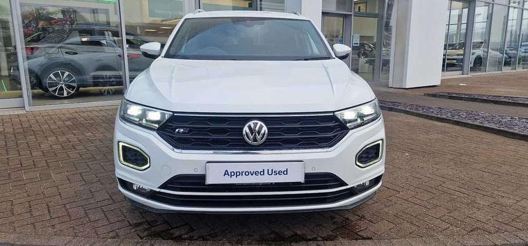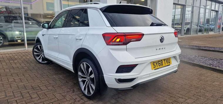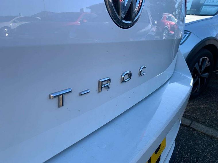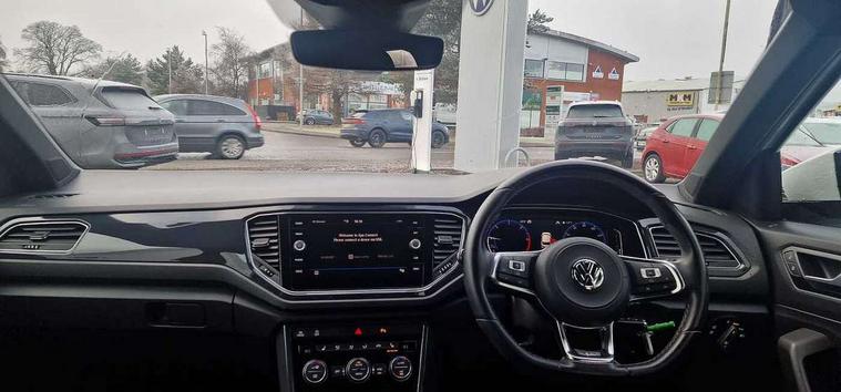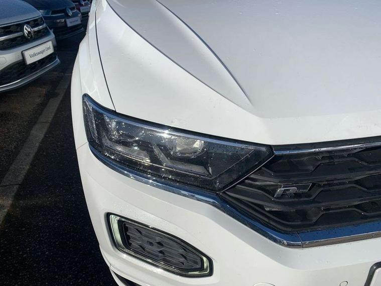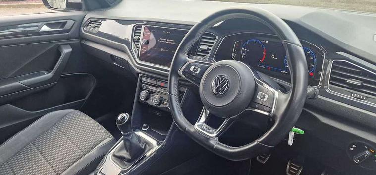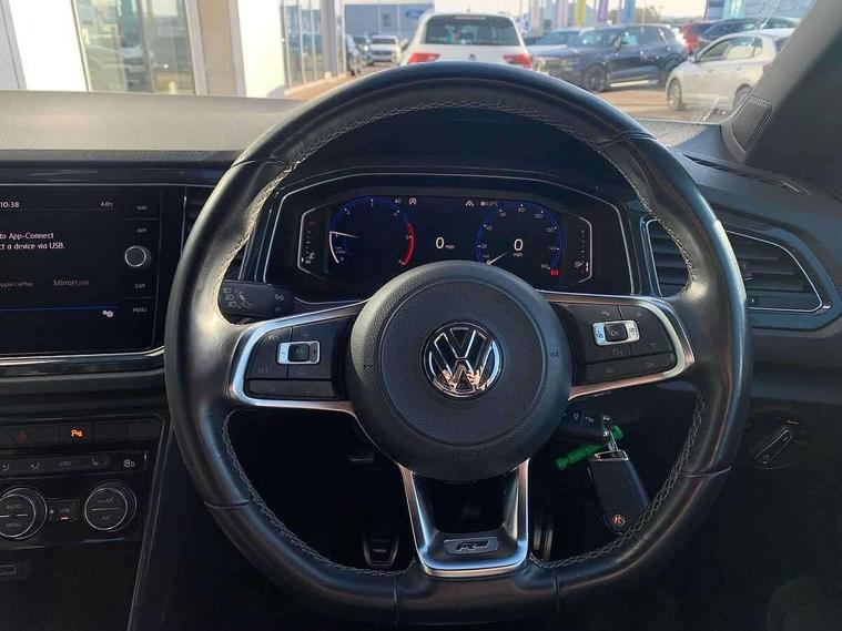Caribou grey decorative inserts in dash and door panel, R line styling pack - T-Roc, Winter pack - T-Roc, 19" Suzuka alloy wheels with low rolling resistance tyres and anti wheel bolts, Space and weight saver spare wheel, Alarm with remote central locking and interior protection, Electronic engine immobiliser, Remote central locking with 2 remote folding keys, CD/MP3/WMA, USB and SD card reader, aux-in, DAB Digital radio, Dynamic navigation based on TMC+, MDI multi device interface, Premium USB cable in choice of either Apple or Android smartphone compatibility, Three route options - Fast, Short, Eco, 3 rear three point seatbelts, ABS, Driver and front passenger safety-optimised head restraints, Electronic parking brake with auto hold, ESC with EDL, ASR, EDTC and trailer stabilisation function, Front and rear curtain airbags, driver and front passenger airbags with passenger deactivation switch and front side impact airbags, Rigid safety cell with front and rear crumple zones, Three point height adjust front seatbelts + pretensioners, Tyre pressure loss indicator, Ventilated front and rear disc brakes, Volkswagen roadside assistance, Auto dimming interior rear view mirror, Automatic hazard lights activation under emergency braking, Black grained lower door protectors, Black grained wheel arches, Body colour door handles, Body colour door mirrors with integrated indicators, Body colour rear roof spoiler, Chrome effect left and right trapezoid exhaust tailpipe fascia surround, Chrome trim on upper and lower radiator grille, Door mirror puddle lights, Electrically foldable, adjustable and heated door mirrors with puddle lights and reverse activated kerb-view adjustment on passenger's door mirror, Front and rear electric windows, Front fog lights with static cornering function, Front windscreen wiper with intermittent wipe and 4 position delay, Fully galvanised body, Heated rear window, High level 3rd brake light, LED darkened rear light clusters, LED dipped and main beam headlights with automatic range adjustment including signature LED daytime running lights, LED rear number plate lights, Manual coming/automatic leaving home lighting function, Rain sensor, Rear tinted glass from B-pillar backwards approx 65% tinted, Rear windscreen washer and wiper with interval delay, 12V socket in centre console storage area, 2 LED front and rear reading lights, 3 rear head restraints, 4 load lashing points in luggage compartment, Aluminium pedals, Ambient lighting in front footwell and light strips below trim in front doors, Black roof lining and sun visors, Carbon flag cloth upholstery, Climate control - 2 zone electronic air conditioning with automatic air recirculation and allergy filter, Drawer under drivers seat, Front + rear carpet mats, Front centre armrest with storage compartment, longitudinal and height adjustable and two rear air vents, Front cupholders x 2, Front footwell illumination, Front seat back storage pockets, Front sport seats, Glovebox, Height adjustable front seats, Height/reach adjust steering wheel, Illuminated vanity mirrors, Instrument lighting, white adjustable panel illumination, Interior light delay, Isofix easy fit child seat preparation for 2 outer rear seats, Load through provision with single cup holder when folded down, Luggage compartment cover, removable, Luggage compartment lighting, R Line badge, Split folding rear seat backrests with centre armrest, Storage compartment in left and right luggage area, Storage compartment in rear doors, Storage compartments in driver and front passenger doors, Three spoke multi-function leather trimmed steering wheel and gearknob, Unique R Line door sill protectors, Variable boot floor, height adjustable and removable, App-Connect, Active Info Display, 10.3" high resolution TFT dash display screen with customised information, Adaptive cruise control, Automatic start/stop system, Bluetooth hands free telephone connection, Car-Net Security and Service, Discover navigation, 8" touch screen navigation/infotainment system with Car-Net, European map, CD/radio, 2D/3D map and speed limiter, Driver alert system with audible and visual fatigue detection system, Driving Mode Selection with four preset modes - Eco, normal, sport or individual modes, Dusk sensor, Front assist, radar sensor controlled distance monitor, city emergency braking + predictive pedestrian protection, Instrument cluster in white, Lane assist, Multifunction computer with visual gear change recommendation for fuel consumption, Progressive power assisted steering, Voice activation, Warning sound and light for doors and tailgate open, Warning sound and light for front seatbelts unfastened, Battery regeneration during braking, Misfuel prevention device for diesel engine, Sports suspension,