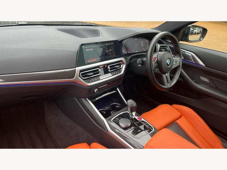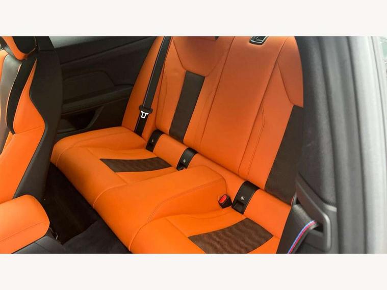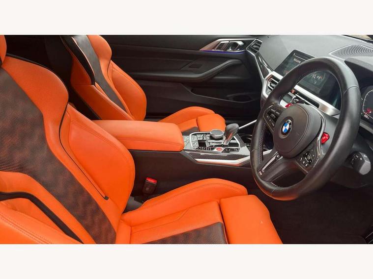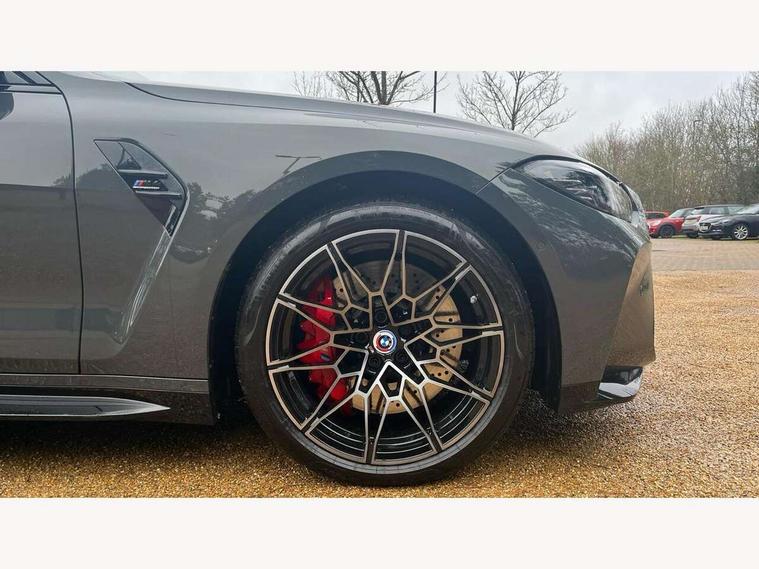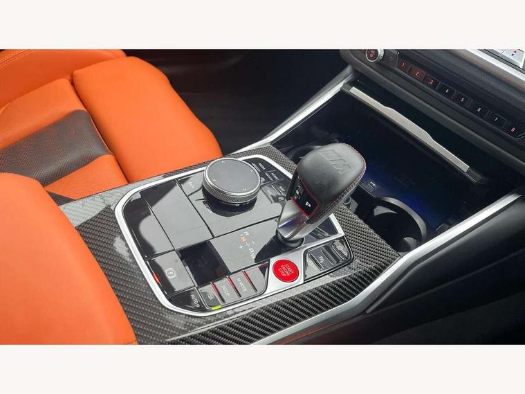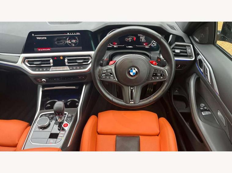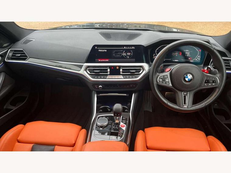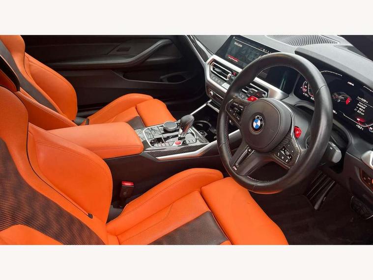 Active guard plus, Automatic start/stop system, BMW ConnectedDrive online services, BMW iDrive controller on centre console, BMW legal emergency call, BMW Live Cockpit Professional sat nav system with 12.3" instrument display and high resolution control display, BMW Teleservices, Brake pad wear indicator warning light, Condition based service, Connected drive services, Door/boot open warning light, Driving experience switch, Electric Power Steering (EPS) with Servotronic, Enhanced bluetooth with wireless charging, Head up Display, Instrument cluster with extended contents, Lights on warning, M drive buttons, Oil sensor for level and grade, warning by check control system, Oil temperature gauge, On board computer, On board diagnostics, Optimum shift indicator, Outside temperature display, Pull away assistant, Run flat indicator, Service interval indicator, Shifting point display, Speed limiter, Variable sport steering, Wi-Fi hotspot, Adaptive M Sport suspension, Double joint spring strut front axle, M Drive Professional including track mode, laptimer, traction control & Drift analyser, M Sport differential, M steptronic sport transmission with drivelogic, Safety battery terminal clamp, 8 programmable favourite buttons, Auxiliary point for auxiliary devices, BMW professional radio/CD/MP3, DAB Digital radio, Harman/Kardon loudspeaker system, Acoustic laminated side glass, Auto dimming driver's door mirror, Auto dimming rear view mirror, Automatic headlights + automatic windscreen wipers, Black chrome exhaust tailpipes, Black model designation badges, BMW high gloss shadow line with extended contents, BMW Individual shadowline lights, Body colour bumpers, Body colour door handles, Carbon fibre reinforced plastic (CFRP) roof, Day time running light, Door mirror integrated indicators, Door sill finishers with aluminium inserts, Dynamic brake lights, Electric adjustable heated door mirrors, Electric folding door mirrors, Follow me home headlights, Front and rear bumper system, Front electric windows with open and close fingertip control, anti trap facility and comfort closing, Headlight beam throw control, Heat protection, sun protection glazing, Heated washer jets, High beam assistant, High gloss black frameless kidney grille with M badge, LED number plate light, LED tail lights with 3D L-shaped LED light design, M designation, Mirror glass aspheric on driver's side, convex on passenger side, Rain sensor, Rear boot, Rear fog lights, Rear reflectors, Reversing light, Shark fin roof aerial, Third brake light, Visible VIN plate, Welcome lighting, 2 cupholders in front centre console, 2 rear head restraints, 2 x 12 V Power sockets (luggage compartment and front centre console), 2 x USB Type C ports for charging and data transmission in front centre console, 2 x USB Type C ports for charging in rear centre console, 40:20:40 split folding rear 2 seat bench with loading system, Ambient lighting, Anthracite headlining, Battery in luggage compartment, Carbon fibre centre console incl. cover for cupholders, Carbon fibre decorative steering wheel finishers, Carbon fibre shift paddles, Carbon fibre strip in instrument panel on front passenger side, Centre console armrest with storage compartment, Compartment in front of cupholder, Driver/passenger sunvisors with illuminated vanity mirrors + covers, Electric front seats + driver memory, English handbook, Floor mats in velour, Footwell lighting, Front and rear door exit lights, Front door storage bins with bottle holder, Front interior light, Front isofix attachment + airbag deactivation, Front seat backrest width adjustment, Front seats lumbar support, Front/rear door armrests, Gearshift lever with embossed M badge, Heated front seats, Height adjustable front headrests, Interior mirror lighting, Isofix on 2nd row outer seats, Lockable/illuminated glovebox, Luggage compartment lighting, Multifunction steering wheel, Rake/reach adjustable steering wheel, Single front passenger seat, Storage compartment in rear doors, Storage tray and compartment with cover in centre console, Three zone automatic air conditioning, Toolkit located in luggage compartment, Additional storage compartment pack - M4, Connected package professional - M4, High gloss shadowline exterior trim pack - M4, 4 x 3 point seatbelts, ABS/EBD, Automatic Stability Control (ASC), Brake energy regeneration, Brake fade compensation, Compound structure brake discs, Cornering brake control (CBC), Crash sensor, Curtain airbags, Driver/Front Passenger airbags, Dry braking, Dynamic brake control, Dynamic Stability Control with M Dynamic mode, Dynamic Traction Control - DTC, Electromechanical parking brake, Electronic differential lock control (EDLC), Front and rear head airbags, Front seat side impact airbags, Front seatbelt pretensioners + load limiters, Hill start assist, M Sport seat belts, Seatbelt warning, Side impact protection, Two tone horn, Tyre pressure sensor, Warning triangle and first aid kit, Centre lock switch, Closing system with central locking, Digital key, Electronic immobiliser, Remote central locking, Thatcham cat 1 remote alarm, Vehicle Key with 4 buttons including the integrated key, Galvanic finish to control surrounds, High gloss black interior trim, Tyre repair kit,