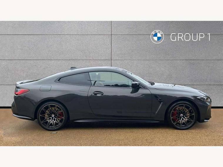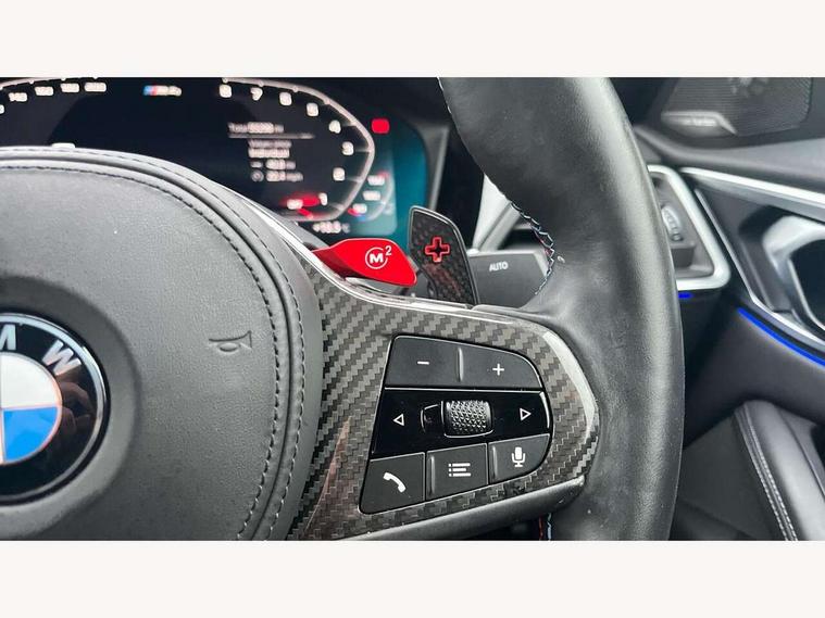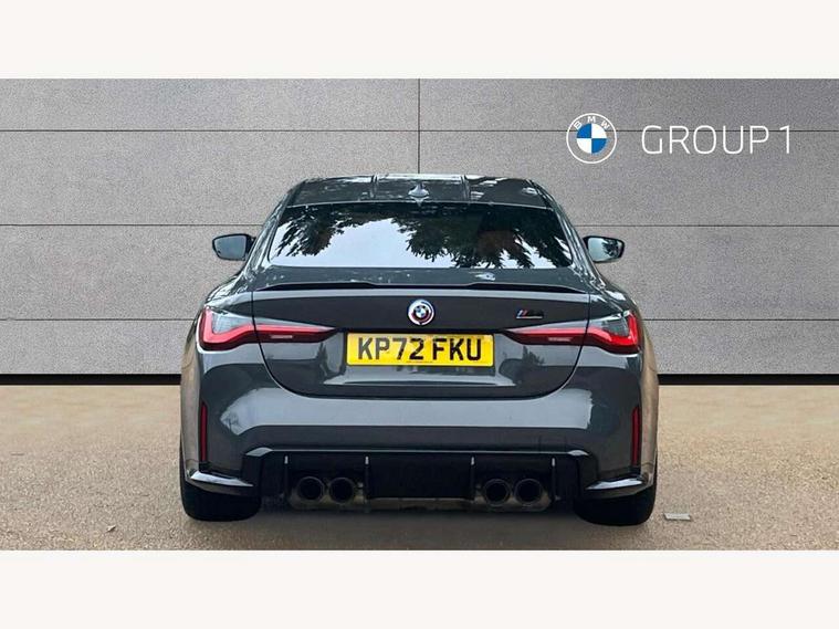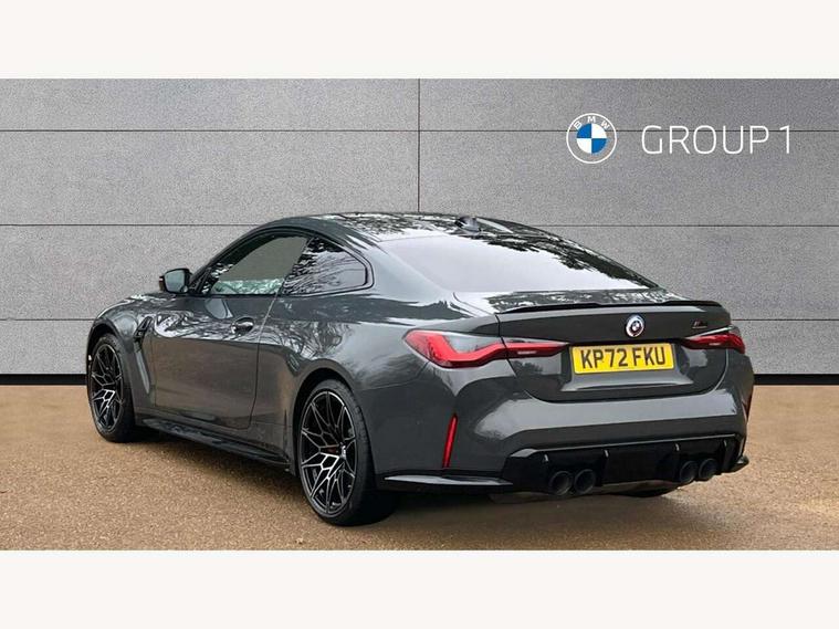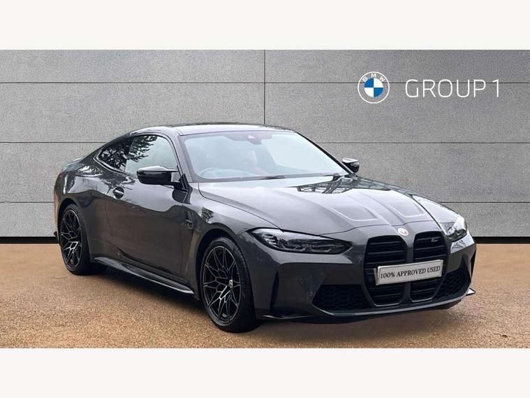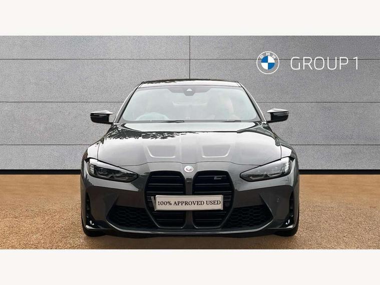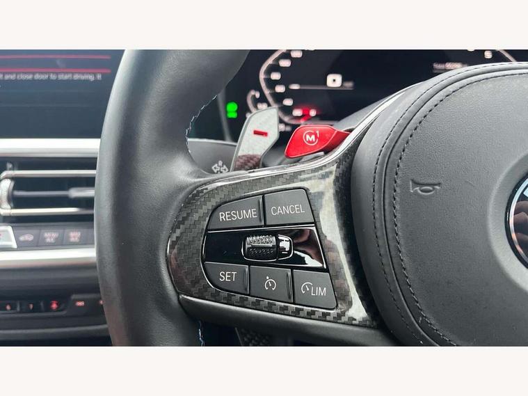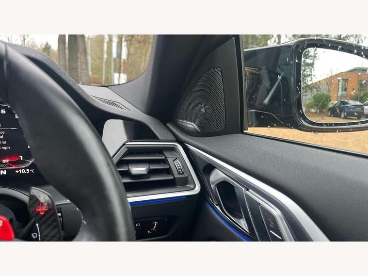 Active guard plus, Automatic start/stop system, BMW ConnectedDrive online services, BMW iDrive controller on centre console, BMW legal emergency call, BMW Live Cockpit Professional sat nav system with 12.3" instrument display and high resolution control display, BMW Teleservices, Brake pad wear indicator warning light, Condition based service, Connected drive services, Door/boot open warning light, Driving experience switch, Electric Power Steering (EPS) with Servotronic, Enhanced bluetooth with wireless charging, Head up Display, Instrument cluster with extended contents, Lights on warning, M drive buttons, Oil sensor for level and grade, warning by check control system, Oil temperature gauge, On board computer, On board diagnostics, Optimum shift indicator, Outside temperature display, Pull away assistant, Run flat indicator, Service interval indicator, Shifting point display, Speed limiter, Variable sport steering, Wi-Fi hotspot, Adaptive M Sport suspension, Double joint spring strut front axle, M Drive Professional including track mode, laptimer, traction control & Drift analyser, M Sport differential, M steptronic sport transmission with drivelogic, Safety battery terminal clamp, 8 programmable favourite buttons, Auxiliary point for auxiliary devices, BMW professional radio/CD/MP3, DAB Digital radio, Harman/Kardon loudspeaker system, Acoustic laminated side glass, Auto dimming driver's door mirror, Auto dimming rear view mirror, Automatic headlights + automatic windscreen wipers, Black chrome exhaust tailpipes, Black model designation badges, BMW high gloss shadow line with extended contents, BMW Individual shadowline lights, Body colour bumpers, Body colour door handles, Carbon fibre reinforced plastic (CFRP) roof, Day time running light, Door mirror integrated indicators, Door sill finishers with aluminium inserts, Dynamic brake lights, Electric adjustable heated door mirrors, Electric folding door mirrors, Follow me home headlights, Front and rear bumper system, Front electric windows with open and close fingertip control, anti trap facility and comfort closing, Headlight beam throw control, Heat protection, sun protection glazing, Heated washer jets, High beam assistant, High gloss black frameless kidney grille with M badge, LED number plate light, LED tail lights with 3D L-shaped LED light design, M designation, Mirror glass aspheric on driver's side, convex on passenger side, Rain sensor, Rear boot, Rear fog lights, Rear reflectors, Reversing light, Shark fin roof aerial, Third brake light, Visible VIN plate, Welcome lighting, 2 cupholders in front centre console, 2 rear head restraints, 2 x 12 V Power sockets (luggage compartment and front centre console), 2 x USB Type C ports for charging and data transmission in front centre console, 2 x USB Type C ports for charging in rear centre console, 40:20:40 split folding rear 2 seat bench with loading system, Ambient lighting, Anthracite headlining, Battery in luggage compartment, Carbon fibre centre console incl. cover for cupholders, Carbon fibre decorative steering wheel finishers, Carbon fibre shift paddles, Carbon fibre strip in instrument panel on front passenger side, Centre console armrest with storage compartment, Compartment in front of cupholder, Driver/passenger sunvisors with illuminated vanity mirrors + covers, Electric front seats + driver memory, English handbook, Floor mats in velour, Footwell lighting, Front and rear door exit lights, Front door storage bins with bottle holder, Front interior light, Front isofix attachment + airbag deactivation, Front seat backrest width adjustment, Front seats lumbar support, Front/rear door armrests, Gearshift lever with embossed M badge, Heated front seats, Height adjustable front headrests, Interior mirror lighting, Isofix on 2nd row outer seats, Lockable/illuminated glovebox, Luggage compartment lighting, Multifunction steering wheel, Rake/reach adjustable steering wheel, Single front passenger seat, Storage compartment in rear doors, Storage tray and compartment with cover in centre console, Three zone automatic air conditioning, Toolkit located in luggage compartment, Additional storage compartment pack - M4, Connected package professional - M4, High gloss shadowline exterior trim pack - M4, 4 x 3 point seatbelts, ABS/EBD, Automatic Stability Control (ASC), Brake energy regeneration, Brake fade compensation, Compound structure brake discs, Cornering brake control (CBC), Crash sensor, Curtain airbags, Driver/Front Passenger airbags, Dry braking, Dynamic brake control, Dynamic Stability Control with M Dynamic mode, Dynamic Traction Control - DTC, Electromechanical parking brake, Electronic differential lock control (EDLC), Front and rear head airbags, Front seat side impact airbags, Front seatbelt pretensioners + load limiters, Hill start assist, M Sport seat belts, Seatbelt warning, Side impact protection, Two tone horn, Tyre pressure sensor, Warning triangle and first aid kit, Centre lock switch, Closing system with central locking, Digital key, Electronic immobiliser, Remote central locking, Thatcham cat 1 remote alarm, Vehicle Key with 4 buttons including the integrated key, Galvanic finish to control surrounds, High gloss black interior trim, Tyre repair kit,