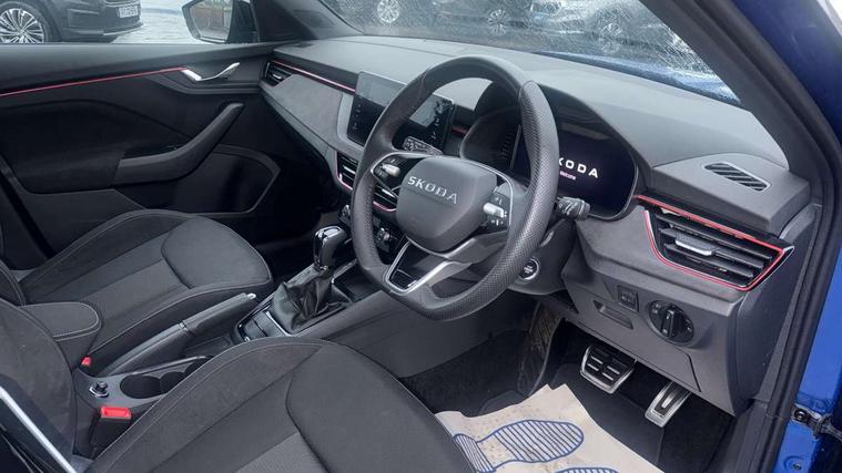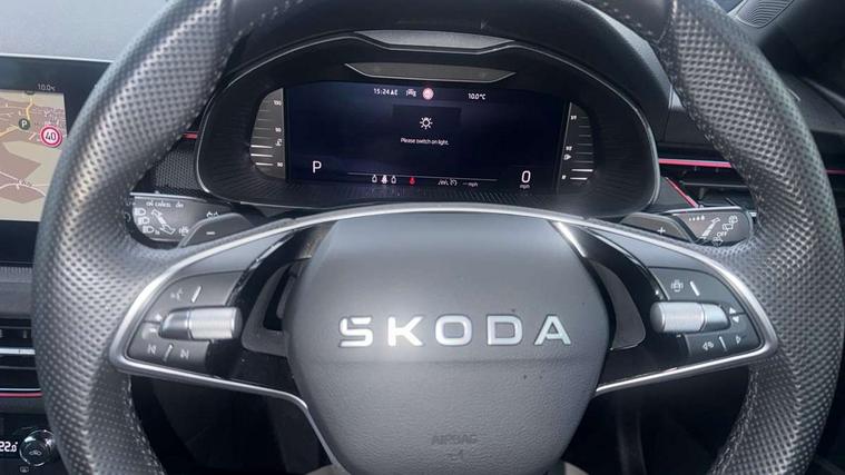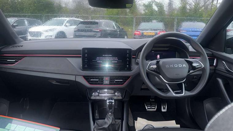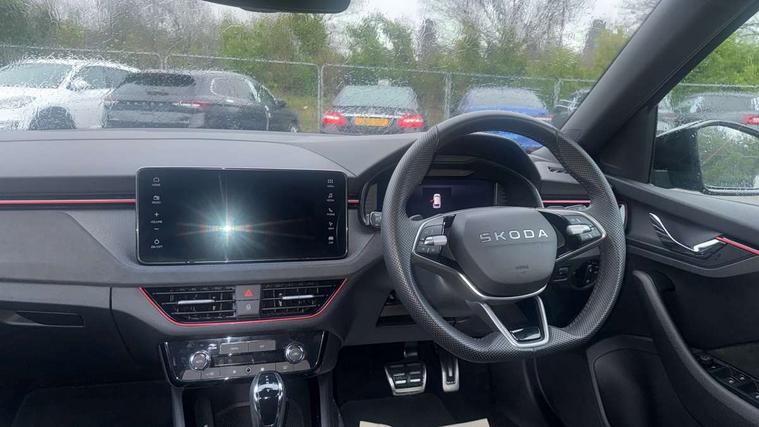 Advanced driver attention and drowsiness monitor, Bluetooth system, E-call, Front assist system, PAS, Rear parking sensors, Rear view camera, Service indicator, Speed limiter, Traffic sign recognition, Virtual cockpit with 10.25" display, Voice control system, Wireless smartlink, 4 USB C ports, 8 Speakers, 9.2" Skoda navigation display, DAB Digital radio, Auto dimming rear view mirror, Automatic headlight control with coming home and leaving home feature, Black door mirrors, Black roof, Black roof rails, Body colour bumpers, Body colour door handles, Chrome grille surround, Front and rear electric windows, Full LED headlights, Heated rear window, LED brake lights, LED daytime running lights, LED front turning lights, LED high beam, LED low beam, LED third brake light, Privacy glass, Rear LED fog light, Rear side wing doors, Rear wiper, Ticket holder inside windscreen, 12V socket in luggage compartment, 3 seat bench in 2nd row, 3 spoke leather sports multi-function steering wheel with paddles for DSG, Aluminium pedals, Ambient lighting in white/red, Black roof lining, Black suedia decor inserts, Black suedia door inserts, Cargo elements, Chrome inner door handles, Driver and passenger sun visors with vanity mirror, Dual zone climate control, Dynamic cloth upholstery, Front and rear roof lights, Front centre armrest, Front head restraints, Glove compartment with illumination, Height adjustable driver seat, Height adjustable front passenger seat, Ice scraper, Inner circulation control with pollen filter, ISOFIX on front passenger seat, Isofix preparation for back seats, Leather gearknob and handbrake lever, Manual lumbar support for front seats, Net package and top tether hooks in boot space, Net under rear shelf, Overhead glasses storage compartment, Pocket on the back of both front seats include mobile phone pockets, Rake/reach adjustable steering wheel, Reading lights, Rear centre armrests, Red hotstamping, Single front passenger seat, Sports seats, Textile floor mats, Third rear headrest, Top tether for front passenger seat, Umbrella in driver's door, 3x3 point rear seatbelts, Airbags - driver and front passenger, Disc brakes, ESP, Extended and predictive pedestrian/cyclist protection, Front passenger airbag deactivation switch, Front side airbags with curtain airbags, Hill hold control, Manual leather parking brake, Manual rear child locks, One tone horn, Seatbelt reminder for driver an co-driver, Traction control, Tyre pressure monitor, Anti-theft alarm system with interior monitoring, backup horn, towing protection and remote central locking with SAFE system, Anti-theft wheel bolts, Electronic engine immobilizer, Tyre repair kit,