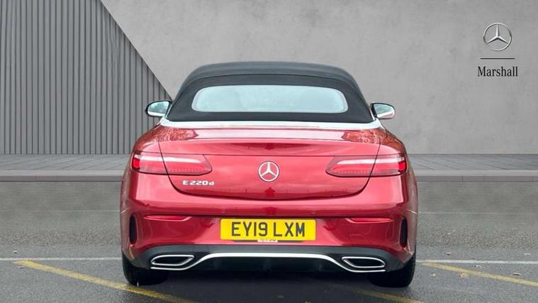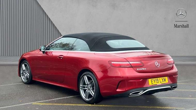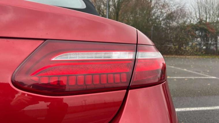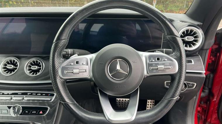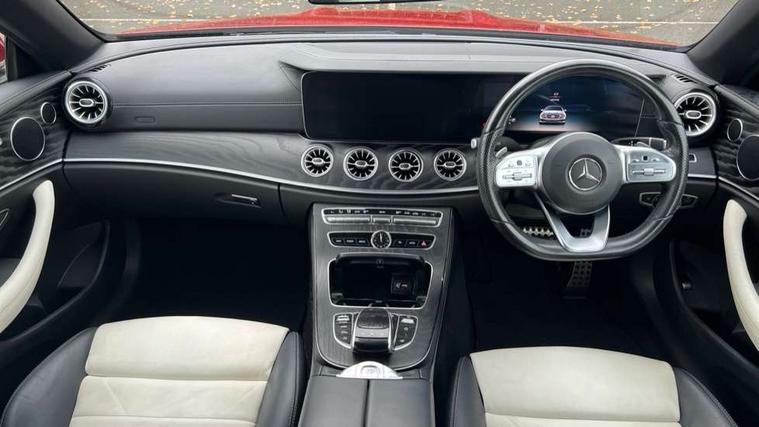 Active parking assist including front and rear parking sensors, Analogue clock, Attention assist, Automatic boot separator, Blind spot assist, Bluetooth interface for hands free telephone, Brake wear warning display, Cockpit display 12.3" widescreen digital instrument cluster, Collision prevention assist plus, Direct steer speed sensitive steering, Direct steering, DYNAMIC SELECT with a choice of driving modes (ECO, Comfort, Sport, Sport+ and Individual), ECO start/stop function, Engine start/stop button, High resolution 12.3" multimedia colour display, Mercedes connect me, Multi function trip computer, Outside temperature display, Remote boot release, Reversing camera, SD card based satellite navigation system, Service indicator (ASSYST), Status display for rear seat belts in instrument cluster, Touchpad with control wheel, 66 litre fuel tank, 8.5 litre AdBlue tank, Agility control sports suspension with selective damping system, Diesel particulate filter, Incorrect fuelling protection, 2 USB ports in centre console, Audio 20 with USB, touchpad and control wheel with Media Interface with Bluetooth interface and hands-free function, DAB Digital radio, Acoustic soft-top with enhanced climate and noise comfort, Adaptive brake lights, AIRCAP wind deflector and draught stop, AMG bodystyling front and rear aprons, side skirts, AMG boot lid spoiler in body colour, AMG front, rear apron and side skirts, Body colour door handles, Body coloured bumpers, Electric windows with one touch opening/closing and obstruction sensors, Exterior mirrors heated and electronically adjustable, Illuminated front door sill panels with Mercedes-Benz lettering, LED high performance headlamps with integrated LED daytime running lights, Magic Vision Control heated windscreen wiper system, Rain sensing windscreen wipers, Rear LED lights, Top surround of side windows in polished aluminium, Visible twin pipe exhaust system integrated into bumper, Waistline in polished aluminium, 3-spoke flat bottom multifunction AMG steering wheel with Touch Control buttons, trimmed in black nappa leather, 4 way adjustable front head restraints and 2 way rear head restraints, 50/50 split folding rear seat, Airscarf - neck level heating, Artico man-made leather upper dashboard and beltlines with contrast stitching, Automatic child seat recognition sensor, Automatic two zone climate control, Bag hook in luggage compartment, Belt feeder driver and front passenger seat belt automatically positioned within easier reach, Black roof lining, Central stowage compartment with 12 V socket in centre console, Centre armrest and door handle illumination, Chrome door pins, Easy entry seats, Floor mats with AMG lettering, Front and rear door pockets, Front centre armrest with stowage compartment, Front footwell lights, Glasses compartment in overhead control panel, Glove compartment - lockable, air conditioned and illuminated, Heated front seats, Interior lighting - 64 colour Ambient lighting, Interior rear light/integral reading lights, Isofix rear child seat fastenings, Multi contour front sports seats, Multi function steering wheel, Partial electric front seats/backrest/height adjust, Rear centre armrest with 2 cupholders + storage, Seat occupancy sensor for front passenger seat, Sports pedals in brushed stainless steel with black rubber studs, Steering column manually adjustable for height and reach, Steering wheel gearshift paddles, Steering wheel touch control buttons for audio and onboard settings, Storage net in luggage compartment, Sunvisors with illuminated vanity mirrors, Twin front cupholders, Mirror pack - E Class, Seat comfort pack - E Class, Stowage pack - E Class, Active bonnet, Active brake assist, Adaptive brake system, Adaptive driver and front passenger airbags, Anti-lock braking system (ABS), Crash sensor (auto door unlocking), Drivers knee airbag, Electric parking brake, Electronic Stability Programme, Front and rear window airbags, Front seatbelt pretensioners, Front side airbags, Head airbags, Hill hold function, Perforated front brake discs with "Mercedes-Benz" lettering, Seatbelt warning, Three point rear seat belts, Tyre pressure monitoring system, Warning triangle and first aid kit, Alarm system/interior protection/immobiliser, Central locking with interior switch, automatic locking and crash sensor with emergency opening function, Chrome surround in electric key, Keyless entry go starting function, Black open pore ash wood, Open pore black ash wood centre console, Run flat tyres,