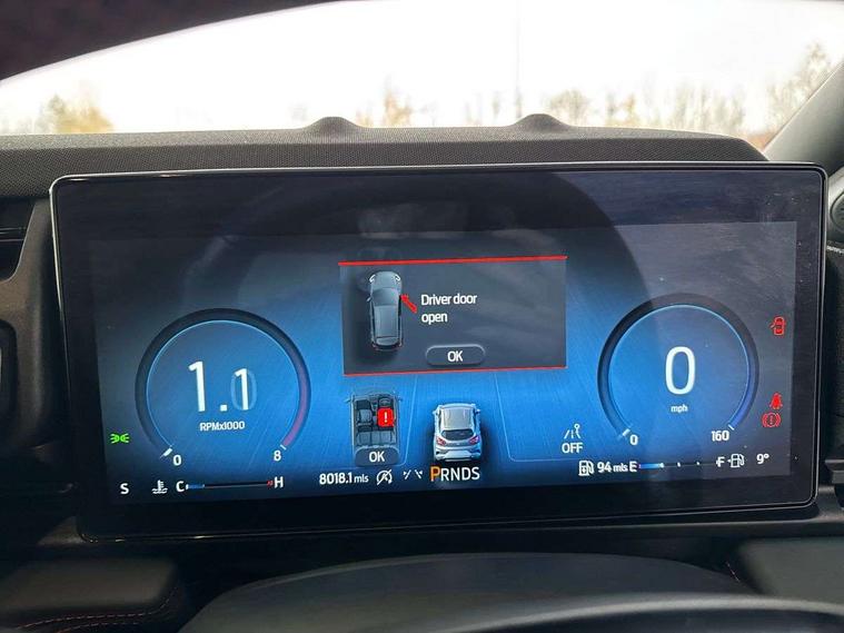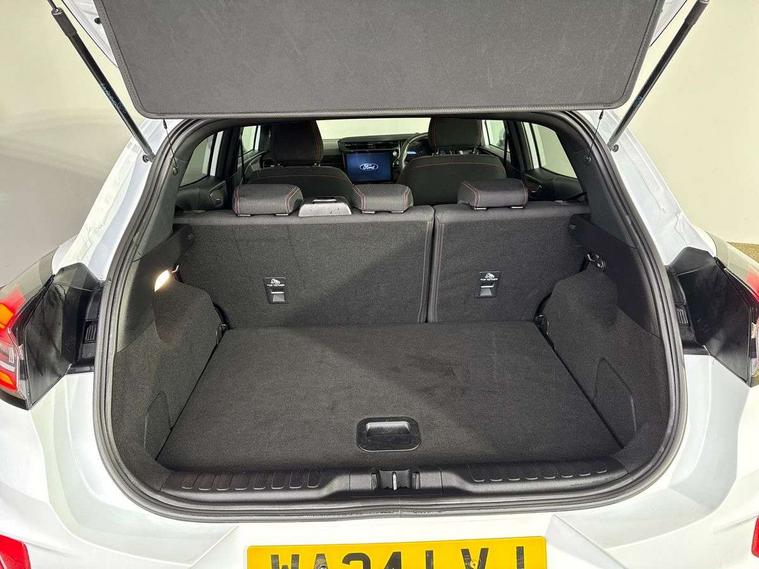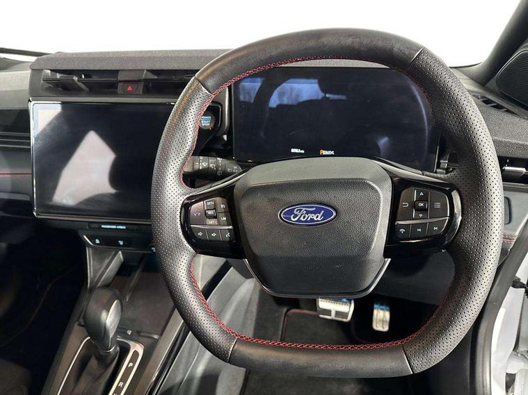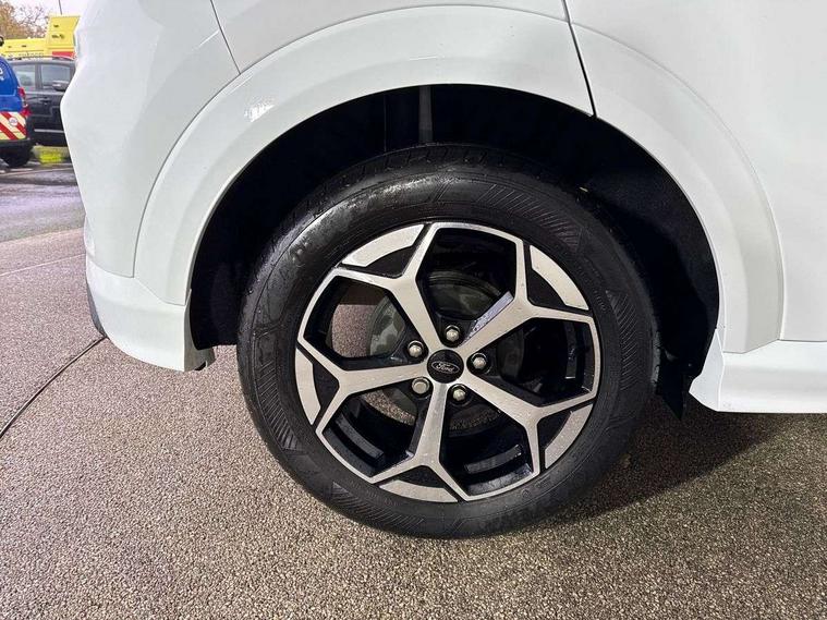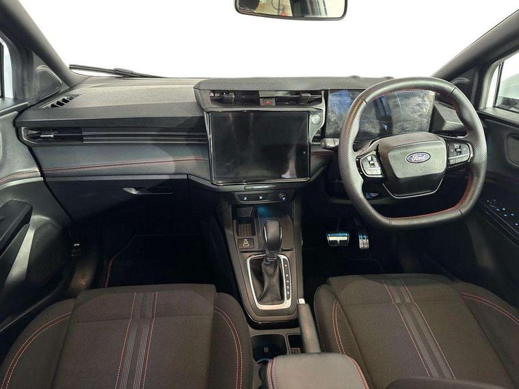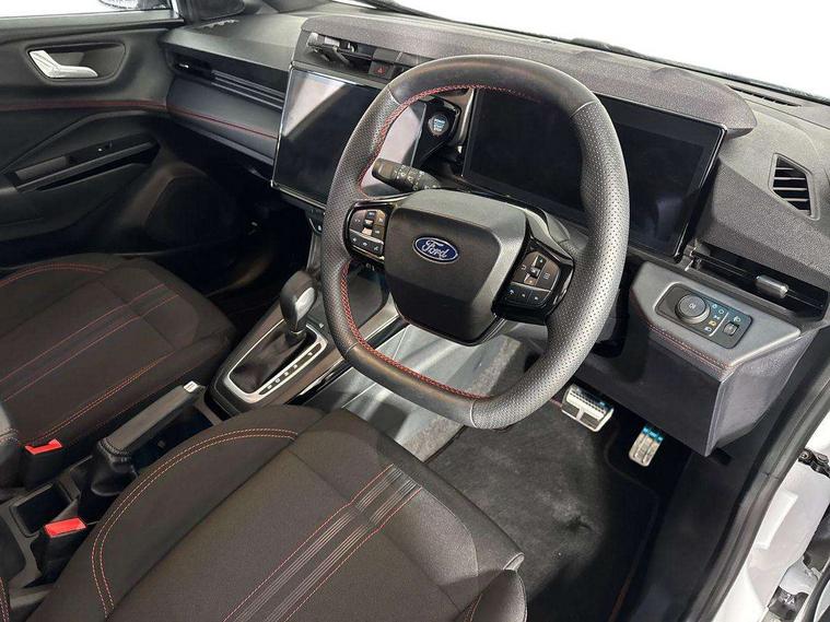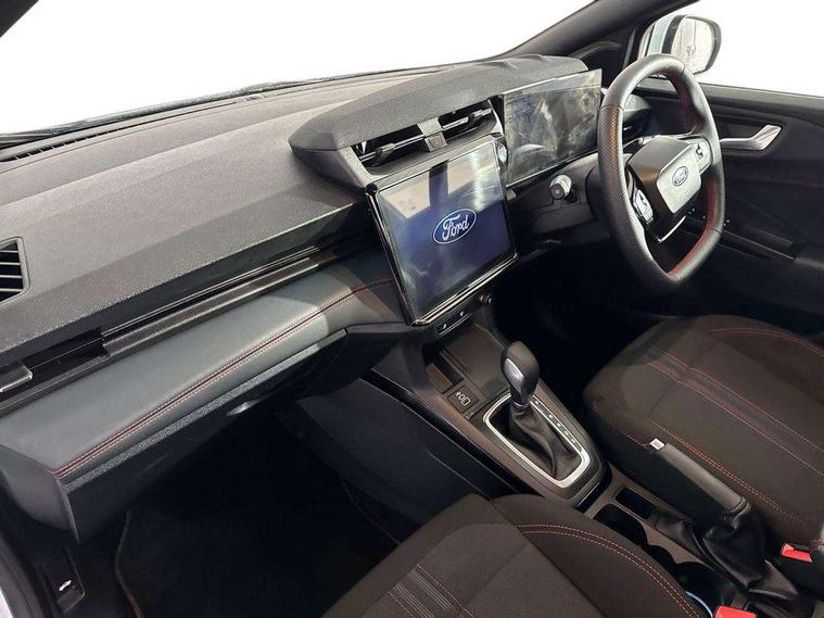 Driver impairment monitor, Emergency call service, Ford easy fuel, Full digital 12.8" instrument cluster, Lane keeping aid with lane departure warning, Power assist steering, Selectable drive modes(Normal, Eco, Sport, Slippery and Trail), Speed sign recognition, Sport suspension, 12" landscape touchscreen display with wireless apple car play and android auto 6 speaker audio system, Ford pass connect and emergency assistance, Ford SYNC4 with connected navigation, Automatic headlights with rain sensing wipers and auto high beam, Front fog lamps, LED daytime running lights, LED rear lamps, LED third brake light, Power foldable heated door mirrors with puddle lamps and puma logo protection, Quickclear heated windscreen, Rear privacy glass, Rear side wing doors, Rear wiper, ST-Line body styling kit with unique grille, 3 seat bench in 2nd row, Centre console with armrest and stowage, Electronic automatic temperature control (EATC), Ford megabox extended bootspace, Front and rear head restraints, Front floor mats, Manual 4 way driver seat adjust with lumbar adjustment, Single front passenger seat, ST- Line cloth trim with red stitching, 3 rear seatbelts, Child safety lock, Electronic stability control (ESC) and hill start assist, Pre-collision assist with autonomous emergency braking, pedestrian/cyclist detection & post-collision braking, Tyre pressure monitoring system (TPMS), Thatcham alarm,