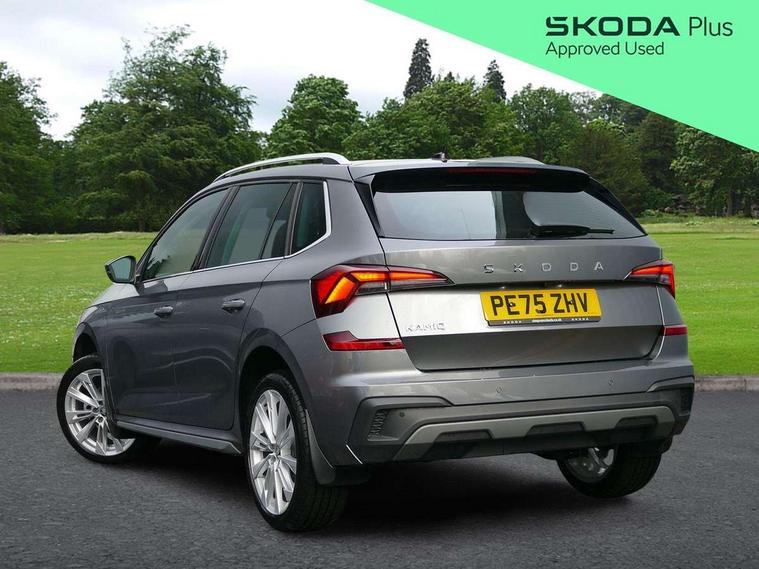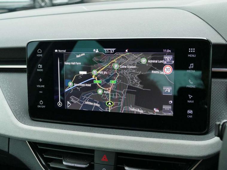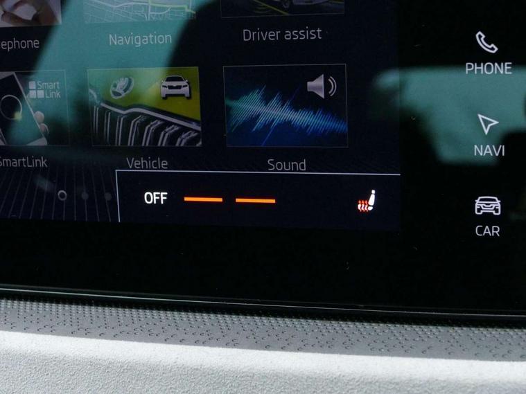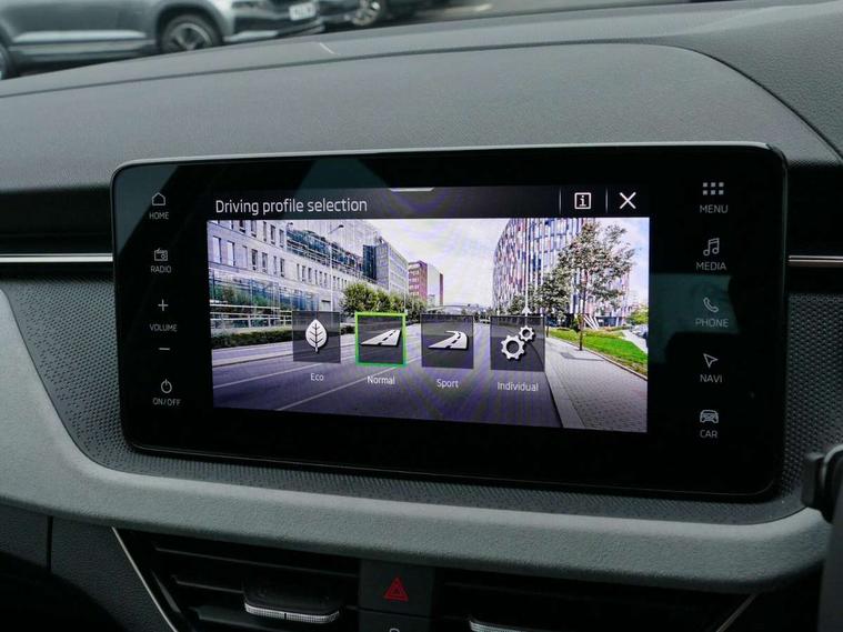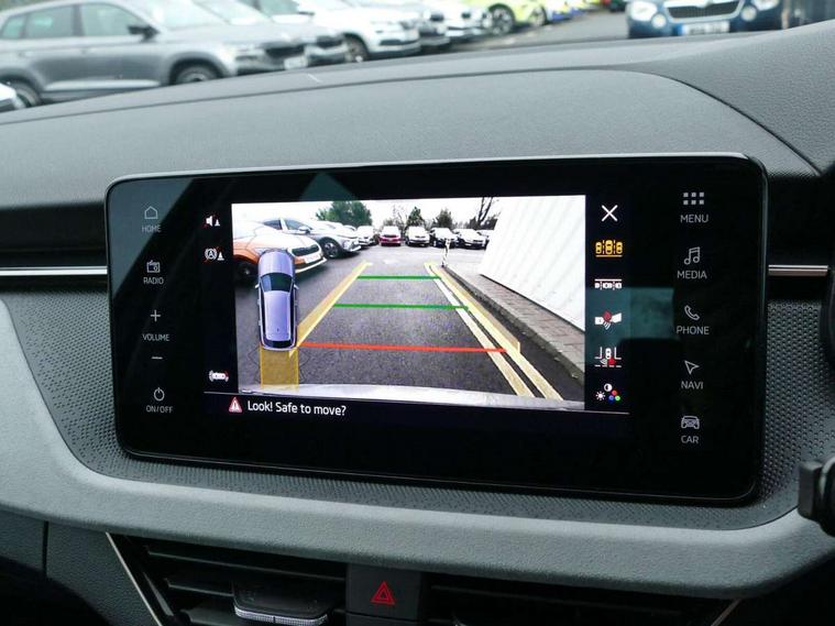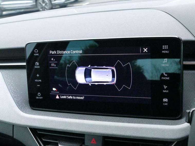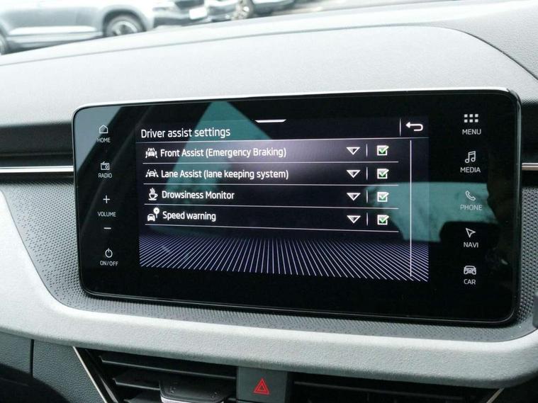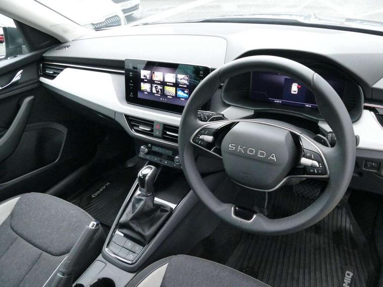Advanced driver attention and drowsiness monitor, Bluetooth system, E-call, Front assist system, PAS, Rear parking sensors, Rear view camera, Service indicator, Speed limiter, Traffic sign recognition, Virtual cockpit with 10.25" display, Voice control system, Wireless smartlink, 4 USB C ports, 8 Speakers, 9.2" Skoda navigation display, DAB Digital radio, Auto dimming rear view mirror, Automatic headlight control with coming home and leaving home feature, Body colour bumpers, Body colour door mirrors and handles, Chrome grille surround, Chrome roof rails with chrome window surround, Front and rear electric windows, Heated rear window, LED daytime running lights, LED high beam, LED low beam, LED third brake light, Light sensors, Privacy glass, Rear side wing doors, Rear wiper, Ticket holder inside windscreen, 12V socket in luggage compartment, 3 seat bench in 2nd row, Accent black door inserts, Ambient lighting in white/red, Cargo elements, Chrome inner door handles, Copper hotstamping, Driver and passenger sun visors with vanity mirror, Dual zone climate control, Front and rear roof lights, Front centre armrest, Front head restraints, Glove compartment with illumination, Height adjustable driver seat, Height adjustable front passenger seat, Ice scraper, Inner circulation control with pollen filter, ISOFIX on front passenger seat, Isofix preparation for back seats, Leather gearknob and handbrake lever, Lodge cloth upholstery, Manual lumbar support for front seats, Net package and top tether hooks in boot space, Net under rear shelf, Overhead glasses storage compartment, Pocket on the back of both front seats include mobile phone pockets, Rake/reach adjustable steering wheel, Reading lights, Rear centre armrests, Single front passenger seat, Suedia grey decor inserts, Textile floor mats, Third rear headrest, Top tether for front passenger seat, Umbrella in driver's door, Convenience pack - Kamiq, 3x3 point rear seatbelts, Airbags - driver and front passenger, Disc brakes, ESP, Extended and predictive pedestrian/cyclist protection, Front passenger airbag deactivation switch, Front side airbags with curtain airbags, Hill hold control, Manual leather parking brake, Manual rear child locks, One tone horn, Seatbelt reminder for driver an co-driver, Traction control, Tyre pressure monitor, Anti-theft alarm system with interior monitoring, backup horn, towing protection and remote central locking with SAFE system, Anti-theft wheel bolts, Electronic engine immobilizer,