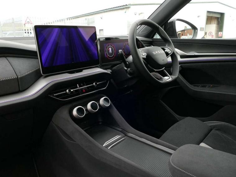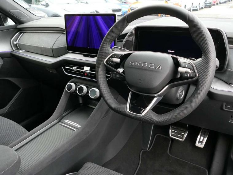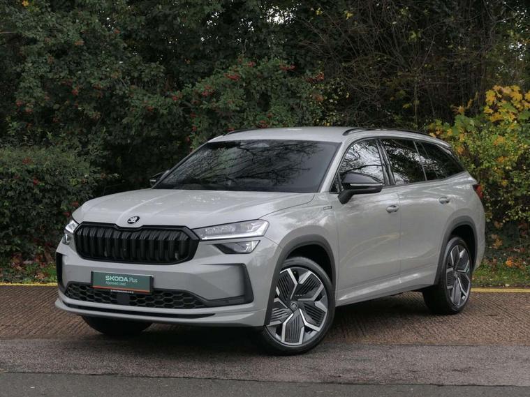 13" satellite navigation touchscreen display, Blind spot detection with door exit warning, Bluetooth system, ChatGPT functionality, Driver alert - Fatigue and drowsiness monitor, Dry display cleaner, Emergency call, Front and rear parking sensors, Front cross traffic assist, Lane assist, Off road modes, PAS, Rear traffic assist, Tailgate unlocking from outside, Traffic sign recognition, USB C Port x 2 in front centre console, Virtual Cockpit - 10.25" digital display, Voice control system, Wireless charging for two smartphones (15W) with cooling function, Wireless SmartLink for Apple CarPlay and Android Auto, Stop/start function, 2x USB-C in the rear, DAB Digital radio, Aero front windscreen wipers with intermittent function, Auto dimming rear view mirror, AWL (all weather lighting) and all weather light with cornering function, Black diffuser and decorative tailpipe with a unique dark chrome finish, Black roof rails, Black sports styling including front grille and window surrounds, Black wheel arch surrounds, Body colour door handles, Cornering light and poor weather light, Electric folding /adjustable/separted heated/folding door mirrors, auto dimming with boarding sports and memory function, Electric front and rear windows, Exterior black decorative trims, Front and rear sports bumpers including lower rear chrome strip, Gloss black door mirrors, Gloss black window frame and D pillar, Heat insulating glass in windshield, Heated rear window, Ice scraper in fuel tank cap, LED daytime running lights, LED third brake light in rear spoiler, Light assistant with automatic headlight control and coming home feature, Logo projection in door mirrors, Privacy glass, Rear roof spoiler, Rear side wing doors, Rear window wiper, Red decorative strip between rear LED lights, Safety reflectors on front and rear doors, Sportline badge on front fenders, Tailgate lettering in Black, Unique dark chrome design logo on alloy wheels, Window control switches with black trim, Windscreen wipers with rain sensor, Without engine designation, 1.5l bottle holder points in all door, 1x centre rear reading light, 2 seat bench in 3rd row, 3 configurable smart dials with 32mm coloured display, 3 seat bench in 2nd row, 4 foldable roof handles with rear coat hooks, Aluminium pedals, Ambient interior lighting - Dashboard, front-door stowage compartments, front and rear door panels and footwell lighting, Automatic gear selector on steering column, Chrome interior door handles, Driver/front passenger reading lights, Fabric headlining, Fixed bench 40:60:40 split folding backrests, Front and rear floor mats, Front centre armrest with jumbo box storage compartment, cup holder and 12V socket, Front sport seats, Height adjustable front headrests, Interior black decorative trims, Isofix child seat fittings in outer middle row rear seats and front passenger with top tether, Manually adjustable steering column, Pollen filter, Rear centre armrest with cupholders, Rear seat boot backrest release, Single front passenger seat, Skoda lettering on steering wheel, Storage pocket including mobile phone pockets on the backs of the front seats, Sunvisors with illuminated vanity mirrors, Three rear height adjustable headrests, Ticket holder on A Pillar, Tri zone climate control, Umbrella in door panel x1 made from sustainable materials, Upper and lower glovebox with card holder and coin compartment, USB C port by rear view mirror for charging only (15W), Acoustic package - Kodiaq, Performance package - Kodiaq, Sportline design selection pack - Kodiaq, Auto door release and activation of warning lights in the event of an accident, Driver and front passenger airbag with knee airbag and front passenger airbag deactivation, Electric child locks, Electronic parking brake, ESC (incl. ABS+EMD+MSR+ASR+EDL+HBA+DSR+RBS+ESBS+MCB+TSA+XDS), Front assist with braking reaction to vehicles, pedestrians and cyclists, Front disc brakes, Fuel cut off safety device, Height adjustable front 3 point seatbelts + pretensioners, Hill hold assist, Junction assist with automatic emergency braking, Rear disc brakes, Safety vest holder in door, Seat belt reminder for all seats, Three point rear seat belts, Two tone horn, Tyre pressure monitor, Alarm with interior monitoring and tilt sensor with safe function, Anti-theft wheel bolts, Immobiliser, Remote central locking with 2 keys, 20" Rila anthacite polished alloy wheel with black matte aero covers,