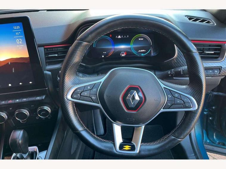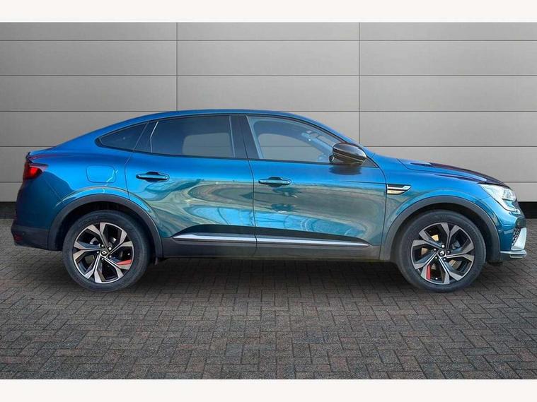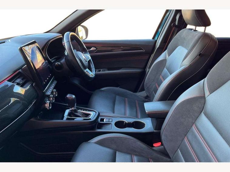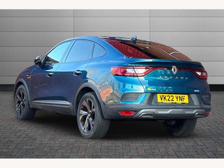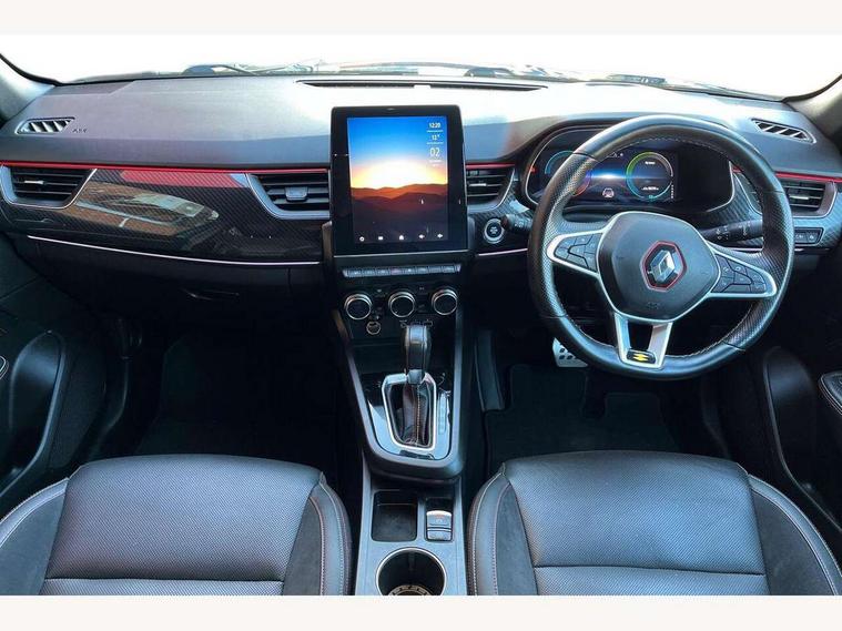 7" TFT Driver information display, Blind spot warning, Bluetooth system, EASY LINK 9.3" portrait touchscreen with navigation, Google search and traffic information, eCall emergency call system, Eco mode, EV button to activate pure mode, Front and rear parking sensors, Gear change indicator, Lane departure warning, Lane keep assist, Multi-sense - 3 driving modes and 8 ambient lighting, Rear cross traffic alert, Rear view camera, Renault automatic emergency assist, Smartphone integration compatible with Apple CarPlay and Android Auto, Traffic sign recognition with over speed prevention, Trip computer, Variable assistance electric power steering, Wireless phone charger, DAB radio, USB port, 3rd brake light, Auto dimming rear view mirror, Automatic headlights, Automatic high / low beam, Automatic windscreen wipers with rain sensor, Black side door protection with gun metal insert, Body coloured bumpers, C-shaped LED front signature lighting, Chrome decopart on wing (fender molding) with R.S. Line badge, Double chromed exhaust tailpipes elements, Extra tinted rear windows and tailgate, Frameless rear view mirror, Front and rear electric windows, Front bumper with F1 blade and honeycomb front grille, Front driver window with one touch facility and anti-pinch function, Front grille with chrome on upper part, Full LED headlights, Glossy black door mirror and lower window lining, Gun Metal front and rear skid plates, Heated rear window, R.S. Line badges on front wing and hatch door, Rain sensor, Rear windscreen wiper, Shiny black shark fin antenna, Side mirrors adjustable electrically, electrically foldable, with defrosting and temperature sensor, automatically foldable at vehicle closure, 3 seat bench in 2nd row, 60:40 split and fixed base rear seats, Aluminium pedals, Automatic climate control with combined filter, humidity sensor and AQS, Black interior roof lining, Carbon style dashboard, Central console with storage, Driver's seat height adjustment, Electrically adjustable front seats, Front and rear head restraints, Height and reach adjustable steering wheel, ISOFIX child seat fixing points on rear outermost seats, LED front and rear roof lights, Passenger seat height adjuster, R.S. line black suede-leather upholstery with red/grey stiching, R.S. Line perforated leather steering wheel with red/black harmony and R.S. Line badge, Rear air vents, Red inserts on air vents, Single front passenger seat, Parking Pack - Hands-free parking & flank protection - Arkana, Winter pack - Arkana, 3x3 point rear seat belts, ABS+EBA, Active emergency braking system, B Brake Mode - One pedal driving with increased regenerative braking, Distance warning alert, Driver airbag, Driver and passenger front and side airbag deactivation, Driver and passenger side airbags, Driver height adjustable seat belt, Electronic parking brake with auto hold, ESC (Electronic Stability Control), Front and rear no seatbelt warning sound, Front curtain airbags, Front head airbags, Hill start assist, Passenger airbag, Tyre pressure warning light, Anti drill door locks and locking fuel cap, Central door locking, Deadlocking system, Hands free keycard with Keyless access and start, RAID (Renault Anti-Intruder Device) automatic door locking, Rear side wing door and window child locking function (front driver door control panel), Superlocking, Thatcham alarm, 18" Silverstone diamond alloy wheels with red inserts,