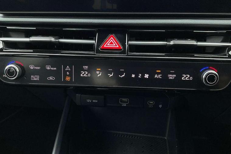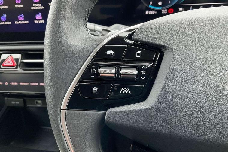 10.25" driver display screen, 10.25" touchscreen satellite navigation, Apple car play/Android Auto, Blind spot collision avoidance assist, Bluetooth connection, Customisable Head Up Display, Drive mode select, E-call, Emergency stop signalling system, Forward Collision-Avoidance Assist (FCA) 1.5 - City/Pedestrian/Cyclist/Junction turning, Front parking sensors, Highway Driving Assist (HDA), Intelligent speed limit assist, Kia connect, Lane Following Assist (LFA), Lane keep assist, Motor driven power steering, Parking collision avoidance assist (PCA), Rear cross traffic collision avoidance assist (RCCA), Rear parking sensors, Remote smart parking assist, Reversing camera system, Safe exit warning (SEW), Smart cruise control with stop and go functionality, Smart power tailgate, Trip computer with distance/fuel consumption/average speed, Wireless Smartphone charger, 220v AC Inverter, 'Shark fin' mobile antenna, DAB Digital radio, Harman Kardon premium sound system with 8 speakers, Steering wheel mounted controls, USB port for connection of a media device, Acoustic windshield, All round electric windows with drivers and front passenger auto up/down and safety function, Auto dimming rear view mirror, Automatic defog system, Automatic headlight control system, Black window surrounds, Body colour bumpers, Body colour door mirrors, Body colour exterior door handles, Deluxe door scuff plates, Electrically adjustable and heated door mirrors with LED turn indicator, Electrically folding door mirrors, Front and rear chrome skid plates, Front fog lights, Gloss black radiator grille with chrome surround, Gloss black wheel arches, Heated rear window, LED daytime running lights, LED Headlights, LED High mounted brake light, LED rear combination lights, Privacy glass - Rear windows and tailgate, Rain sensing front wipers, Rear fog lights, Rear roof spoiler, Rear side wing doors, Rear wiper, Roof rails, Solar glass windscreen, Sunroof with tilting and sliding function, Welcome and follow-me home light functionality, Windscreen Washer Level Warning, 12V socket in front, 12V socket in luggage compartment, 3 seat bench in 2nd row, 60:40 Split folding rear seats, All-round height adjustable headrests, Alloy pedals, Artificial leather steering wheel, Artificial leather upholstery, Automatic air conditioning, Centre console cupholder, Centre console with storage box, Chrome coating interior door handles, Driver power adjusted memory seat, Driver/passenger sunvisors with illuminated vanity mirrors, Drivers seat power lumbar support, Front and rear door storage, Front passenger 1 x USB-C charging port, Front passenger power adjusted seat, Front passenger relaxation seat, Glove box, Heated front seats, Heated outer rear seats, Heated steering wheel, ISOFIX Child seat top tethers and anchor fixings, LED Front cabin, rear & luggage compartment lights, Luggage area load cover, Luggage board, Manually adjustable steering column, Paddle shifts, Power adjustable lumbar support on front passenger seat, Rear centre armrest with cupholder, Rear passenger 2 x USB-C charging ports, Shift by wire SBW, Single front passenger seat, Ventilated front seats, Ventiliation ducts to rear compartment, 3 point seatbelts on all seats, ABS, Automatic unlocking of doors in case of impact, Curtain and side airbags, Dual shell horn, Electric parking brake with auto hold function, Electronic stability control, Front airbags, Front passenger airbag cut-off switch, Height adjustable front seatbelts, Hill start assist control (HAC), Knee airbags, Seatbelt reminder warning, Traction control, Tyre pressure monitoring system, Customisable automatic door locking, Customisable automatic door unlocking, Deadlocks, Engine Start/Stop Button with Smart Entry System, Locking wheel nuts, Manual child locks, Rear occupant alert, Smart key with motion sensor, Thatcham category 2 security alarm and immobiliser, Visible vehicle identification number, Warranty - 7 Years/ 100, 000 miles, Centre fascia chopped carbon, 18" Alloy wheels, Tyre mobility kit,
