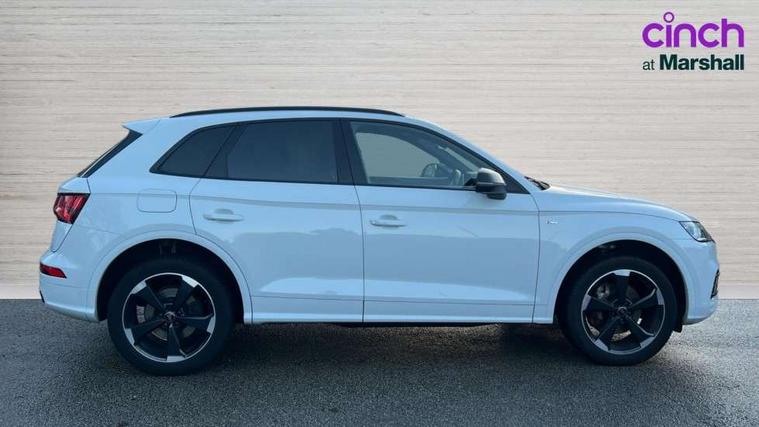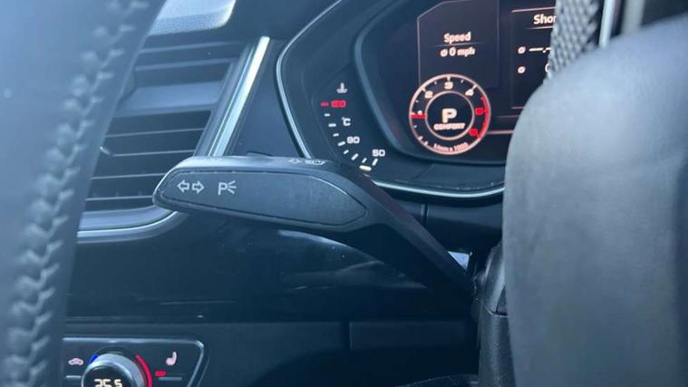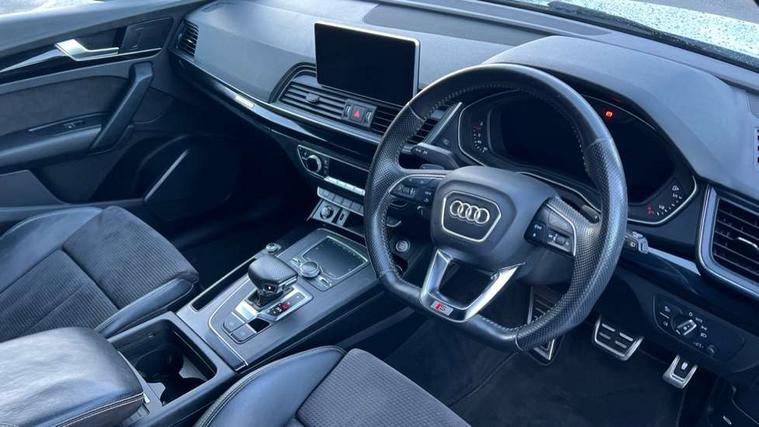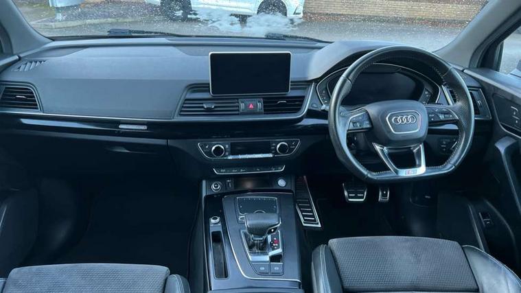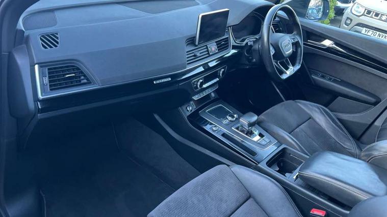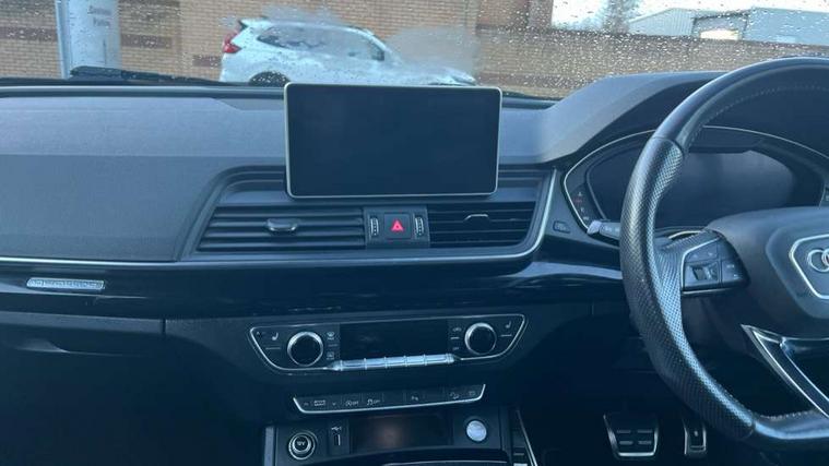 7" Colour driver information system, Audi connect infotainment services, Audi connect safety and service (e-call), Audi drive select, Audi parking system plus with front and rear sensors, Audi smartphone interface, Automatic start-stop system with coasting functionality and efficiency programme, Electro - mechanical power assisted steering, MMI Navigation, Mobile telephone preparation - bluetooth interface, Power tailgate, Service interval indicator, Voice control system, Diesel particulate filter, Dynamic suspension, Quattro on demand, 2x SD card slot, CD player, DAB Digital radio, MMI radio plus with 7" colour MMI screen and MMI controller, Acoustic windscreen, Air inlets in matt titanium black with blades in matt aluminium silver, Auto dimming rear view mirror, Automatic headlight levelling, Black roof rails, Body colour bumpers, Body colour rear diffuser with matt aluminium silver surrounds, Body colour underbody protection, Chrome exhaust tailpipe, Electric adjustable/heated/folding door mirrors, Front and rear electric windows, High beam assistant, LED headlights with LED rear lights + dynamic rear indicators, Light and rain sensor for auto activation of lights and windscreen wipers, Loading sill protector in stainless steel, Privacy glass with front acoustic glazing, Rear wiper, Titanium black door mirror housings, 2 x USB charging port with aux input socket, 3 rear headrests, 3 spoke flat bottom high multi-function leather steering wheel, 3 zone climate control, 40:20:40 split folding rear seat with rear centre armrest, Black cloth headlining, Contrast stitching on seats, steering wheel and gear lever gaiter, Front centre armrest, Front sports seats, Front/rear floor mats, Heated front seats, Height adjustable front head restraints, Height/reach adjustable steering column, ISOFIX child seat mounting and top tether, Luggage compartment carpet, Manual seat adjustment with 4-way electric lumbar support, Perforated leather gearknob, Removable luggage compartment floor, Stainless steel pedals, Sunvisors with vanity mirrors, Tool kit, Trunk roller cover, LED interior light pack - Q5, Non Smokers pack, Titanium black styling pack - Q5, 3 point seatbelts on all seats, 6 airbags - Driver, front passenger, curtain and side airbags, Electromechanical parking brake, Electronic stabilisation control including ABS, ASR and EDL, Front passenger airbag deactivation, Hill descent control, Hill hold assist, Multi collision brake assist, Pop-up bonnet for pedestrian protection, Pre sense city, Seat belt force limiter, Seatbelt monitoring, Tyre pressure warning, Warning triangle and first aid kit, Anti theft alarm, Anti-theft wheel bolts, Keyless Go access/ignition system, Remote central locking, Black piano finish inlays, 20" 5 arm rotor design sport alloy wheels in gloss anthracite black, diamond cut finish,