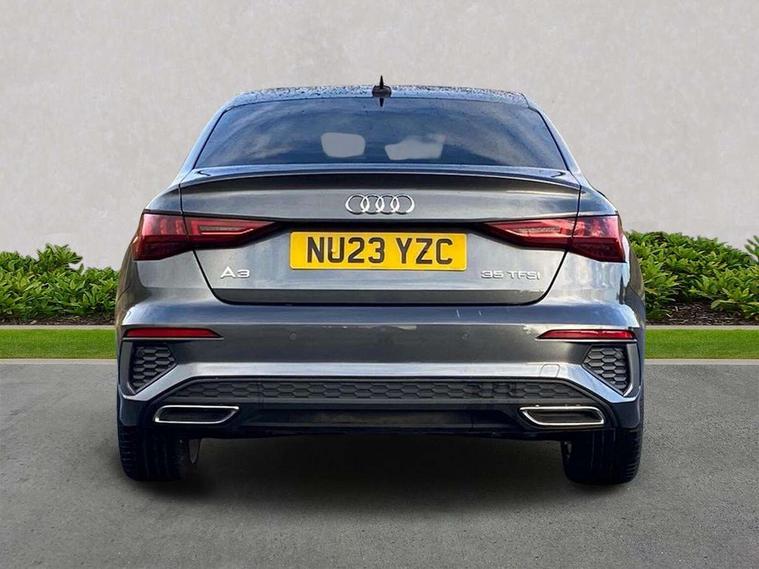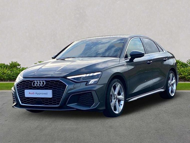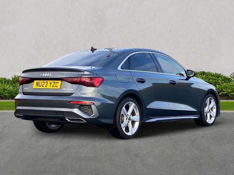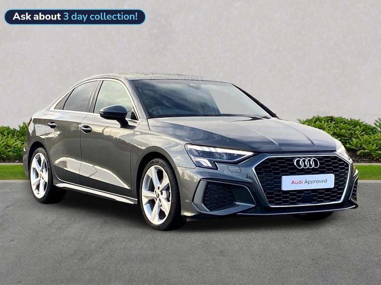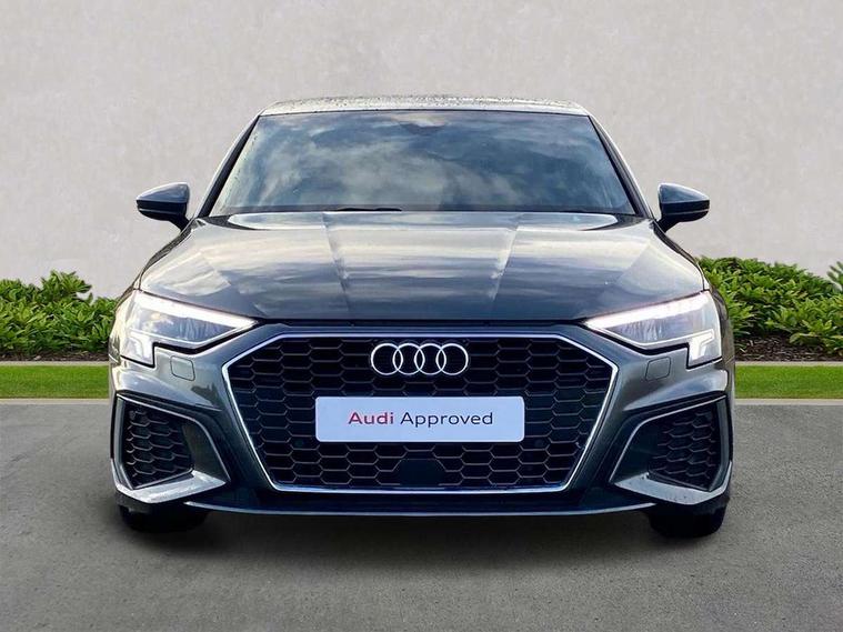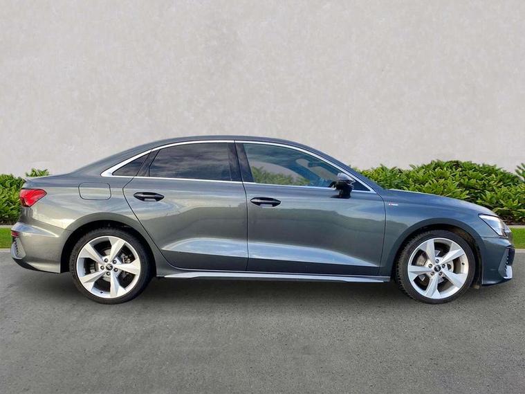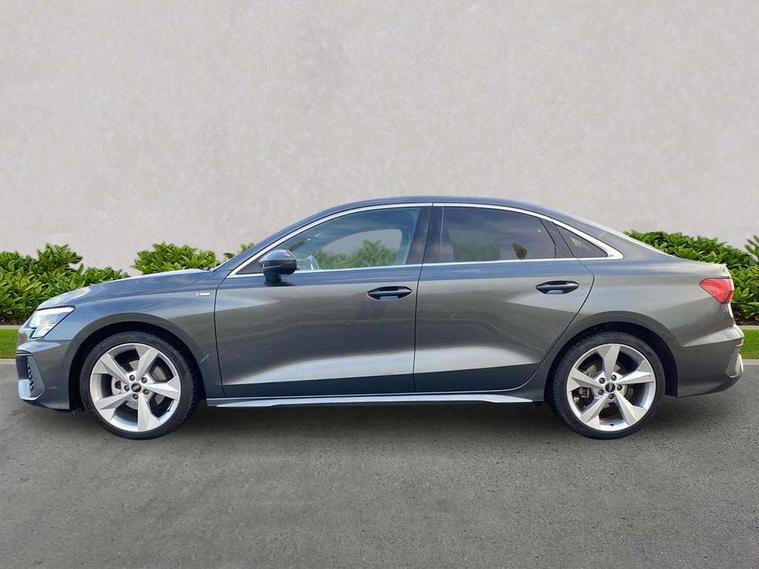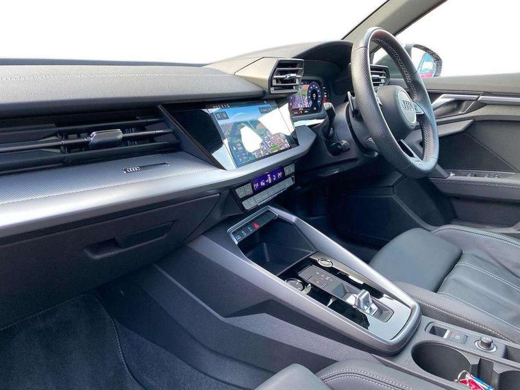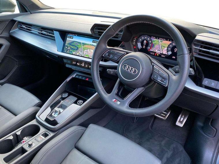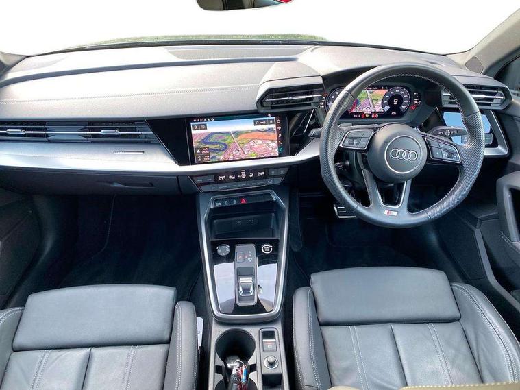 Audi connect emergency call and service, Audi drive select (Auto, Comfort, Dynamic, Efficiency and Individual), Audi smartphone interface, Audi Virtual Cockpit - 10.25" digital and colour instrument cluster, Automatic start/stop system with recuperation, Bluetooth interface, Collision avoidance assistant, Electromechanical power speed sensitive steering, Lane departure warning system, MMI Navigation Plus with high resolution 10.1" colour touch screen display, Service indicator, Voice control system with natural language interaction, Sports suspension, 2x USB Type C ports (for charging and data transfer), 6 passive loudspeakers, CD player, DAB Digital radio, 3rd brake light, Acoustic glass windscreen, Aluminium window trim, Auto dimming frameless rear view mirror, Body colour exterior mirrors, Electrically adjustable/heated/folding/auto dimming door mirrors with integrated LED indications + kerb view function for passenger side, Front electric windows, Illuminated door sills with aluminium inserts at the front with S logo, LED daytime running lights, LED headlights with LED rear lights and dynamic rear indicators, Light and rain sensors, Model and engine designation badges at rear, Privacy glass - dark tinted rear window, rear door and side windows, Rear boot, Rear electric windows, Rear side wing doors, S line bumpers, S roof spoiler, 12V socket and storage compartment in front centre console, 3 seat bench in 2nd row, 3 spoke leather multifunction steering wheel with gear shift paddles, 4 way electrically adjustable lumbar support for driver and front passenger, 60/40 split folding rear seat bench, Black cloth headlining, Dual zone electronic climate control, Front and rear centre armrest in leather, Front and rear headrests, Front/rear floor mats, Height and reach adjustable steering wheel, Interior lighting - glove compartment light and right hand side, Luggage compartment floor covering, Manual boot compartment lid, Manually adjustable front seats, Seat side bolsters, Single front passenger seat, Stainless steel pedals and front footrest in black, Twin leather upholstery with front sports seats S embossed logo, Aluminium interior elements pack - A3, LED interior lighting pack - A3 Saloon, S line styling pack - A3 Saloon, 3x3 point rear seat belts, Driver and front passenger airbag with passenger airbag deactivation, Electronic Stabilisation Control (ESC) including ABS, ASR and EDL, First aid kit with warning triangle and 2 safety vests, Front side airbags with head airbags and interaction airbag, Pre-sense front with pedestrian and cyclist detection, Seatbelt monitoring, Tyre pressure loss indicator, Anti theft alarm, Anti-theft wheel bolts, Electronically operated child locks, Immobiliser, Remote control central locking, Aluminium air vent surrounds, Dark spectrum aluminium inlays, accent surfaces in the dashboard and centre console in platinum grey silk effect paint finish,