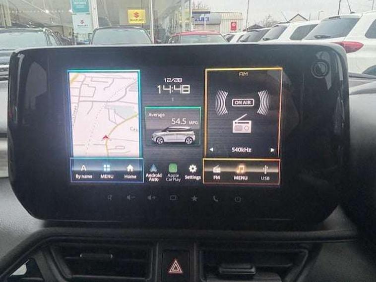 Adaptive cruise control, Automatic start/stop system, Blind spot monitoring, Colour LCD information display, Digital clock, Driver monitoring system, eCall, Fuel consumption display (average/instantaneous) and range display, Intelligent speed control support, Lane departure prevention, Lane departure warning system, Lane keeping assist (LKA), Low fuel level warning light, Navigation system, Outside temperature display, PAS, Rear cross traffic alert, Rear parking camera, Rear parking sensors, Remote fuel cap release, Smartphone integration with Apple CarPlay and Android auto, Suzuki connect, Tailgate, Traffic sign recognition, Weaving alert, 4 speakers + 2 tweeters, 9-inch infotainment display, Auxiliary input socket, Bluetooth audio streaming, DAB Digital radio, Steering wheel audio controls, USB Type A and C, 'Guide me home' headlamps, 1 speed with intermittent rear wiper + washer, 2 speeds front wiper with intermittent + washer, Automatic headlights, Black coloured A & B pillars, Black Upper and lower front grille, Body colour door mirrors and handles, C pillar trim moulding, Electric door mirrors, Electric front windows, Electric rear windows, Green tinted glass, Heated door mirrors, High beam assist, LED daytime running lights, LED High mounted stop light, LED position lamps, LED projector headlamps, LED rear combination lamp, Manual headlamp level control, Rain sensor, Rear fog lights, Rear privacy glass, Rear side wing doors, Rear spoiler, Side spoiler, 1 cup holder in rear, 12V Accessory socket in front console, 2 cup holders in front, 2 Isofix seat anchors, 3 bench rear seats in 2nd row, 3 rear head restraints, 3 spoke leather covered steering wheel, 60/40 split rear seats, Accessory socket, Centre console storage, Centre lower box, Child seat tether anchorages x 2, Chrome handbrake release button, Chrome interior door handles, Cloth upholstery, Door pockets with bottle holder, Driver/passenger sunvisors with ticket holders + vanity mirrors, Front cabin lights, Front headrests, Front map light, Front passenger side assist grip, Glovebox, Heated front seats, Heater, Height adjustable driver's seat, Luggage area lamp, Manual air conditioning with digital control panel, Material door trim ornament, Parcel shelf, Passenger seat back pocket, Pollen filter, Single front passenger seat, Tilt adjustable steering wheel, Tilt/telescopic adjustable steering wheel, 3 point ELR seatbelts for centre seat, 3 point ELR seatbelts front and rear, ABS+EBD+Brake assist, Curtain airbags, Driver airbag, Dual sensor brake support, ESP + traction control, Front and rear seatbelt reminder, Front passenger airbag, Front passenger airbag deactivation, Front seatbelt pretensioners with force limiters, Hill hold control, Rear child proof door locks, Rear seatbelts with pre-tensioners and load limiters, Side airbags with incorporated into front seats, Tyre pressure indicator, Deadlocks, Freewheeling key cylinders, Immobiliser, Keyless entry and start, Light - on and Key in reminder, Locking wheel nuts, Remote central locking, Painted instrument panel ornament, 16" Painted alloy wheels, Emergency flat tyre repair kit,