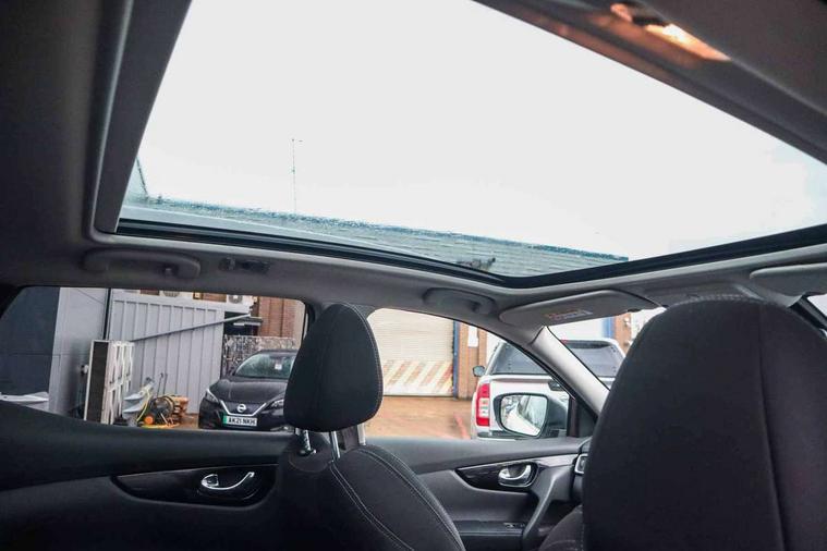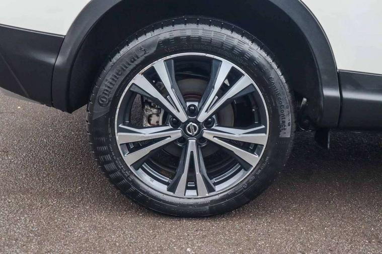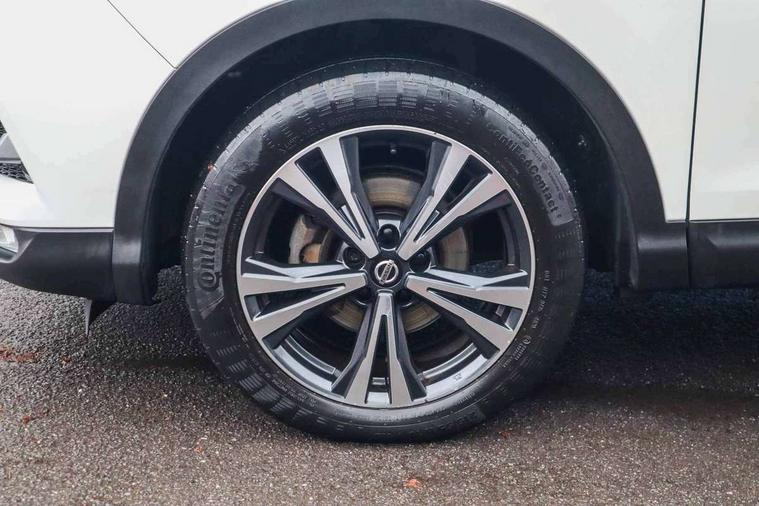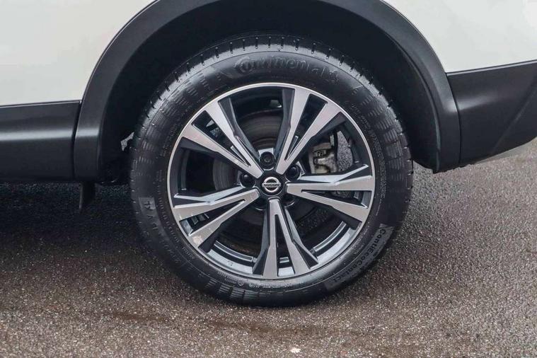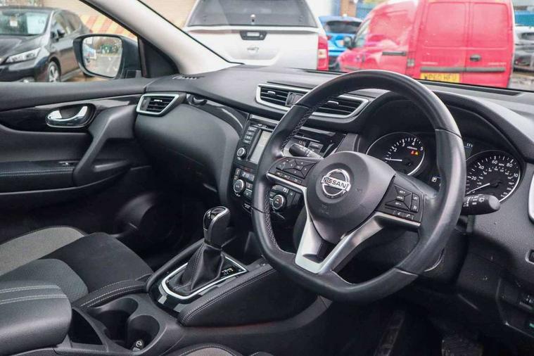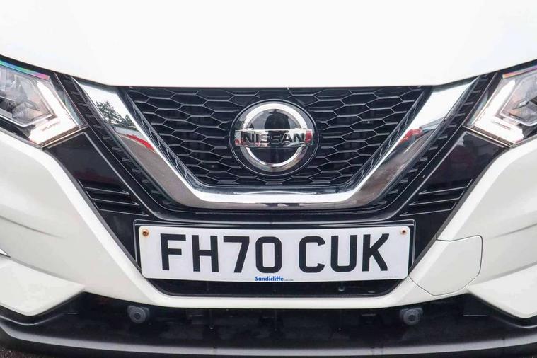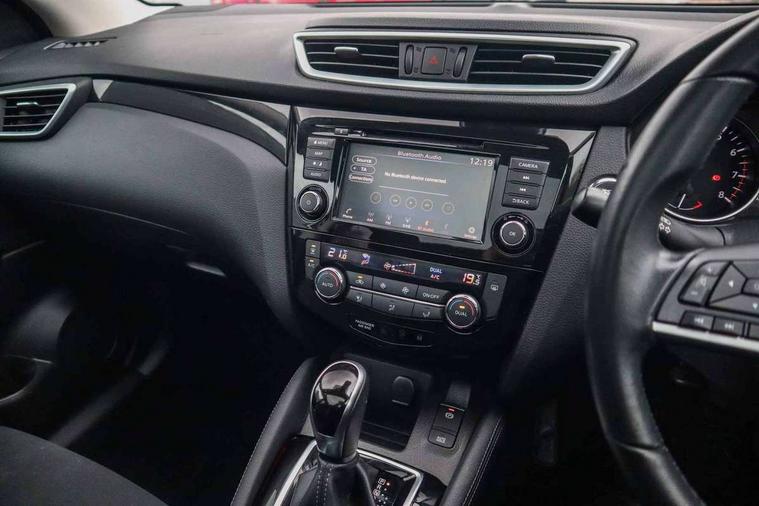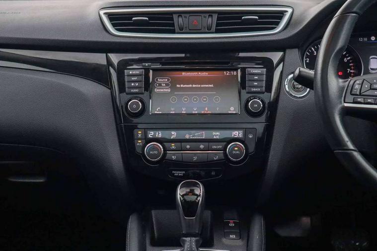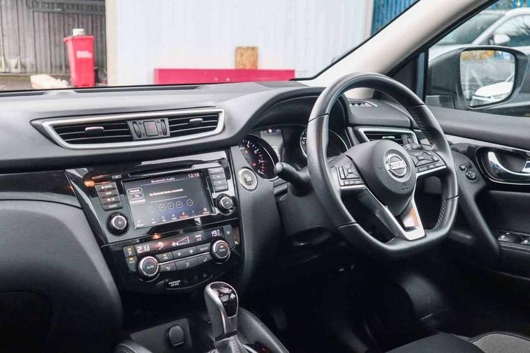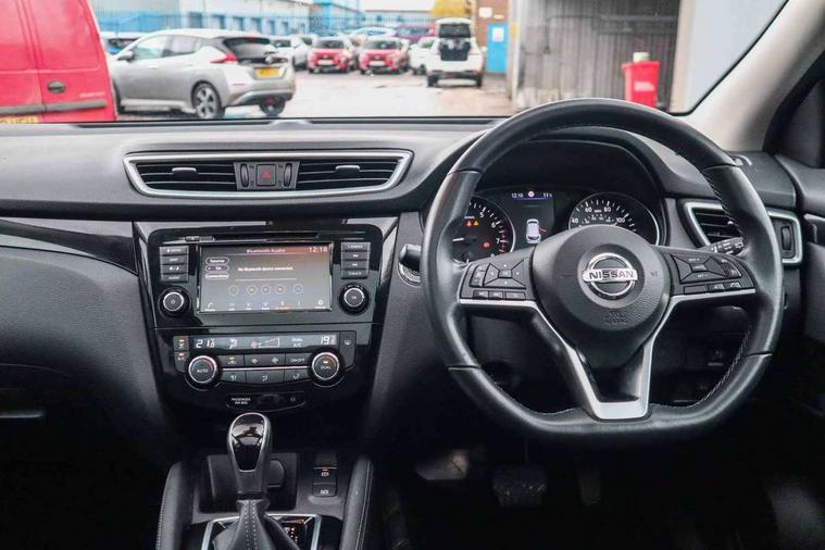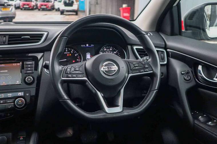 360 degree Intelligent around view monitor, Advanced drive assist display 5'' TFT coloured screen, Apple car play/Android Auto, Bluetooth connectivity, Cruise control + speed limiter, Electric speed sensitive power steering, Front parking sensors, Idle stop/start system, Intelligent park assist, Lane departure warning system, Nissan connect evo 7" touchscreen navigation and entertainment system, Normal or sport selectable steering, Outside temperature sensor, Premium Tomtom connected services, Push button starter, Rear parking sensors, Service interval indicator, Smartphone integration, Traffic sign recognition, Trip computer, Voice control system, Nissan chassis control (intelligent ride control, intelligent trace control, intelligent engine brake), 6 speakers, AM/FM radio, CD audio system, Aux-in socket, DAB Digital radio, Steering wheel mounted audio controls, USB port, Anti dazzle rear view mirror, Auto wipers, Body colour bumpers, Body coloured door handles, Body coloured door mirrors, Chrome window surround, Daytime running lights dip function when turn signal applied, Electric folding door mirrors, Electric front and rear windows with one touch illuminated window controls, Electrically adjustable door mirrors, Front fog lights, Halogen headlights, Heated door mirrors, High beam assist, Intelligent auto headlights, LED indicators in door mirrors, Matt silver roof rails, Privacy glass, Rear roof spoiler, Rear wiper with reverse link, Shark fin antenna, Signature LED daytime running lights, Silver rear styling plate, Underbody vortex generators, 2 X front 12v power sockets, 3 height adjustable rear headrests, 60/40 split folding rear seat, Ambient interior lighting, Ambient lighting around centre console, Bi-colour cloth upholstery, Boot lighting, Centre console storage box/armrest, Chrome interior door handles, Driver's seat manual height adjust, Dual zone climate control, Front and rear door pockets with bottle holders, Front and rear seat belt pre-tensioners with load limiters, Height adjustable front headrests, ISOFIX restraints on outer rear seats x2, Leather D shaped steering wheel, Leather gear lever, Leather knee pad, Luggage board system, Manual height adjustable passenger seat, Manual lumbar support on driver seat, Manual lumbar support on passenger seat, Monoform front sport seats with plastic backboard, Parcel shelf stow function under luggage board, Pollen filter, Rear armrest with 2 cupholders, Synthetic leather wrapped door handle with contrasting stitching, Tilt/telescopic adjustable steering wheel, Velour floor mats, Glass roof pack - Qashqai, 6 airbags - Driver, front passenger, curtain and side airbags, ABS, ESP, EBD and brake assist, Auto hold function, Child locks on rear doors, Electronic parking brake, Front and rear seat belt warning, Height adjustable front seatbelts, Hill start assist, Intelligent emergency braking with pedestrian recognition, Manual passenger airbag deactivation function, Three 3 point rear seatbelts, Tyre pressure monitoring system, Anti-theft immobiliser, Intelligent Key, Remote central locking, Thatcham Cat.1 alarm, Carbon graphite dash trim, 18" Two tone alloy wheels,