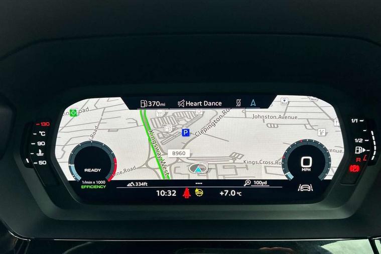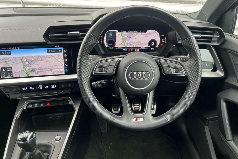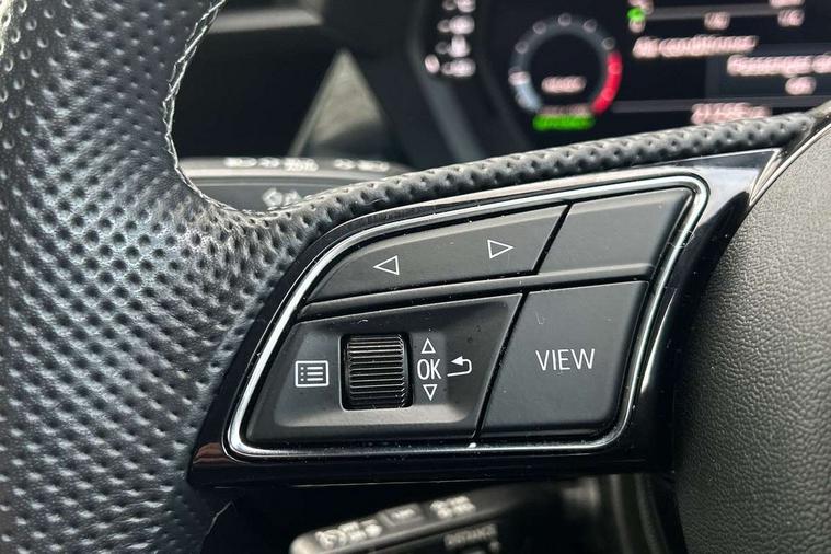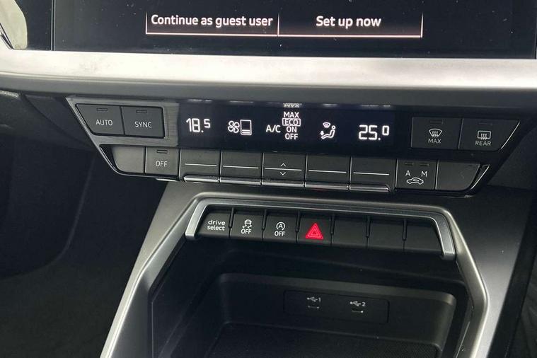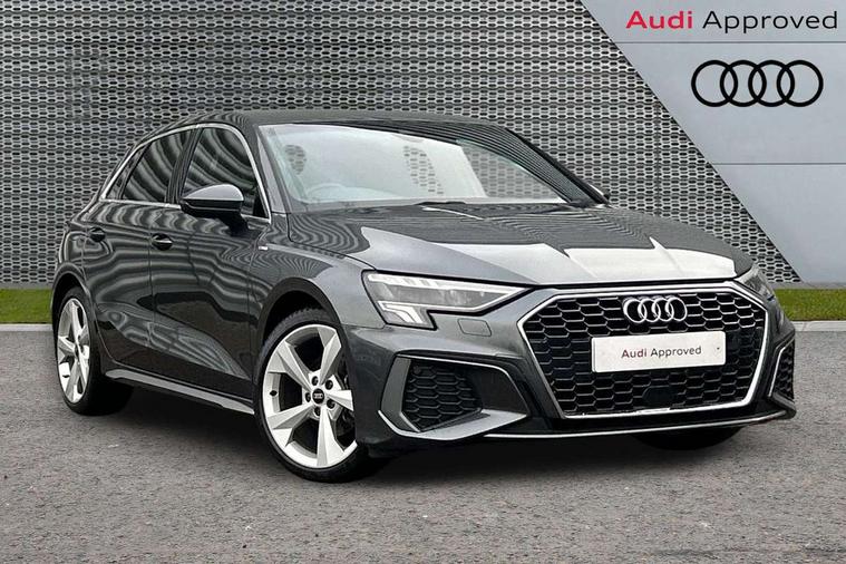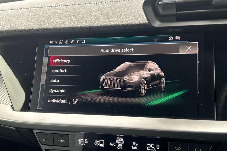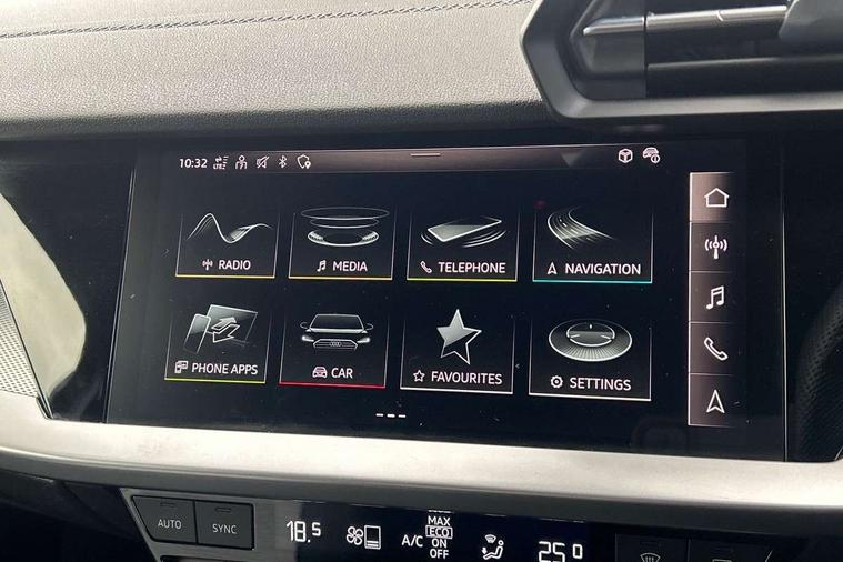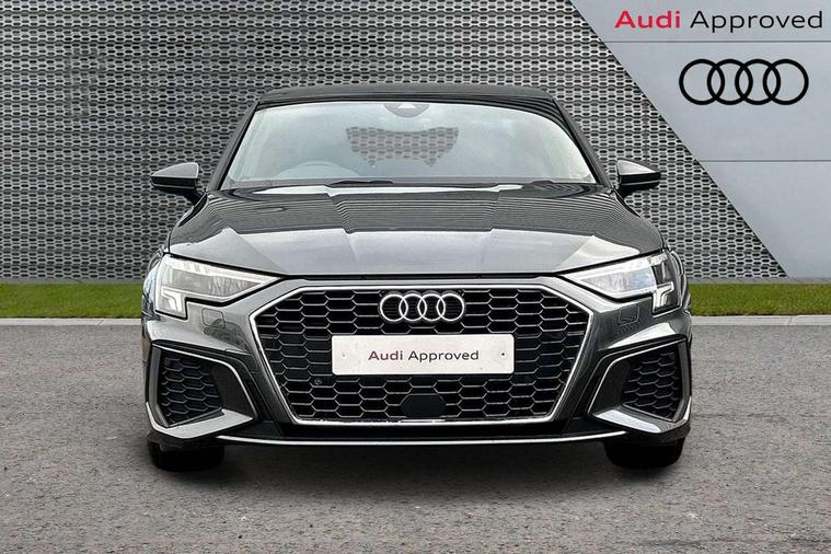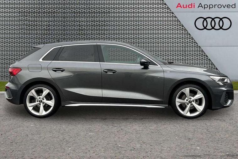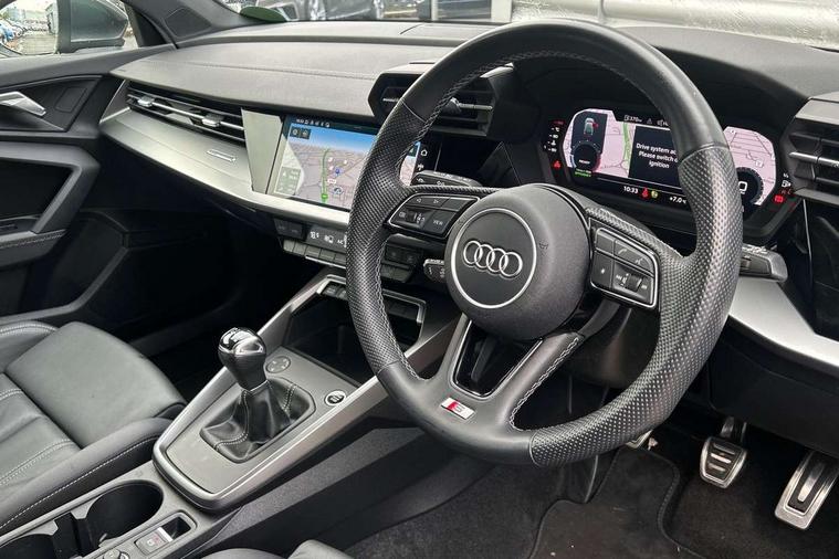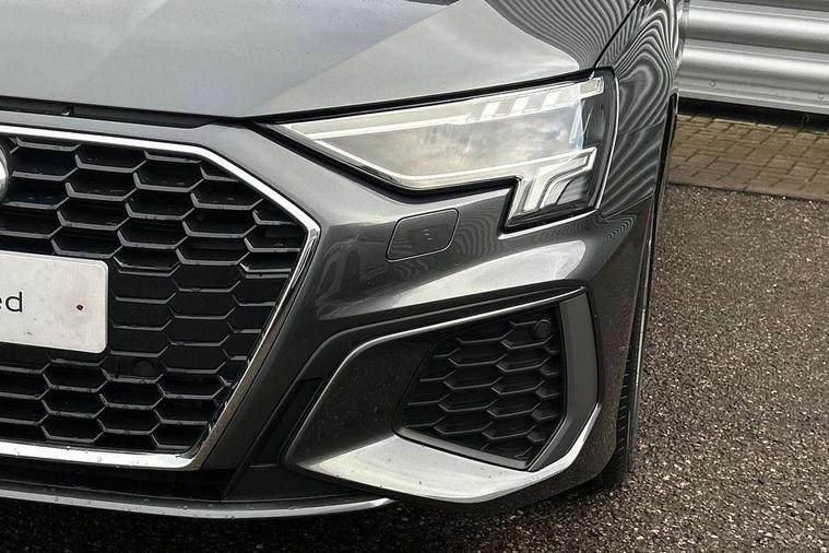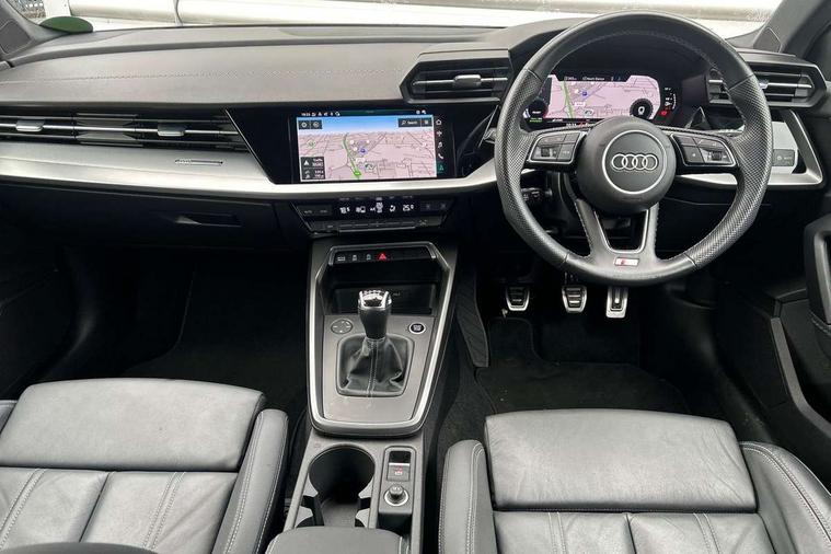 Audi drive select (Auto, Comfort, Dynamic, Efficiency and Individual), Audi smartphone interface, Audi Virtual Cockpit - 10.25" digital and colour instrument cluster, Automatic start/stop system with recuperation, Bluetooth interface, Collision avoidance assistant, Cruise control, e-Call (emergency call), Electromechanical power speed sensitive steering, Lane departure warning system, MMI Navigation Plus with high resolution 10.1" colour touch screen display, Rear parking sensors, Service indicator, Trip computer, Voice control system with natural language interaction, Sports suspension, 2xUSB-C connection with data and charging functions, 6 passive loudspeakers, DAB Digital radio, 3rd brake light, Acoustic glass windscreen, Aluminium window trim, Auto dimming frameless rear view mirror, Body colour exterior mirrors, Electrically adjustable/heated/folding/auto dimming door mirrors with integrated LED indications + kerb view function for passenger side, Front electric windows, Illuminated aluminium inserts front door sills with S logo, LED daytime running lights, LED headlights with LED rear lights and dynamic rear indicators, Light and rain sensors, Privacy glass - dark tinted rear window, rear door and side windows, Rear electric windows, Rear side air outlets in grained matt black, Rear side wing doors, Rear wiper, S line bumpers, S roof spoiler, 12V socket and storage compartment in front centre console, 3 seat bench in 2nd row, 3 spoke leather multifunction steering wheel, 40/20/40 split folding rear seat bench with cupholder, Black cloth headlining, Dual zone electronic climate control, Front and rear centre armrest in leather, Front and rear headrests, Front/rear floor mats, Height and reach adjustable steering wheel, Illuminated vanity mirror, Interior lighting - glove compartment light and right hand side, Luggage compartment floor covering, Manual boot compartment lid, Manually adjustable front seats, Seat side bolsters, Single front passenger seat, Stainless steel pedals and front footrest in black, Twin leather upholstery with front sports seats S embossed logo, Aluminium interior elements pack - A3 Sportback, LED interior lighting pack - A3 Sportback, S line styling pack - A3 Sportback, 3x3 point rear seat belts, Audi pre sense front, Driver and front passenger airbag with passenger airbag deactivation, Electronic Stabilisation Control (ESC) including ABS, ASR and EDL, First aid kit with warning triangle and 2 safety vests, Front side airbags with head airbags and interaction airbag, Pre-sense front with pedestrian and cyclist detection, Seatbelt monitoring, Tyre pressure loss indicator, Anti theft alarm, Anti-theft wheel bolts, Electronically operated child lock, Immobiliser, Remote control central locking, Accent surfaces in the dashboard and centre console in platinum grey silk effect paint finish, Dark spectrum aluminium inlays,