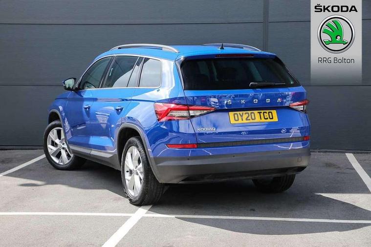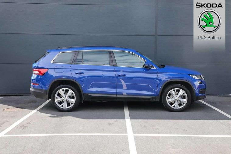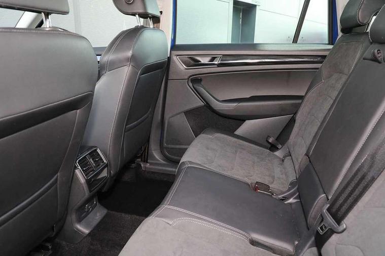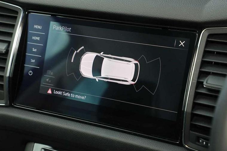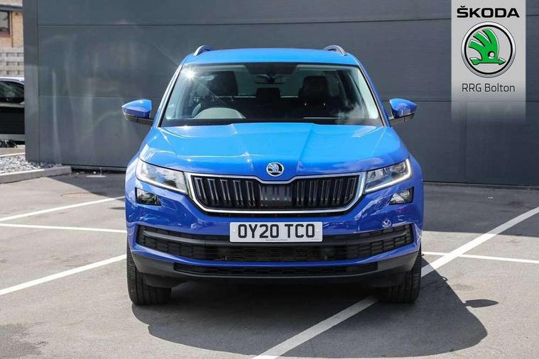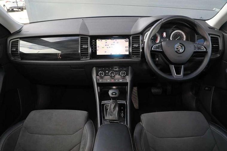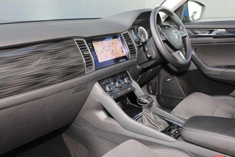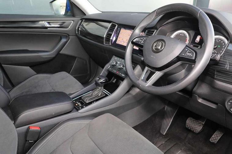 Bluetooth system, Colour multifunction trip computer, Columbus satellite navigation with 9.2" touch screen and integrated Wi-Fi + WLAN, Digital voice enhancement, ECO Stop/start function, Exterior temperature indicator, Map care, SmartLink plus, Speed limiter, Bolero Radio, DAB Digital radio, DVD System, USB and SD card connectivity, Aero front windscreen wipers with intermittent function, Aero rear window wiper, Auto dimming rear view mirror, Automatic activation of hazard warning lights, Black electric window control buttons, Black wheel arch surrounds, Body colour bumpers, Body colour door mirrors and handles, Electric front and rear windows, Electrically adjustable, heated and folding door mirrors, Front and Rear door steps, Full LED Headlights with adaptive front light system and LED daytime running lights, Headlight washers, Heated rear window, Invisible tailpipe, LED front fog lights with static cornering light function, LED rear fog light, LED third brake light in rear spoiler, Light assistant (coming home/tunnel light), Radiator grille frame in black with chrome strip, Rain and light sensors, Rear spoiler, Safety reflectors on front and rear doors, Sunset privacy glass, 12V socket in boot, 2 rails with 2 hooks including 4 hooks for net programme, 4 foldable roof handles with rear coat hooks, 4 lashing points on luggage floor, 60:40 foldable rear seat with sliding adjustment and backrest angle adjustment, Bottle holders in door panel in the 1.5 litre front and 1 litre rear, Cargo storage compartments, Centre console with open storage box, cup holder and 12V socket, Chrome headlight control button, Chrome interior door handles, Coat hooks on B pillar, Covered storage compartment on driver side, Front and rear door armrest with black adductor trim, Front centre armrest with storage compartment, Front courtesy lights, Gear shift lever with chrome frame and black gloss insert, Height adjustable front headrests, Height adjustable rear headrests, Illuminated and cooled glovebox, Illuminated luggage compartment, Isofix system on outer rear seats, Manually adjustable steering column, Net programme in boot (1x horizontal Net, 2x vertical Nets), Overhead glasses storage compartment, Pollen filter, Rear centre armrest with cupholders, Roll up luggage compartment cover with intermediate position, Small Bags on the inner sides of the front backrests, Small pockets on the inner side of the front backrests, Storage compartment in lower middle Instrument panel, illuminated with closing, Three rear height adjustable headrests, Ticket holder on A Pillar, Umbrella in door panel, Chrome pack - Kodiaq, Auto door release and activation of warning lights, Driver and passenger airbags, Electronic parking brake with hill hold control, Emergency rear braking signal, ESC (incl. ABS+MSR+ASR+EDS+HBA+DSR+RBS+MKB), Front and rear three point safety belt on all seats, Front assist includes AEB city/urban, Front side airbags, Fuel cut off safety device, Head and knee airbags, Passenger airbag deactivate switch, Rear disc brakes, Safety vest holder in door, Seat belt reminder for all seats, Tailgate unlocking from outside, Two tone horn, Tyre pressure monitor, Warning lights in front doors, Alarm with interior monitoring and tilt sensor with safe function, Immobiliser, Keyless entry and start system (KESSY), Remote central locking,