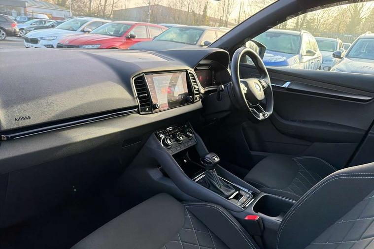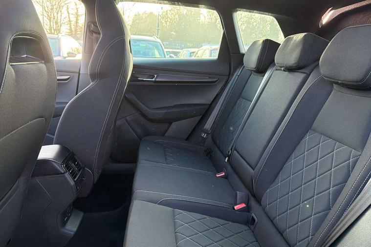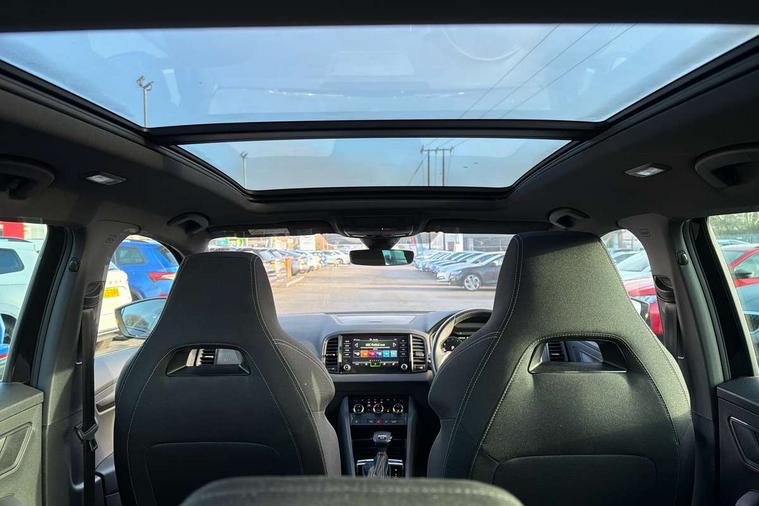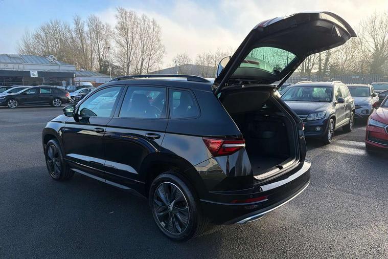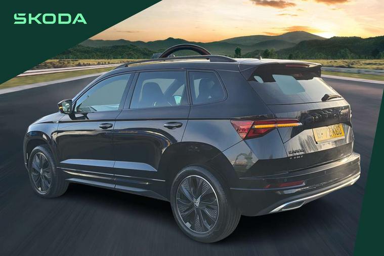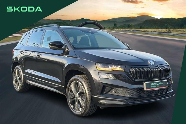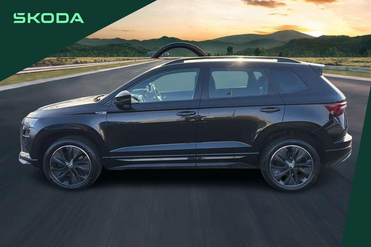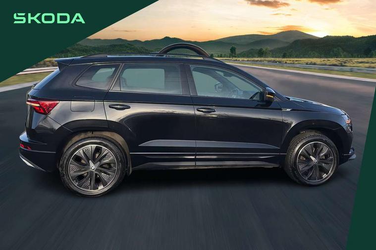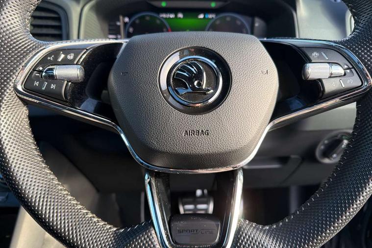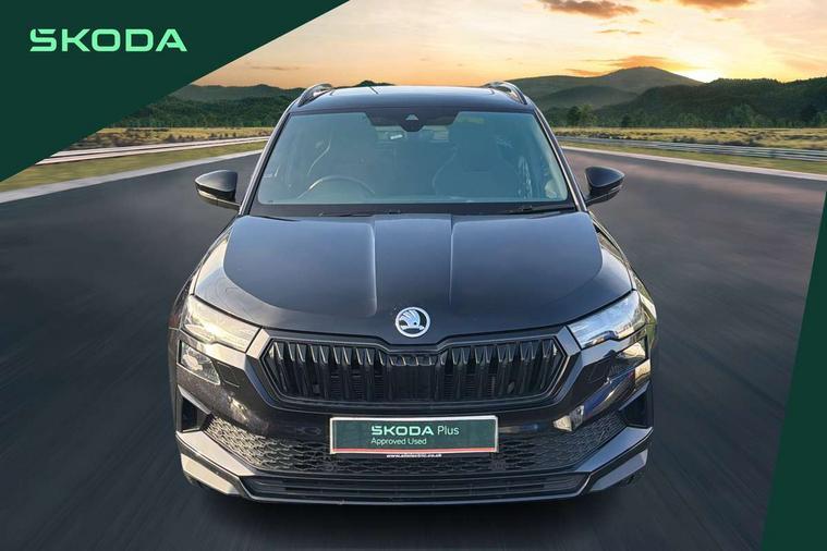 8" Digital display, Care connect, Colour multifunction trip computer, Driver fatigue sensor, Emergency services call system, Outside temperature gauge, Service interval indicator, SmartLink wireless for Apple and wired for Android, Start/stop system with regenerative braking, USB C Port x 2 in front centre console, Virtual pedal with electrically operated boot door, 8 Speakers, DAB radio with Bluetooth, USB connection, Acoustic glass, Aero front windscreen wipers with intermittent function, Auto dimming rear view mirror with light and rain sensors, Automatic headlight control system, Black door mirrors, Black electric window control buttons, Black radiator grille, Black roof rails, Body colour door handles, Electric front and rear windows with child proof lock, Front door steps with SportLine logo, Heated rear windscreen, LED daytime running lights, LED rear lights with high functionality welcome effect and dynamic indicators, Light assistant (coming/leaving home/tunnel light), Panoramic sliding sunroof, Plastic scuff plates, Privacy glass, Protective door side sills in body colour, Rear diffuser, Rear side wing doors, Rear spoiler, Rear window wiper with washer system and intermittent control, Safety reflectors on front doors, Skoda lettering on tailgate in black, Sportline badge on front fender, Sportline decorative inserts with badging, Sports front and rear bumpers, 1.5 litre bottle holders in driver and front passenger door panels, 12V socket in boot, 12v socket in front centre armrest with storage compartment and rear air vents, 2 Folding hooks and nets in boot, 3 rear height adjustable headrests, 3 seat bench in 2nd row, 3 spoke leather sports multifunction steering wheel and silver stitching with gear shift paddles, 4 foldable roof handles with rear coat hooks, Black floor carpet, Black roof headlining, Chrome inner door handles, Double sided boot floor, Foldable hooks in the boot, Front head restraints, Height adjustable front three point seats belts with tensioners, Height/reach adjust steering wheel, Ice scraper, Illuminated glovebox, Illuminated luggage compartment, Interior noise suppression, Isofix child seat preparation outer rear, Manual lumbar support for front seats, Pen holder, Pollen filter, Rear boot cover, Rear reading lights, Rear seats fixed folding and divided 60:40, Rubbish bin door, Safety vest holder, Single front passenger seat, Storage box in upper central dashboard closed, Sunvisors with illuminated vanity mirrors, Textile floor mats, Ticket holder, Titan black interior ceiling, Welcome animation with sportline logo, Light Pack - Karoq, Parking pack - Karoq, Automatic door unlocking in case of crash, Automatic fuel cut off in case of crash, Child locks on rear doors, Driver airbag, Electronic parking brake with auto hold function, Emergency rear braking signal, ESC including ABS, MSR, ASR, EDS, HBA, DSR, RBS, MKB and traction control, Front side airbags, Hill hold control, Knee airbags, Passenger airbag with switch-off function, Pedestrian monitor, Seatbelt reminder signalisation and pretensioner for all seats, Three point seatbelts rear, Two tone horn, Tyre pressure display, Tyre pressure monitor, Alarm with interior monitoring, back up horn and tilt sensor with safe function, Electronic engine immobiliser, Keyless entry and start/stop, Remote central locking with 2 remote folding keys, Black air vent surround, Black centre console, Satin black dashboard, Satin black door trim, 19" Sagitarius anthracite alloy wheels with matt black aero inserts, Anti-theft wheel bolts protection, Matt black aero hub caps, Storage on wheel cover, Tool kit,