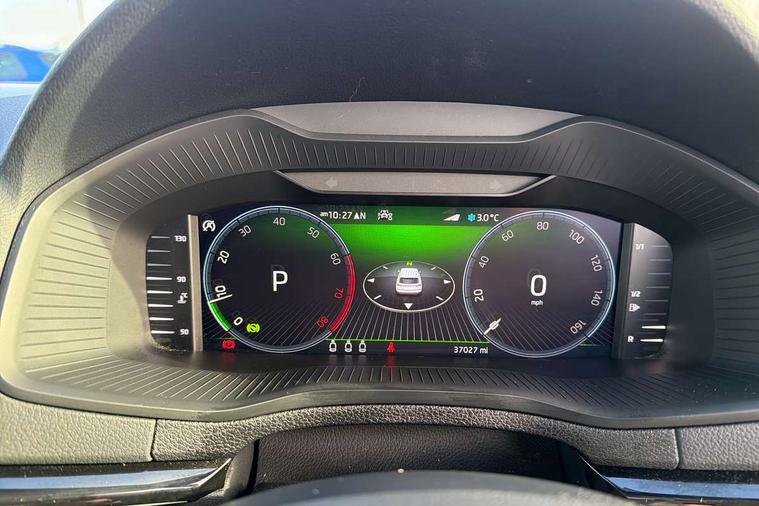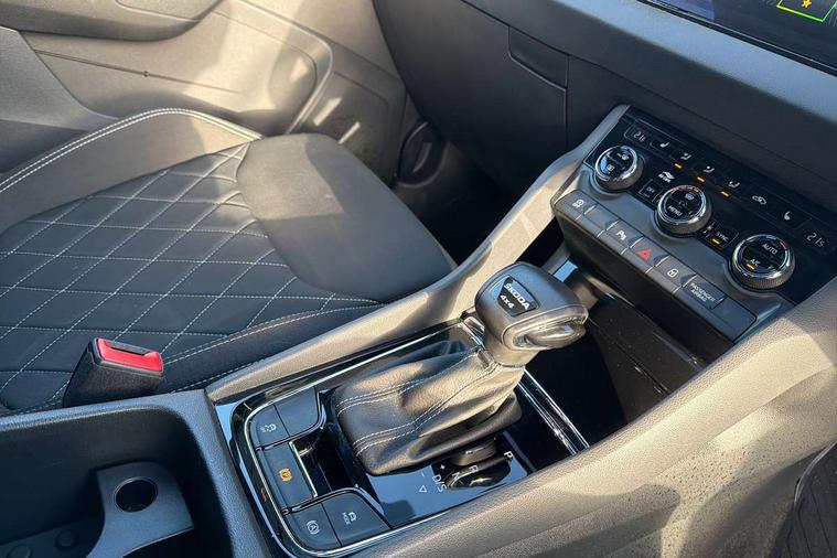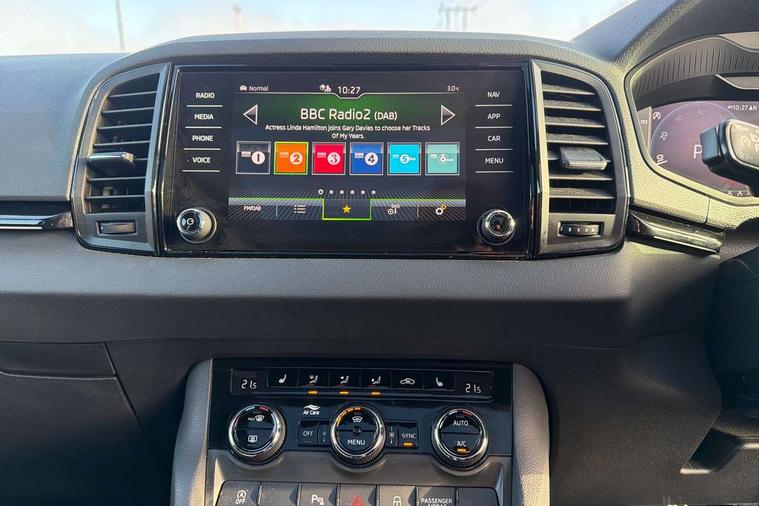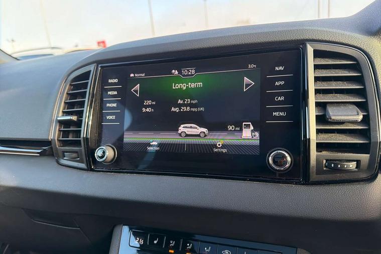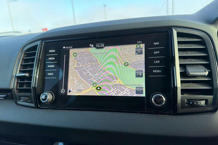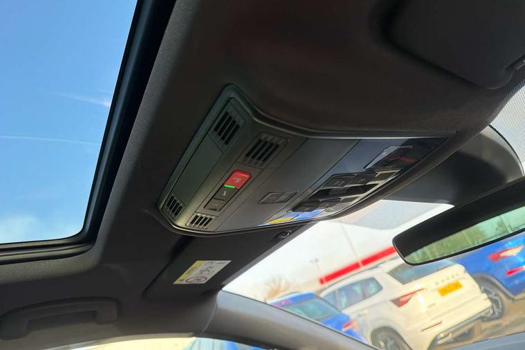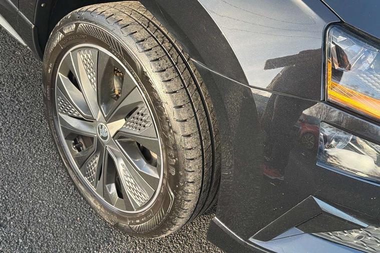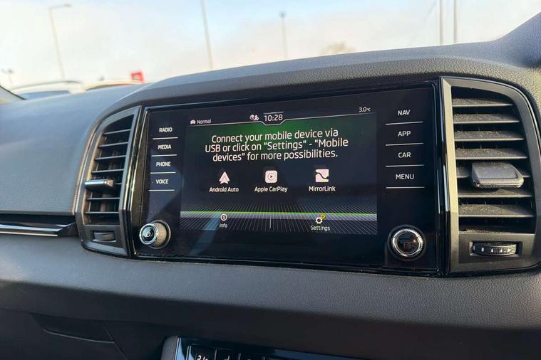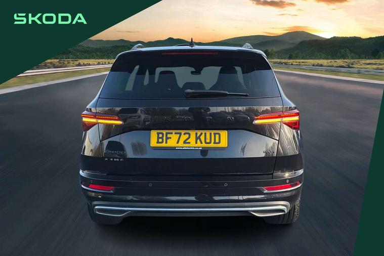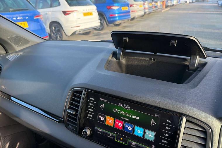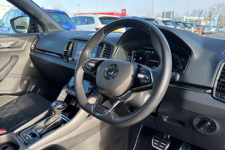 8" Digital display, Care connect, Colour multifunction trip computer, Driver fatigue sensor, Emergency services call system, Outside temperature gauge, Service interval indicator, SmartLink wireless for Apple and wired for Android, Start/stop system with regenerative braking, USB C Port x 2 in front centre console, Virtual pedal with electrically operated boot door, 8 Speakers, DAB radio with Bluetooth, USB connection, Acoustic glass, Aero front windscreen wipers with intermittent function, Auto dimming rear view mirror with light and rain sensors, Automatic headlight control system, Black door mirrors, Black electric window control buttons, Black radiator grille, Black roof rails, Body colour door handles, Electric front and rear windows with child proof lock, Front door steps with SportLine logo, Heated rear windscreen, LED daytime running lights, LED rear lights with high functionality welcome effect and dynamic indicators, Light assistant (coming/leaving home/tunnel light), Panoramic sliding sunroof, Plastic scuff plates, Privacy glass, Protective door side sills in body colour, Rear diffuser, Rear side wing doors, Rear spoiler, Rear window wiper with washer system and intermittent control, Safety reflectors on front doors, Skoda lettering on tailgate in black, Sportline badge on front fender, Sportline decorative inserts with badging, Sports front and rear bumpers, 1.5 litre bottle holders in driver and front passenger door panels, 12V socket in boot, 12v socket in front centre armrest with storage compartment and rear air vents, 2 Folding hooks and nets in boot, 3 rear height adjustable headrests, 3 seat bench in 2nd row, 3 spoke leather sports multifunction steering wheel and silver stitching with gear shift paddles, 4 foldable roof handles with rear coat hooks, Black floor carpet, Black roof headlining, Chrome inner door handles, Double sided boot floor, Foldable hooks in the boot, Front head restraints, Height adjustable front three point seats belts with tensioners, Height/reach adjust steering wheel, Ice scraper, Illuminated glovebox, Illuminated luggage compartment, Interior noise suppression, Isofix child seat preparation outer rear, Manual lumbar support for front seats, Pen holder, Pollen filter, Rear boot cover, Rear reading lights, Rear seats fixed folding and divided 60:40, Rubbish bin door, Safety vest holder, Single front passenger seat, Storage box in upper central dashboard closed, Sunvisors with illuminated vanity mirrors, Textile floor mats, Ticket holder, Titan black interior ceiling, Welcome animation with sportline logo, Light Pack - Karoq, Parking pack - Karoq, Automatic door unlocking in case of crash, Automatic fuel cut off in case of crash, Child locks on rear doors, Driver airbag, Electronic parking brake with auto hold function, Emergency rear braking signal, ESC including ABS, MSR, ASR, EDS, HBA, DSR, RBS, MKB and traction control, Front side airbags, Hill hold control, Knee airbags, Passenger airbag with switch-off function, Pedestrian monitor, Seatbelt reminder signalisation and pretensioner for all seats, Three point seatbelts rear, Two tone horn, Tyre pressure display, Tyre pressure monitor, Alarm with interior monitoring, back up horn and tilt sensor with safe function, Electronic engine immobiliser, Keyless entry and start/stop, Remote central locking with 2 remote folding keys, Black air vent surround, Black centre console, Satin black dashboard, Satin black door trim, 19" Sagitarius anthracite alloy wheels with matt black aero inserts, Anti-theft wheel bolts protection, Matt black aero hub caps, Storage on wheel cover, Tool kit,