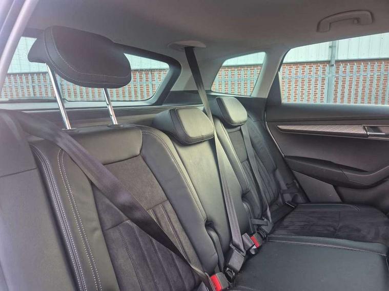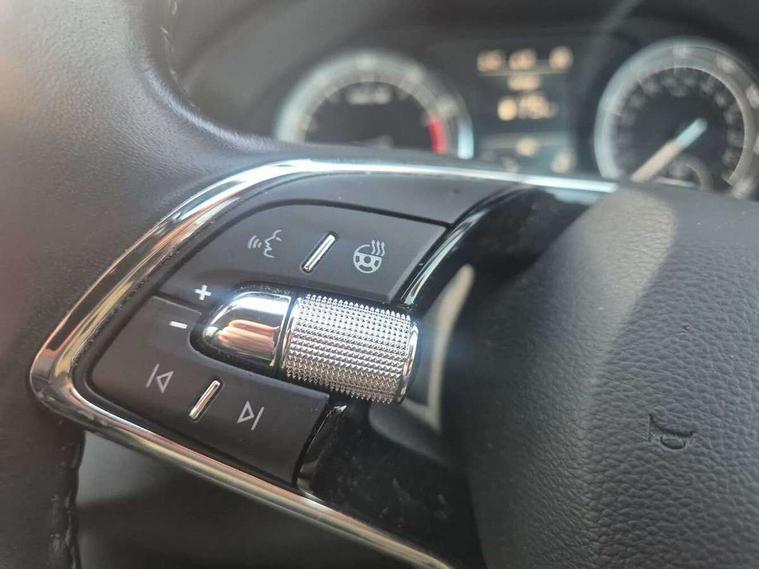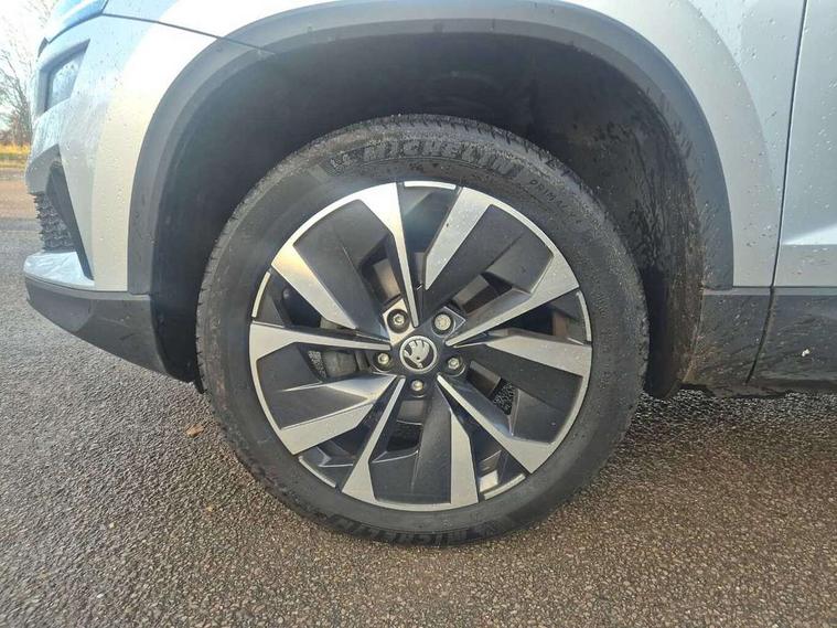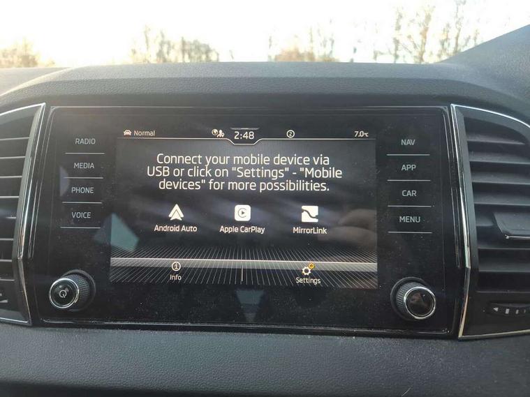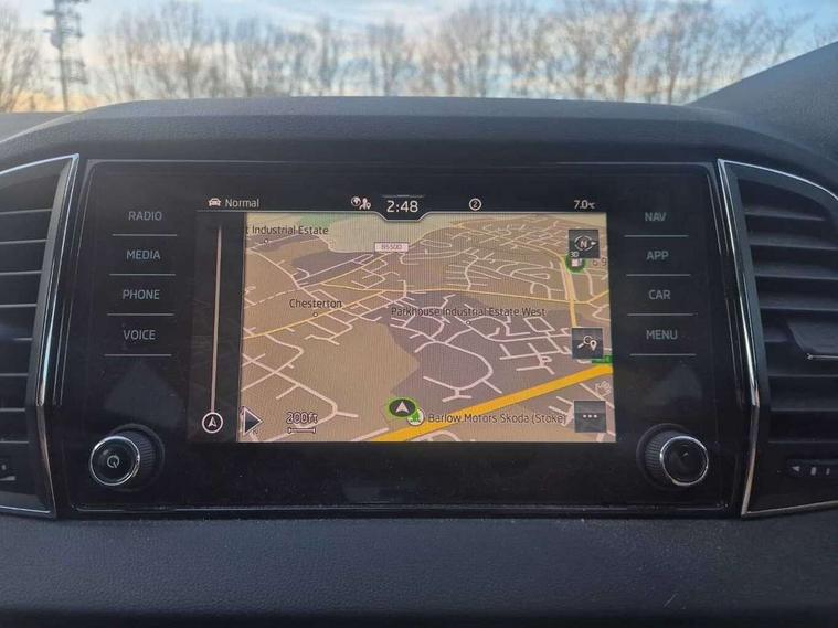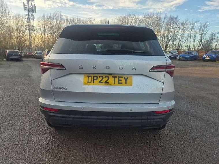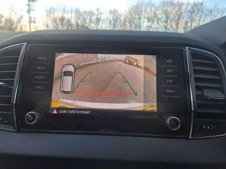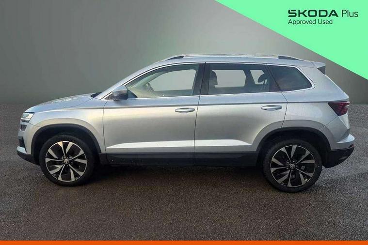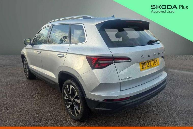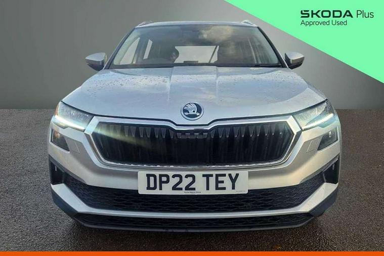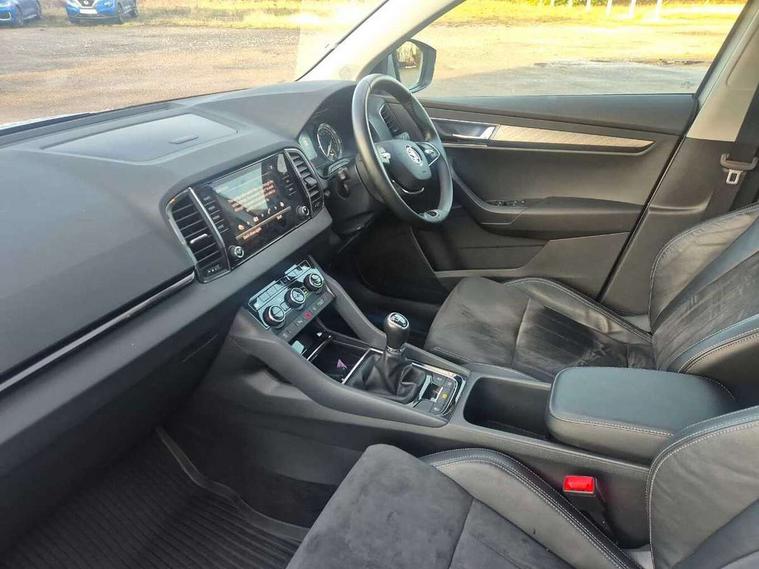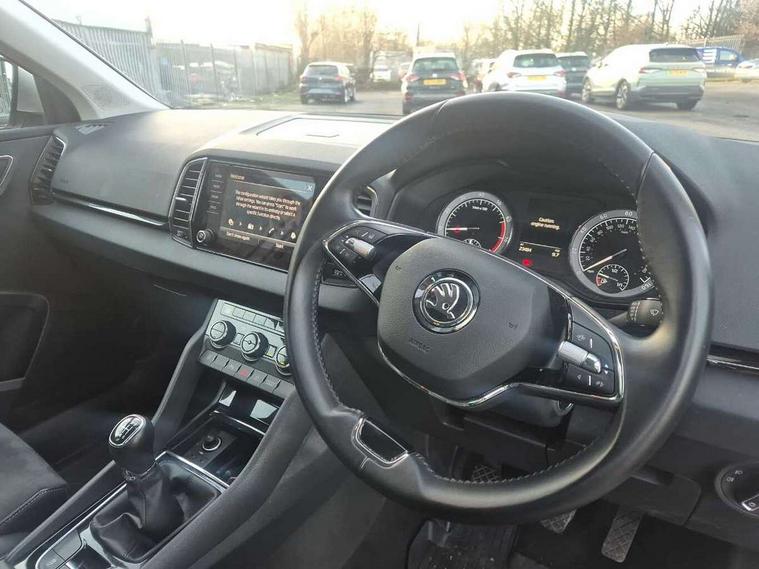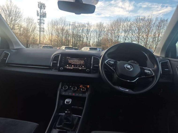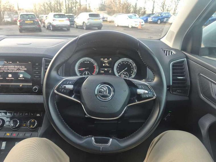 Care connect, Drive mode selector, Driver fatigue sensor, Electro-mechanical PAS, Emergency services call system, Multifunction colour trip computer, Outside temperature gauge, Service interval indicator, SmartLink wireless for Apple and wired for Android, Start/stop system with regenerative braking, USB C Port x 2 in front centre console, 8 Speakers, DAB radio with Bluetooth, USB connection, Acoustic glass, Aero front windscreen wipers with intermittent function, Auto dimming rear view mirror with light and rain sensors, Automatic headlight control system, Black electric window control buttons, Body colour door mirrors and handles, Body coloured bumpers, Electric front and rear windows with child proof lock, Electrically adjustable heated folding and auto dimming door mirrors, Heated rear windscreen, LED daytime running lights, LED Headlights, LED rear lights with high functionality welcome effect and dynamic indicators, Light assistant (coming/leaving home/tunnel light), Privacy glass, Rear side wing doors, Rear spoiler, Rear wiper, Safety reflectors on front doors, Third brake light, 1.5 litre bottle holders in driver and front passenger door panels, 12V socket in boot, 12v socket in front centre armrest with storage compartment and rear air vents, 2 Folding hooks and nets in boot, 2 spoke leather heated multifunction steering wheel, 2 x Tablet holder, 3 rear height adjustable headrests, 3 seat bench in 2nd row, 4 foldable roof handles with rear coat hooks, Black floor carpet, Chrome inner door handles, Decorative door sills with KAROQ badging, Double sided boot floor, Foldable hooks in the boot, Folding tables on the front seat backrests, Front head restraints, Height adjustable driver and passenger seat, Height adjustable front three point seats belts with tensioners, Height/reach adjust steering wheel, Ice scraper, Illuminated and cooled glovebox, Illuminated luggage compartment, Isofix child seat preparation for front passenger seat, Isofix child seat preparation outer rear, Manual lumbar support for front seats, Pen holder, Pollen filter, Rear boot cover, Rear reading lights, Retractable parcel shelf attachable to tailgate, Rubbish bin door, Safety vest holder, Single front passenger seat, Storage box in upper central dashboard closed, Sunvisors with illuminated vanity mirrors, Textile floor mats, Umbrella under passenger seat, VarioFlex seats with standard rear seat release, Chrome roof rails + chrome pack - Karoq, Parking pack - Karoq, Airbags - Front side, head, knee and curtain, Automatic door unlocking in case of crash, Automatic fuel cut off in case of crash, Child locks on rear doors, Driver airbag, Electronic parking brake with auto hold function, Emergency rear braking signal, ESC including ABS, MSR, ASR, EDS, HBA, DSR, RBS, MKB and traction control, Front assist radar scanning of the space in front of the car with automatic braking, Hill hold control, Passenger airbag with switch-off function, Pedestrian monitor, Seatbelt reminder signalisation and pretensioner for all seats, Three point seatbelts rear, Two tone horn, Tyre pressure display, Tyre pressure monitor, Alarm with interior monitoring, back up horn and tilt sensor with safe function, Electronic engine immobiliser, Keyless entry and start/stop system with SAFE system, Remote central locking with 2 remote folding keys, Chrome framed air vents, 18" Miran alloy wheels in black, Anti-theft wheel bolts protection, Storage on wheel cover,