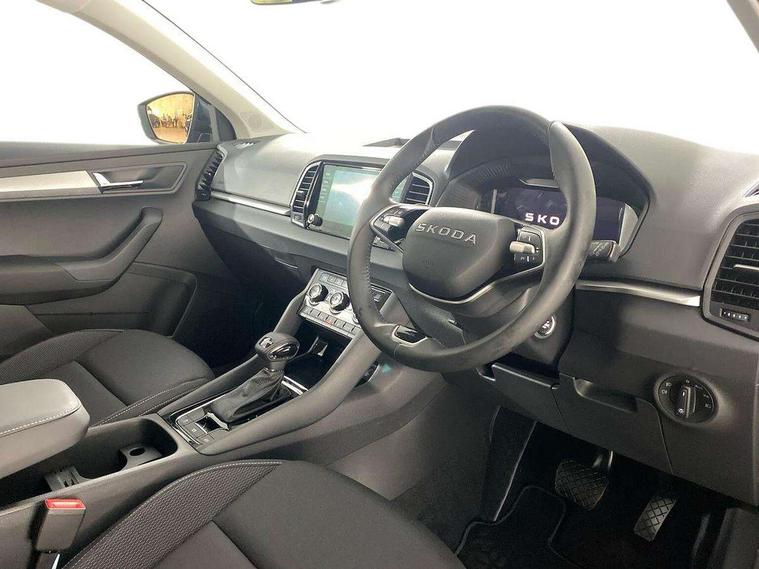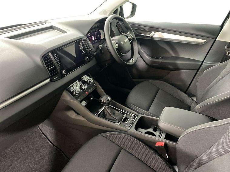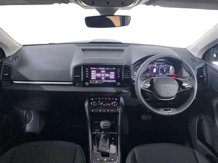 Advanced driver attention and drowsiness monitor, Amundsen navigation system with 8" touchscreen display and integrated WLAN and web radio, Electro-mechanical PAS, Emergency services call system, Lane assist, Outside temperature gauge, Sensor for driver assistance systems, Service interval indicator, SmartLink wireless for Apple and wired for Android, Start/stop system with regenerative braking, Traffic sign recognition, USB C Port x 2 in front centre console, Virtual Cockpit - 10.25" digital display, Wireless smartphone charging, 8 Speakers, DAB radio with Bluetooth, USB connection, Acoustic glass, Aero front windscreen wipers with intermittent function, Auto dimming rear view mirror with light and rain sensors, Black electric window control buttons, Body colour door mirrors and handles, Electric front and rear windows with child proof lock, Electrically adjustable heated folding and auto dimming door mirrors, Front fog lights, Headlight range control, Heated rear windscreen, LED daytime running lights, LED Headlights, LED rear lights with high functionality welcome effect and dynamic indicators, Light assistant (coming/leaving home/tunnel light), Plastic scuff plates in door apertures, Privacy glass, Rear side wing doors, Rear window wiper with washer system and intermittent control, Safety reflectors on front doors, Third brake light, Unique dark chrome design logo on alloy wheels, 1.5 litre bottle holders in driver and front passenger door panels, 12V socket in boot, 12v socket in front centre armrest with storage compartment and rear air vents, 2 spoke leather heated multifunction steering wheel with DSG paddles, 2 x Tablet holder, 3 rear height adjustable headrests, 3 seat bench in 2nd row, 4 foldable roof handles with rear coat hooks, Black floor carpet, Cargo elements in boot, Chrome inner door handles, Driver/front passenger reading lights, Foldable hooks in the boot, Folding tables on the front seat backrests, Front head restraints, Height adjustable driver and passenger seat, Height adjustable front three point seats belts with tensioners, Height/reach adjust steering wheel, Ice scraper, Illuminated glovebox, Illuminated luggage compartment, Interior noise suppression, Isofix child seat preparation for front passenger seat, Isofix child seat preparation outer rear, Loft fabric upholstery, Manual lumbar support for front seats, Pearl grey interior ceiling, Pen holder, Pollen filter, Rear boot cover, Rear package tray, Rear reading lights, Rubbish bin door, Safety vest holder, Single front passenger seat, Skoda lettering on steering wheel, Storage box in upper central dashboard closed, Sunvisors with illuminated vanity mirrors, Textile floor mats, Ticket holder, Umbrella under passenger seat, Under passenger seat storage compartment, Non Smokers pack, Parking pack - Karoq, Winter pack with heated front seats - Karoq, Automatic door unlocking in case of crash, Automatic fuel cut off in case of crash, Driver airbag, Electronic parking brake with auto hold function, Emergency rear braking signal, ESC (incl. ABS+MSR+ASR+EDS+HBA+DSR+RBS+MKB), Front assist, Front side airbags, Head airbags, Hill hold control, Knee airbags, Passenger airbag with switch-off function, Pedestrian monitor, Power operated child safety locks, Seatbelt reminder signalisation and pretensioner for all seats, Three point seatbelts rear, Two tone horn, Tyre pressure monitor, Alarm with interior monitoring, back up horn and tilt sensor with safe function, Electronic engine immobiliser, Keyless entry and start/stop, Remote central locking with 2 remote folding keys, Anodized cross door decor, Black centre console, Chrome framed air vents, Satin black dashboard, Satin black door trim, Anti-theft wheel bolts protection, Breakdown and tool kit,