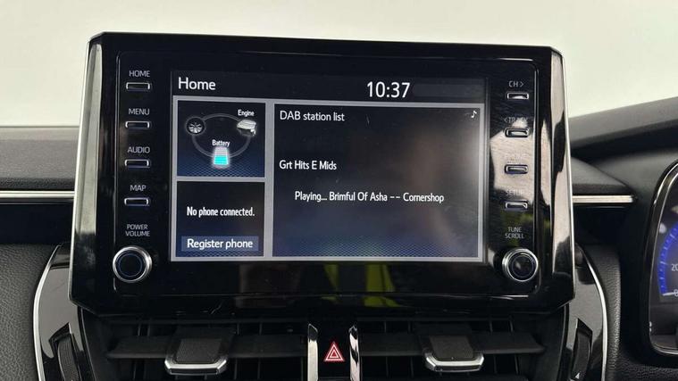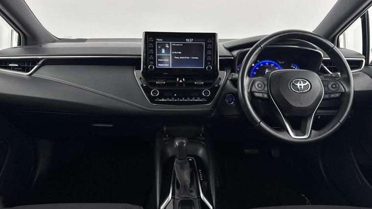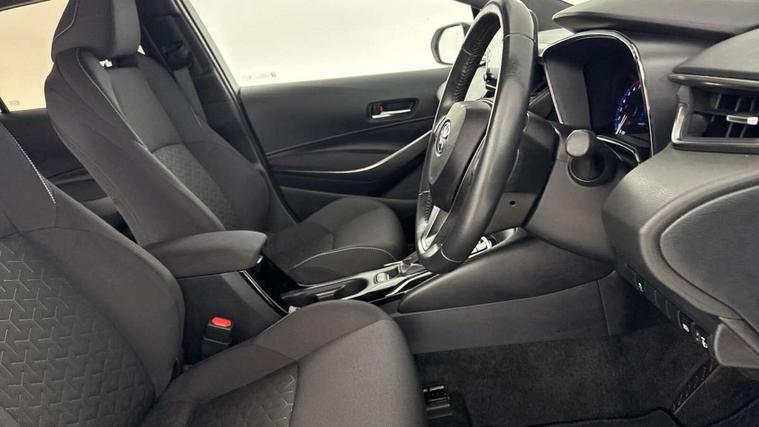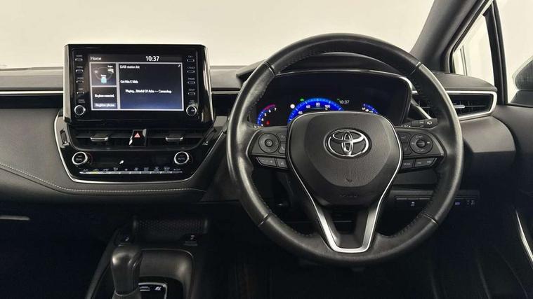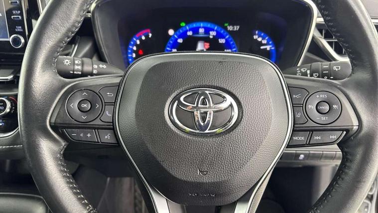 7" Multi information display screen, Bluetooth telephone connectivity, Connected car functionality upgrade, tracker, remote status and e-care, Dynamic radar cruise control (with RSA) including switch on steering wheel, E-call, Electrically assisted power steering, EV drive indicator, Lane Departure Alert (LDA) switch on steering wheel, Memory on adjustable speed limiter, Push button start, Reversing camera, Smartphone integration with Apple CarPlay and Android auto, Gasoline particulate filter, Vehicle Stability Control (VSC), 6 speakers, 8" Touchscreen with MM19 Multimedia system and voice recognition, AM/FM radio, DAB Digital radio, USB and Aux in connectors + 12V front outlet, USB charging port in centre storage box, Aluminium roof rails, Anti-jam protection on power windows, Auto up and down function on all power windows, Automatic headlights with high beam assist, Black metallic surround on lower front grille, Black toyota logo in front, Body colour rear spoiler, Body coloured bumpers, Body coloured door mirrors, Body coloured outside door handles, Follow me home headlights, LED daytime running lights, LED front fog lights, LED Headlights, LED High mounted stop light, Manual day/night rear view mirror, Noise reduction layer on front windows, Power adjustable heated door mirrors, Power front windows, Power rear windows, Rain sensor, Rear side wing doors, Rear window defogger, Rear window wiper, Shark fin antenna, Time adjustment on intermittent wiper, Turning signal integrated indicators in door mirrors, Unique lower skirt, Unique side rocker with black insert, UV-filter on driver and passenger windows, 12v power outlet - luggage side, 3 rear headrests, 3 seat bench in 2nd row, 3 spoke leather steering wheel + gear knob, 60/40 split folding rear seat, Adjustable speed limiter switch on steering wheel, Audio, multimedia and telephone switches on steering wheel, Boot light, Boot underfloor storage, Clean air filter, Driver and front passenger personal light, Driver and passenger assist grip, Driver and passenger sun visor with mirror and light, Dual sided deck board in boot, Dual zone automatic air conditioning with ECO mode switch, Fabric armrests, Front and rear cup and bottle holders, Front and rear door pockets, Front head restraints, Front passenger seat, Heated driver and front passenger seats, Illuminated entry system in room lamp, ISOFIX seat fixing (2 fixings on rear outer seats), Leather gear shift with satin chrome on gear shift console, Manual height adjustable for driver and front passenger seat, Passenger seat back pocket, Pollen filter, Power adjustable lumbar support on driver seat, Power window switches with satin chrome inserts, Quilted fabric upholstery with grey stitches seats, Rear armrest with 2 cupholders, Rear passenger air vents, Rear passenger coat hooks (2), Rear passenger personal lights, Retractable tonneau cover with luggage partition net, Satin chrome inside door handles, Shopping bag hooks in luggage compartment, Side storage in boot, Sliding armrest on centre console box, Slow opening glovebox with lights, Tilt/telescopic steering column, Tonneau cover with under floor storage, Voice recognition switch on steering wheel, Whiplash Injury Lessening (WIL) feature (active headrest) for seats, Toyota safety sense 2 pack - Corolla, 3x3 point rear seatbelts, Adjustable driver and front passenger seat belt extender to top anchor point, Anti lock braking system + Electronic brake force distribution, Brake assist function, Child locks on rear doors, Downhill Assist Control (DAC), Electronic parking brake, Emergency brake light signal (EBS), Front passenger airbag on/off switch, Front seatbelt reminder, HAC - Hill start assist control, Rear seat belt reminder, Seatbelt pretensioners and force limiters, Supplemental restraint system (SRS) 7 airbags - dual driver, dual side curtain, side impact and driver knee airbags, Traction control, Tyre pressure warning system, Acoustic vehicle alert system (AVAS), Alarm with motion sensor and immobilizer, Remote central locking + deadlocks, Satin chrome dash trim, Soft touch texture on upper dashboard, Stitching on lower dashboard, Space saver spare wheel, Unique wheel finish with red wheel cap,