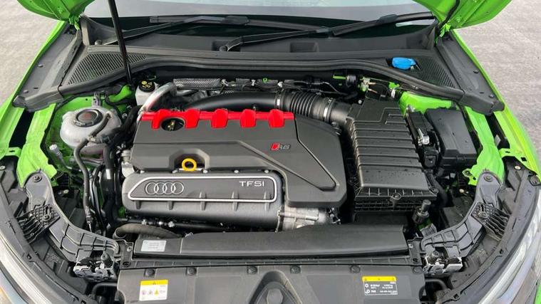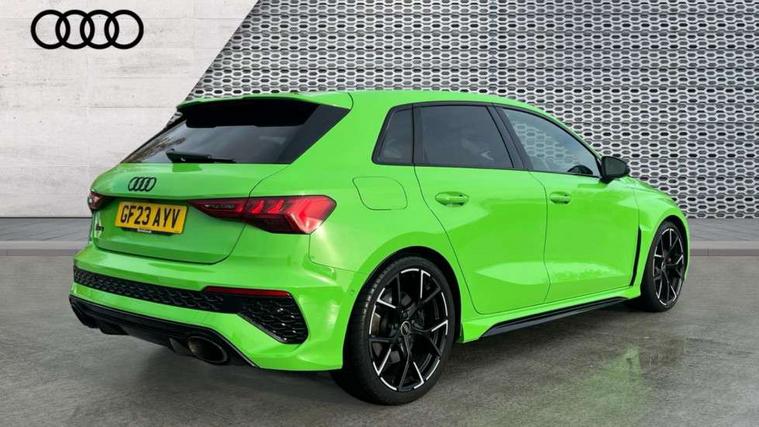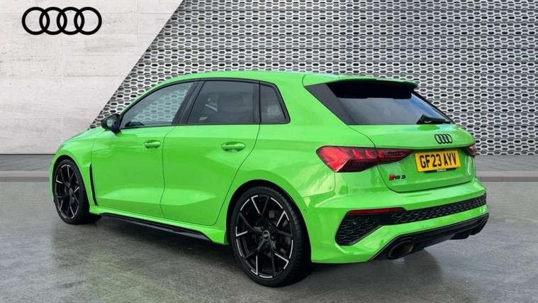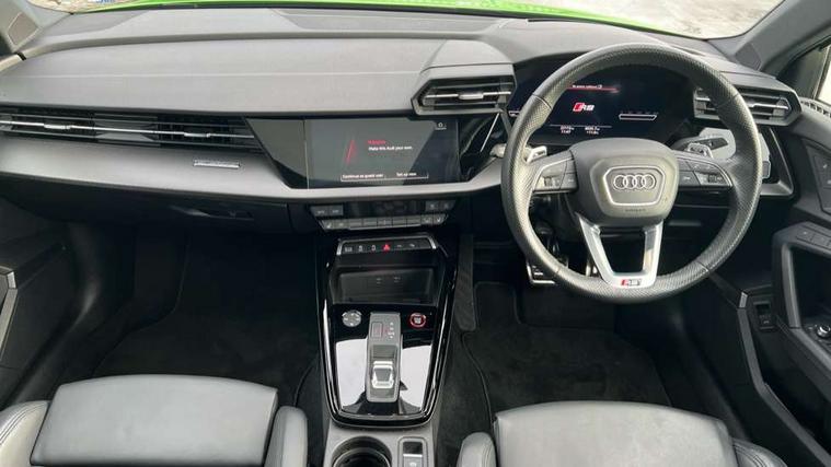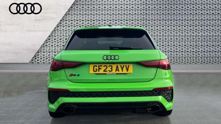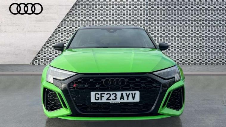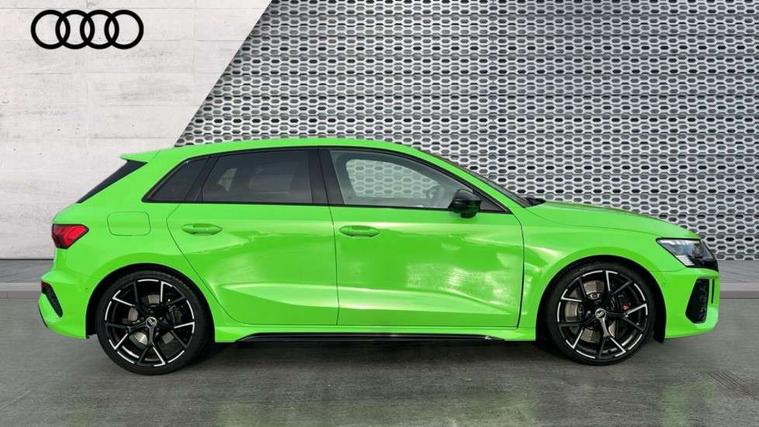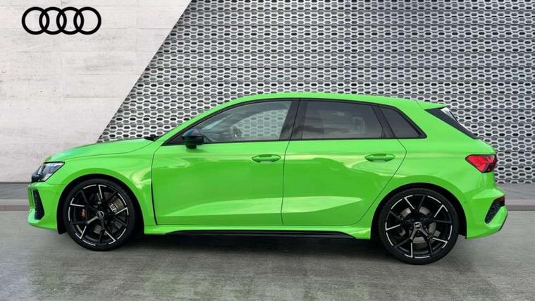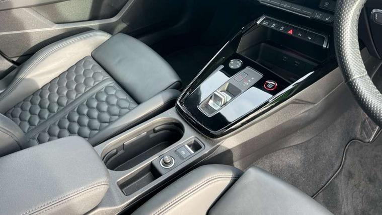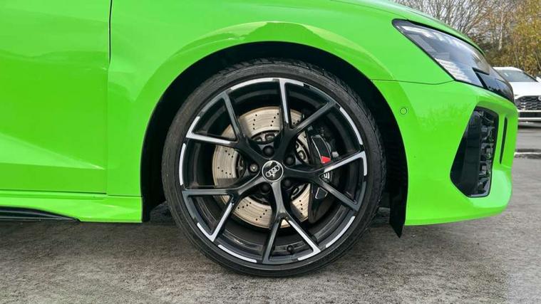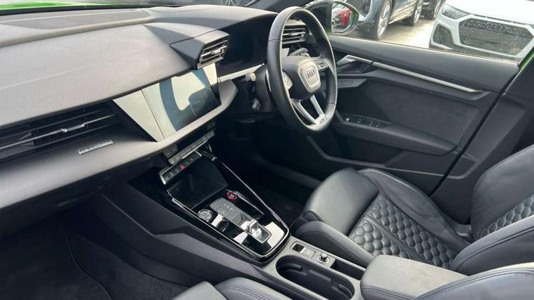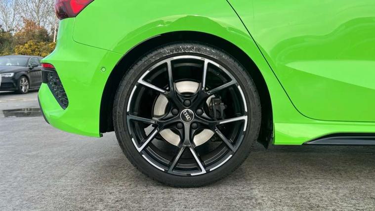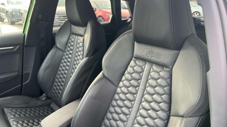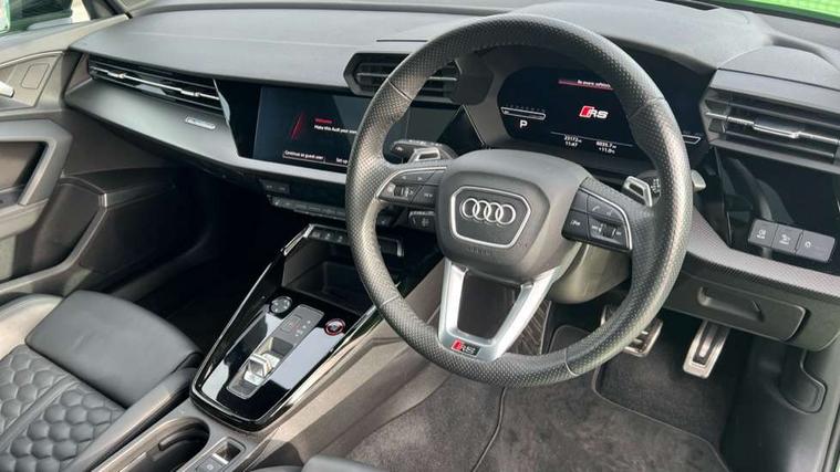 Adaptive cruise assist, Adaptive cruise control, Audi smartphone interface, Audi virtual cockpit with RS specific display 12.3" full colour digital instrument cluster, Automatic start/stop system with recuperation, Bluetooth interface, Camera based traffic sign recognition, Collision avoidance assistant, Emergency e-call, Head up Display, Lane departure warning system, Legal emergency call, Parking assist with parking system plus, Power operated tailgate - Luggage compartment lid opens electrically, Progressive power assisted steering, Reversing camera, Quattro permanent four wheel drive, Rear suspension, DAB Digital radio, 3rd brake light, Acoustic glass windscreen, Audi beam uses LEDs to project the Audi sport logo onto the ground as you exit your RS 3, Audi matrix LED headlights, LED rear lights, dynamic front and rear indicators and headlight cleaning system, Auto dimming rear view mirror, Black side skirts, Body colour roof, Carbon exterior door mirror, Carbon fibre engine cover, Daytime running lights, Electric adj heated/folding + auto dimming exterior mirrors with memory + LED indicator + auto kerb side function for passenger side exterior mirror, Front spoiler in high gloss black, Heat insulating glass windscreen, Light and rain sensors, Panoramic glass sunroof, Privacy glass - dark tinted rear and rear side windows from B-pillar backwards, Rear side wing doors, Rear window wiper and washer system, RS exterior features in gloss black, RS sports exhaust system, 3 seat bench in 2nd row, 3 spoke leather multifunction steering wheel with gear shift paddles, 4 way lumbar support for front seats, 40/20/40 split folding rear seat bench, Black cloth headlining, Dual zone electronic climate control, Electrically adjustable front seats with memory function for driver's side, Front and rear headrests, Front centre armrest, Front sports seats RS embossed logo, Front/rear floor mats, Heated front seats, Honeycomb stitching and RS embossing, Illuminated door sill trims inlays in aluminium with RS 3 logo, Illuminated vanity mirror, RS emblems, Single front passenger seat, Stainless steel pedals and front footrest in black, Aluminium interior elements pack - RS3, Ambient lighting pack - RS3, Comfort and sound pack - RS3, Driver assistance pack with 3 spoke leather multi function steering wheel - RS3, MMI navigation plus with MMI touch - RS3, RS bodystyling - RS3, Storage Pack - RS3, 3x3 point rear seat belts, ABS/EBD, ASR, Audi pre sense front, Driver/Front Passenger airbags, EDL, ESC - Electronic Stability Control + traction control, Front passenger airbag deactivation, Front side airbags with head airbags and interaction airbag, Hill hold assist, Seat belt reminder with passenger presence detection in rear, Tyre pressure loss indicator, Warning triangle and first aid kit, Anti theft alarm, Anti-theft wheel bolts, Electronically operated child lock, Remote control central locking, Full decorative carbon trim, 19" 5 Y spoke black with graphic print alloy wheels, Tool kit, Tyre repair kit,