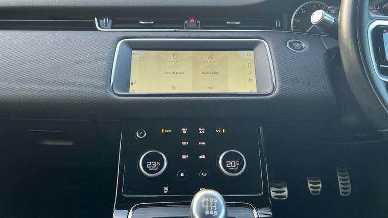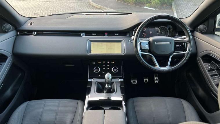 10" touch screen, Android Auto, Apple car play, Bluetooth connectivity, Brake pad wear indicator warning light, Cruise control + speed limiter, Driver condition monitor, Electronic power assisted steering (EPAS), Front and rear parking aid, InControl remote, Land Rover InControl apps, Lane keep assist, Push button starter, Voice control system, Passive suspension, Digital Audio Broadcast radio-DAB, Steering wheel mounted controls, Electric windows with one touch open/close and anti trap, Evoque and R-Dynamic badge, Flush deployable exterior door handles, Heated rear window with timer, Heated washer jets, Heated windscreen, Rain sensing windscreen wipers, Rear fog lights, Tailgate spoiler, 40:20:40 split folding rear seats with centre headrest and armrest, Ambient interior lighting, Bright metal pedals, Isofix system on outer rear seats, Overhead lighting console, Overhead stowage for sunglasses, Passive front head restraints, Rear air vents, Rear centre headrest, Sunvisors with illuminated vanity mirrors, Twin sliding front centre armrest, 3 rear 3 point seatbelts, Anti-lock braking system (ABS), Customer configurable autolock, DSC - Dynamic Stability Control, Electronic brake force distribution, Electronic parking brake, Electronic traction control, Emergency braking, Front and rear seatbelt reminder, Hill launch assist, Power operated child locks, Roll stability control, Six airbags - Driver and passenger airbags/driver knee airbag/front side airbag and curtain airbags, Tyre pressure monitoring system, Alarm, Immobiliser, Intrusion sensor, Locking wheel nuts,