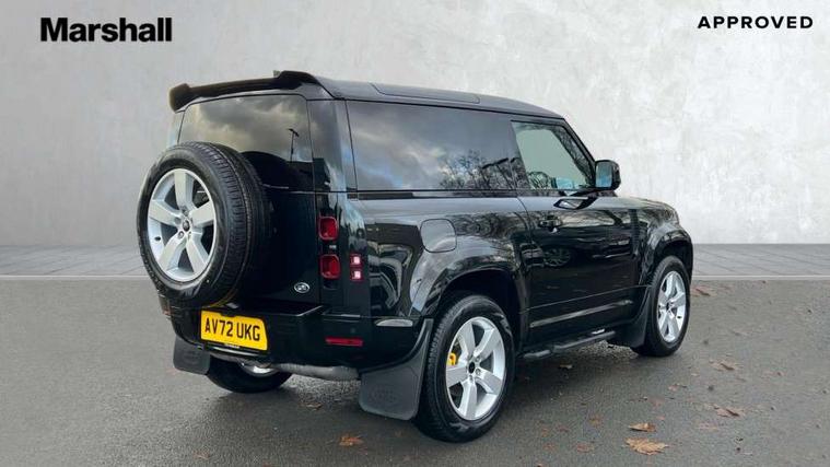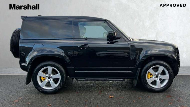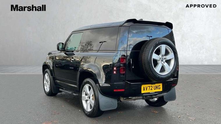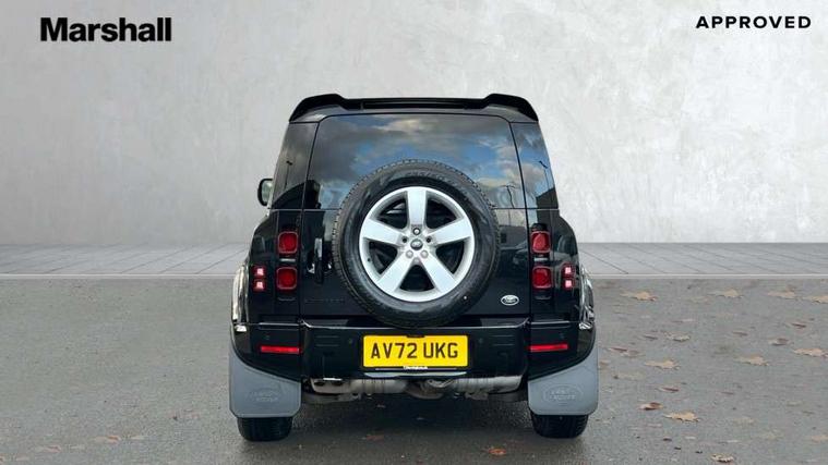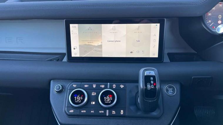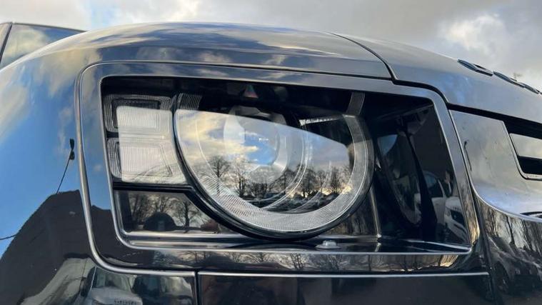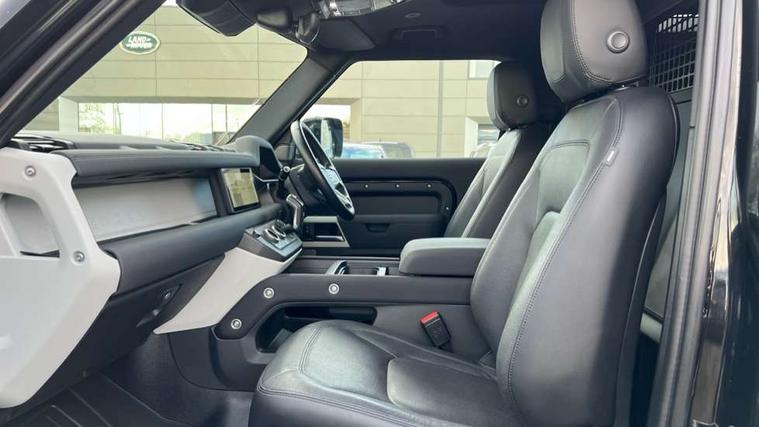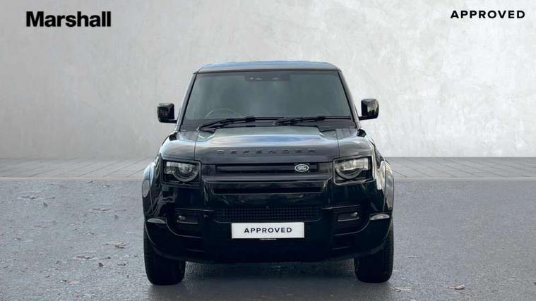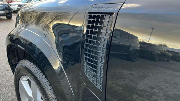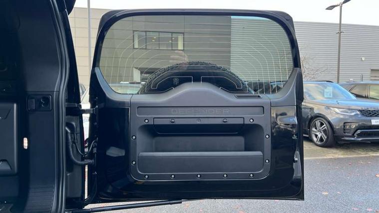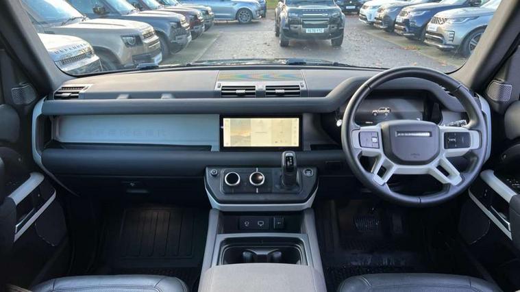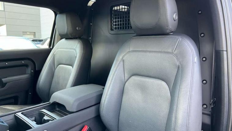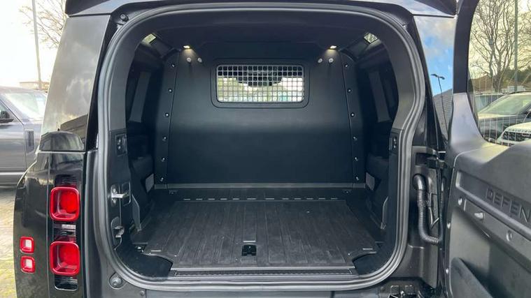 Customer Configurable Autolock, 360 parking aid, 3D Surround Camera with 360 View, 180 Rear View, Front Traffic Detection, Forward Vehicle Guidance, Tow Hitch Assist and clear sight Ground View, Blind spot assist, Brake Hold, Driver condition monitor, Electric power assisted steering (EPAS), Lane keep assist, Low traction launch, Pivi pro connected, Rear traffic monitor, Traffic sign recognition adaptive speed limiter, Trip computer, Tyre pressure monitor, Wade Sensing, Android Auto, Apple CarPlay, DAB Radio (Digital Audio Broadcasting), Meridian 280W sound audio system with 7 speakers with subwoofer, Alpine lights, Assisted tailgate, Auto High Beam Assist, Automatic headlight levelling, Automatic headlights and rain sensitive front wipers, Centre high mounted stop light, Electric heated/power fold door mirrors with approach lights and auto dimming driver side, Electric windows with one touch open/close and anti-trap, Exterior signage panel, Follow me home lighting, Front fog lights, Heated rear window with timer, Heated windscreen, LED tail light, Privacy glass, Puddle lights, Rear fog lights, Rear wash wiper, Side-hinged tailgate, Standard roof, Standard tread plates, Additional lashing points, Dual zone climate control, Durable rubber cabin flooring, Footwell lights, Full height bulkhead behind row 1 seats, Glovebox storage, High sided rubber mats, Loadspace cover, Loadspace hooks, Loadspace rubber mat, Manual adjustable steering column, Overhead stowage for sunglasses, Rear centre headrest, Rear reading light, Standard interior, Standard seating configuration, Sunvisors with illuminated vanity mirrors, Twin front cupholders, Upgraded loadspace LED lighting, Online pack - Defender with data plan, Brake pad wear indicator, Electronic traction control, Emergency braking, Front airbags, with passenger seat occupant detector, Power operated child locks, Remote for (e-Call, Optimised assistance call, InControl app, Climate, beep and flash and door), Seat belt reminder, Intrusion sensor, Keyless entry system, Locking wheel nuts, 8 speed automatic transmission, ABS and EBA, All wheel drive, CBC - (Cornering brake control), Dynamic stability control, Electronic brake force distribution, Electronic park brake, Gradient acceleration control, Hill Descent Control, Hill start assist, Particulate filter (DPF), Push button start, Roll stability control, Trailer stability assist, Twin speed transfer box (high/low range),