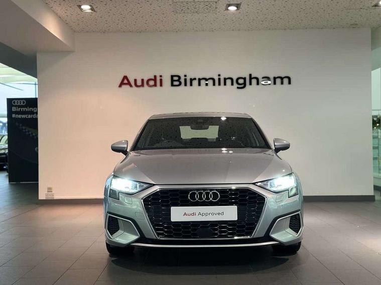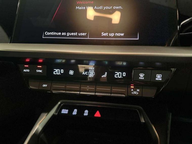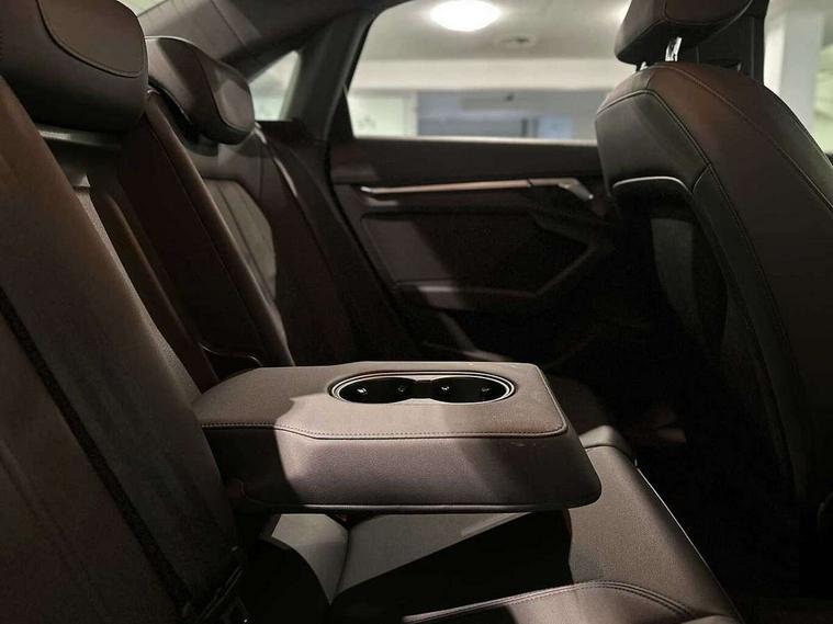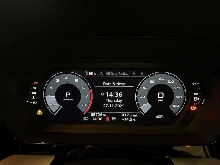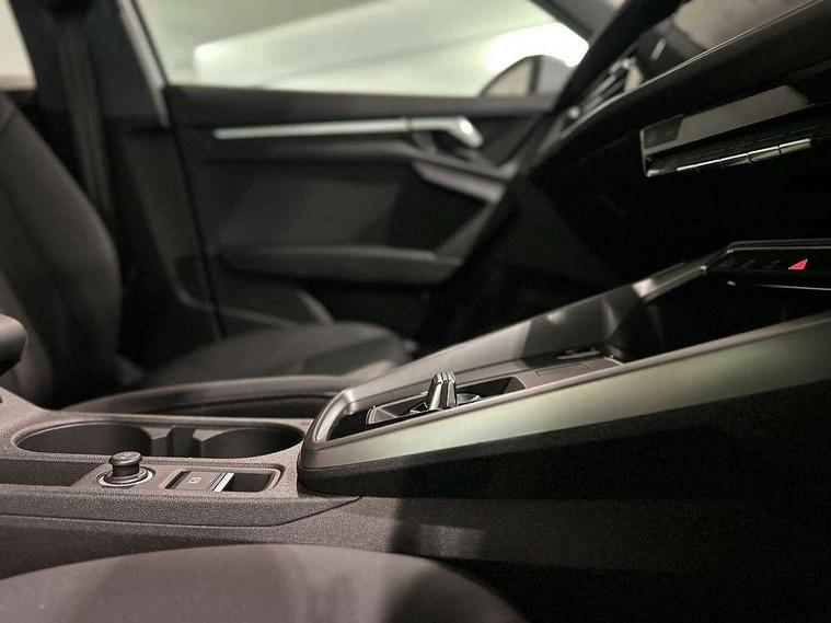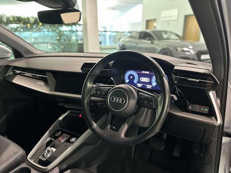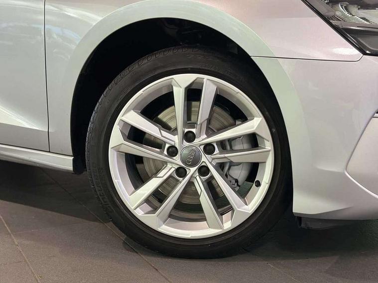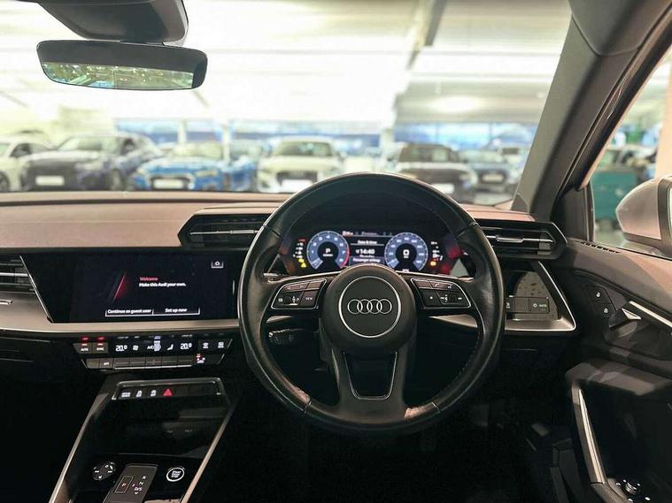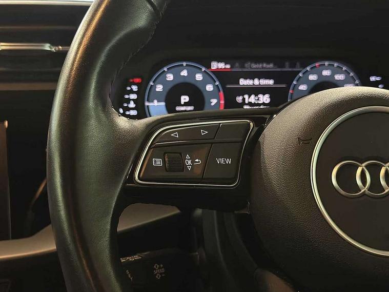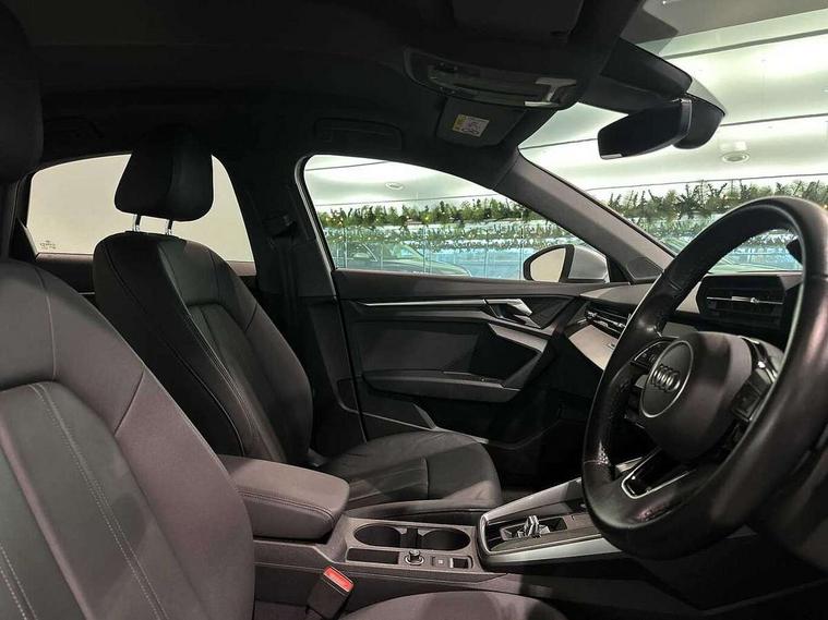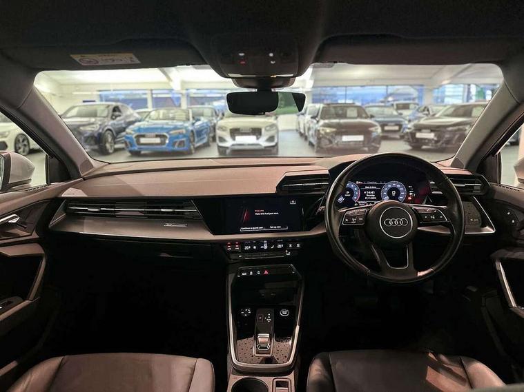 Audi connect emergency call and service, Audi drive select (Auto, Comfort, Dynamic, Efficiency and Individual), Audi smartphone interface, Audi Virtual Cockpit - 10.25" digital and colour instrument cluster, Automatic start/stop system with recuperation, Bluetooth interface, Collision avoidance assistant, Electromechanical power speed sensitive steering, Lane departure warning system, MMI Navigation Plus with high resolution 10.1" colour touch screen display, Service indicator, Voice control system with natural language interaction, Standard suspension, 2x USB Type C ports (for charging and data transfer), 6 passive loudspeakers, CD player, DAB Digital radio, Acoustic glass windscreen, Aluminium window trim, Auto dimming frameless rear view mirror, Body colour exterior mirrors, Body colour roof spoiler, Electrically adjustable/heated/folding/dimming door mirrors with kerb view includes integrated LED indications + kerb view function for passenger side, Front electric windows, LED daytime running lights, Light and rain sensors, Model and engine designation badges at rear, Rear electric windows, Rear window, rear door windows and rear side windows in clear glass, 12V socket and storage compartment in front centre console, 40/20/40 split folding rear seat bench with cupholder, Dual zone electronic climate control, Front and rear headrests, Front centre armrest, Front door sill trims with aluminium inlay, Front/rear floor mats, Height and reach adjustable steering wheel, Interior lighting - Front and rear roof module including reading lights, glove compartment light and right hand side, Luggage compartment floor covering, Manual boot compartment lid, Manually adjustable front seats, Seat side bolsters, Steel grey cloth headlining, Twin leather upholstery, Aluminium interior elements pack - A3 Saloon, Sport styling pack - A3 Saloon, 3x3 point rear seat belts, Driver and front passenger airbag with passenger airbag deactivation, Electronic Stabilisation Control (ESC) including ABS, ASR and EDL, First aid kit with warning triangle and 2 safety vests, Front side airbags with head airbags and interaction airbag, Hill hold assist, Pre-sense front with pedestrian and cyclist detection, Seatbelt monitoring, Tyre pressure loss indicator, Anti theft alarm, Anti-theft wheel bolts, Electronically operated child lock, Immobiliser, Remote control central locking, Aluminium air vent surrounds, Aluminium trim elements, Inlays with silk effect paint in platinum grey,