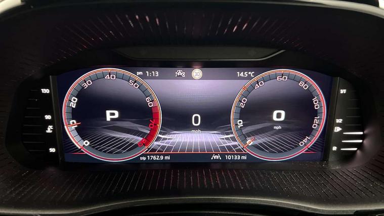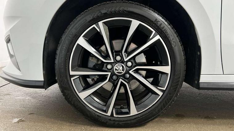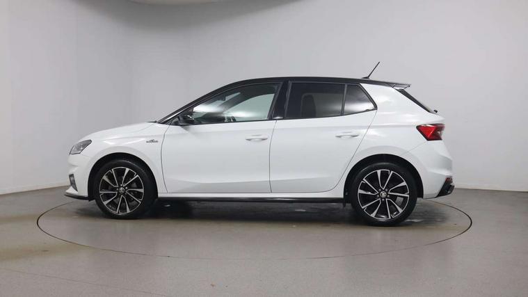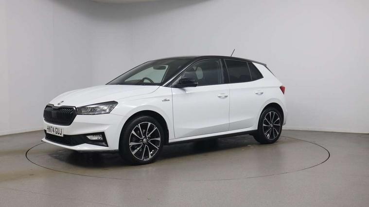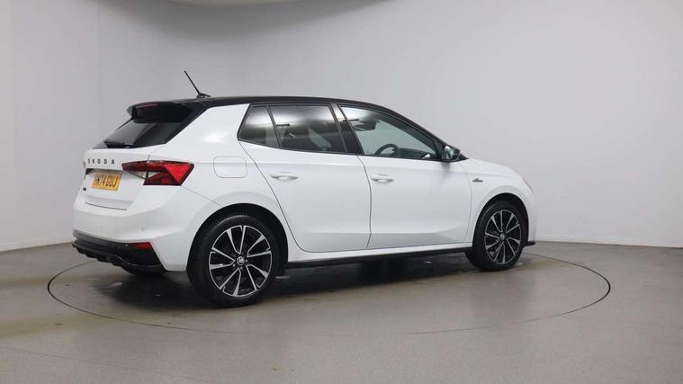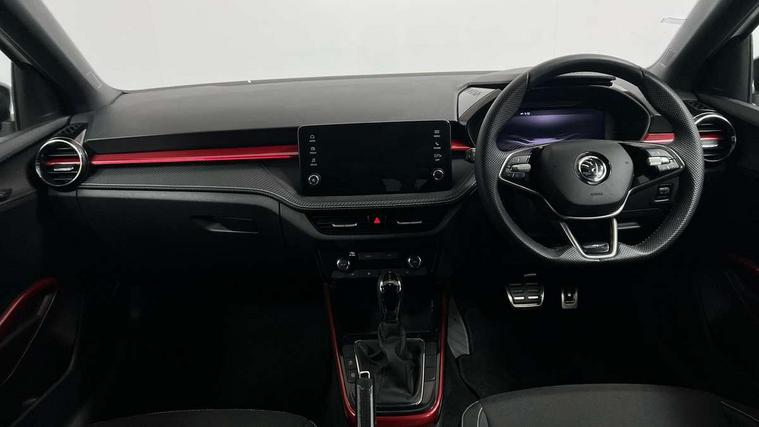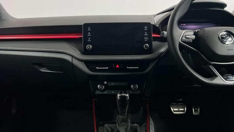 Advanced driver attention and drowsiness monitor, Bluetooth connection, Electromechanical power steering, Exterior temperature gauge, Service interval indicator, Traffic sign recognition, Virtual cockpit with 10.25" colour display, Wireless SmartLink for Apple CarPlay and Android Auto, 6 Speakers (4 in front and 2 in rear), Auxiliary socket for external MP3 player, DAB digital radio reception, Auto dimming rear view mirror, Black radiator grille, Body coloured bumpers, Door mirror integrated indicators, Front and rear electric windows, Front window wiper intermittent control, Headlight range control - Automatic, Ice scraper in fuel cap, LED daytime running lights with coming and leaving home feature, LED rear lights, Monte Carlo badging, Privacy glass, Rear LED fog light, Rear side wing doors, Rear window wiper with washing nozzles, Roof mounted spoiler, SKODA tailgate lettering in black, Sports bumpers, Third brake light, 2 reading lights in front and 2 reading lights in rear, 3 rear headrests, Aluminium pedals, Backrest split and folding, Black headlining, Central console with removable cup holder and storage box, Chrome handbrake release button, Door sills with fabia badging, Dual zone air conditioning with climatronic electronic control, Fabric/artificial leather upholstery, Front centre armrest, Front sports seats, Gearshift knob/handle in leather, Hand brake lever handle in leather, Height adjustable front headrests, Height adjustable front seats, Height adjustable steering wheel, ISOFIX and TopTether anchorage points to the outer rear seats, ISOFIX and TopTether on the front passenger seat, Luggage compartment lighting, Manually adjustable lumbar support in front seats, Metallic painted red central console cover, Metallic red interior door handles, Pollen filter, Rear seat bench unsplit, Single front passenger seat, Sun visors with mirror and airbag label on passenger side, Textile floor mats, Ticket holder, Umbrella in drivers door, 3-point height adjustable front seats belts with pretensioner and force limiter, Automatic warning lights in case of crash, Driver and passengers airbag with switch off function, e-Call+, ESC including ABS, MSR, ASR, EDS, HBA and XDS, Front and rear seat belt warning, FRONT ASSIST (AEB City and AEB Inter Urban), Front side airbags, Head airbags, Hill hold control, One tone horn, Pedestrian protection, Three rear 3-points safety seat belts with pretensioner and force limiter including stop function for outer rear seat belts, Tyre pressure monitoring system, Anti-theft alarm system including immobiliser, interior monitoring, backup horn, and towing protection, Central locking with radio remote control, interior controls, SAFE function and 2 foldable keys, Carbon effect door and side trim panels, Carbon effect lower decorative trim with white stitching, Monte carlo air vents, Red metallic upper decorative trim, Anti-theft wheel bolts protection, Super-low rolling resistance tyres,
