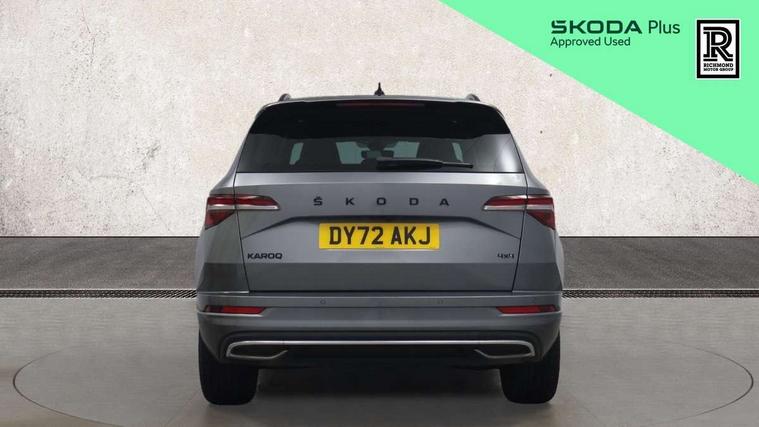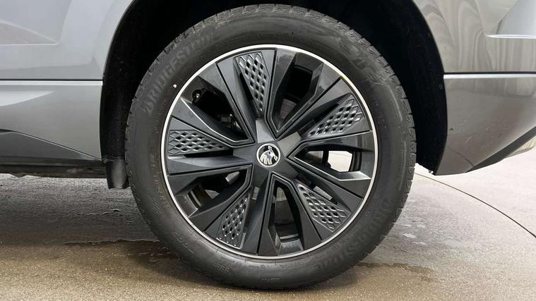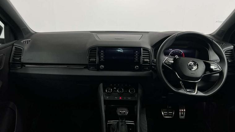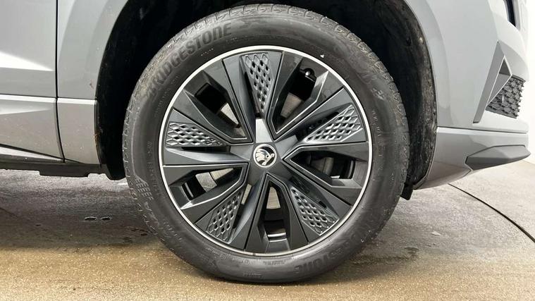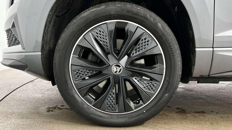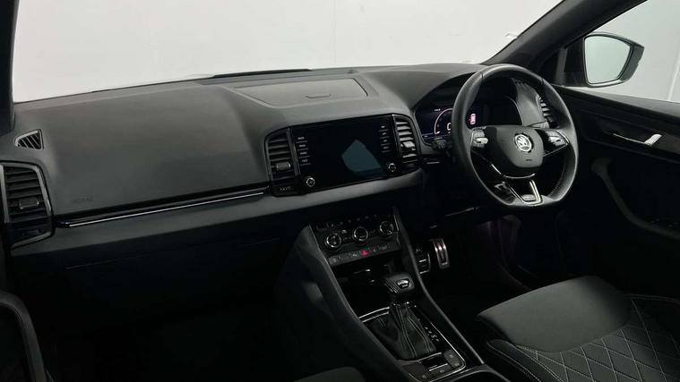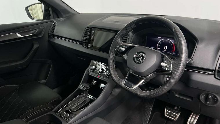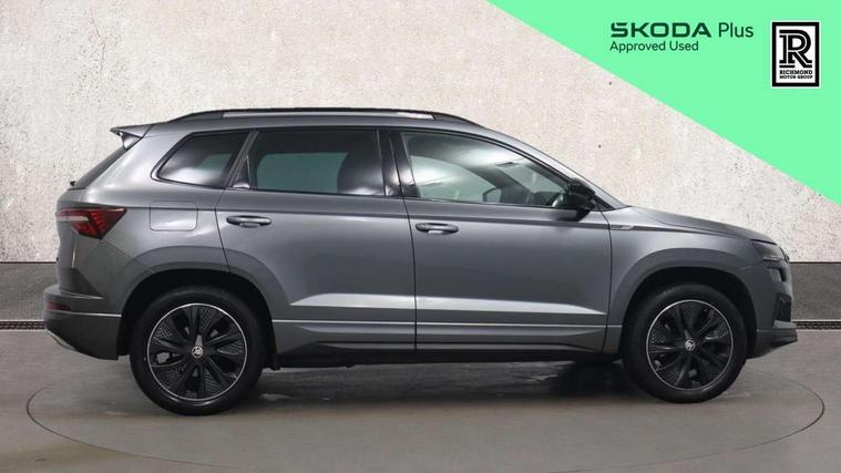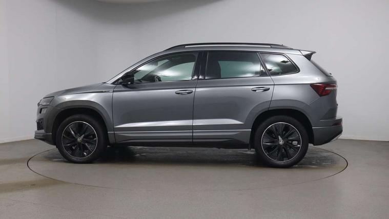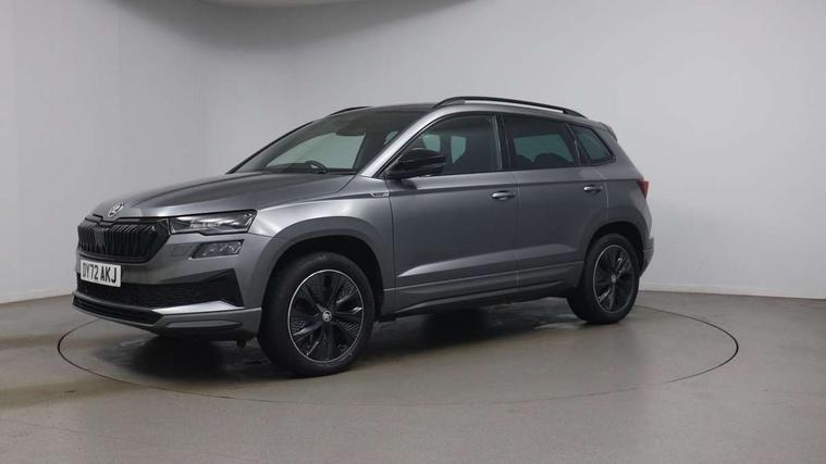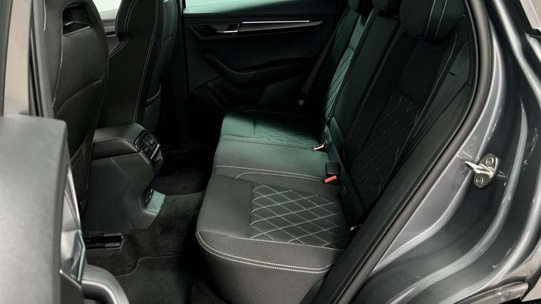 8" Digital display, Care connect, Colour multifunction trip computer, Driver fatigue sensor, Emergency services call system, Outside temperature gauge, Service interval indicator, SmartLink wireless for Apple and wired for Android, Start/stop system with regenerative braking, USB C Port x 2 in front centre console, Virtual pedal with electrically operated boot door, 8 Speakers, DAB radio with Bluetooth, USB connection, Acoustic glass, Aero front windscreen wipers with intermittent function, Auto dimming rear view mirror with light and rain sensors, Automatic headlight control system, Black door mirrors, Black electric window control buttons, Black radiator grille, Black roof rails, Body colour door handles, Electric front and rear windows with child proof lock, Front door steps with SportLine logo, Heated rear windscreen, LED daytime running lights, LED rear lights with high functionality welcome effect and dynamic indicators, Light assistant (coming/leaving home/tunnel light), Panoramic sliding sunroof, Plastic scuff plates, Privacy glass, Protective door side sills in body colour, Rear diffuser, Rear side wing doors, Rear spoiler, Rear window wiper with washer system and intermittent control, Safety reflectors on front doors, Skoda lettering on tailgate in black, Sportline badge on front fender, Sportline decorative inserts with badging, Sports front and rear bumpers, 1.5 litre bottle holders in driver and front passenger door panels, 12V socket in boot, 12v socket in front centre armrest with storage compartment and rear air vents, 2 Folding hooks and nets in boot, 3 rear height adjustable headrests, 3 seat bench in 2nd row, 3 spoke leather sports multifunction steering wheel and silver stitching with gear shift paddles, 4 foldable roof handles with rear coat hooks, Black floor carpet, Black roof headlining, Chrome inner door handles, Double sided boot floor, Foldable hooks in the boot, Front head restraints, Height adjustable front three point seats belts with tensioners, Height/reach adjust steering wheel, Ice scraper, Illuminated glovebox, Illuminated luggage compartment, Interior noise suppression, Isofix child seat preparation outer rear, Manual lumbar support for front seats, Pen holder, Pollen filter, Rear boot cover, Rear reading lights, Rear seats fixed folding and divided 60:40, Rubbish bin door, Safety vest holder, Single front passenger seat, Storage box in upper central dashboard closed, Sunvisors with illuminated vanity mirrors, Textile floor mats, Ticket holder, Titan black interior ceiling, Welcome animation with sportline logo, Light Pack - Karoq, Parking pack - Karoq, Automatic door unlocking in case of crash, Automatic fuel cut off in case of crash, Child locks on rear doors, Driver airbag, Electronic parking brake with auto hold function, Emergency rear braking signal, ESC including ABS, MSR, ASR, EDS, HBA, DSR, RBS, MKB and traction control, Front side airbags, Hill hold control, Knee airbags, Passenger airbag with switch-off function, Pedestrian monitor, Seatbelt reminder signalisation and pretensioner for all seats, Three point seatbelts rear, Two tone horn, Tyre pressure display, Tyre pressure monitor, Alarm with interior monitoring, back up horn and tilt sensor with safe function, Electronic engine immobiliser, Keyless entry and start/stop, Remote central locking with 2 remote folding keys, Black air vent surround, Black centre console, Satin black dashboard, Satin black door trim, 19" Sagitarius anthracite alloy wheels with matt black aero inserts, Anti-theft wheel bolts protection, Matt black aero hub caps, Storage on wheel cover, Tool kit,
