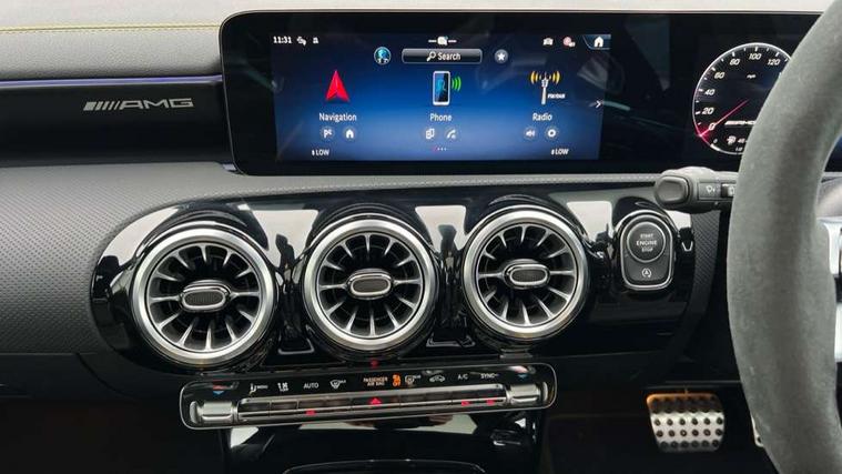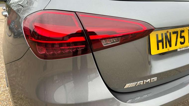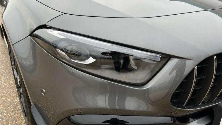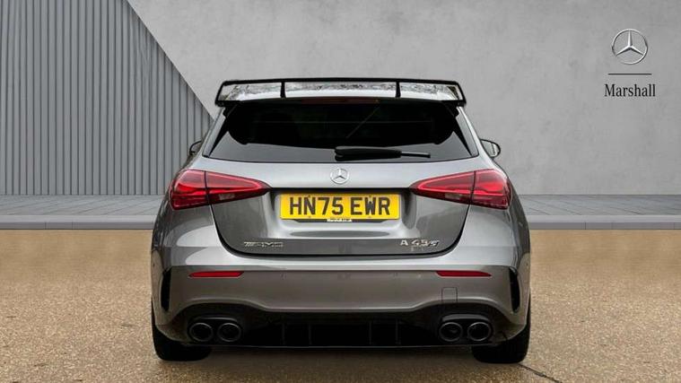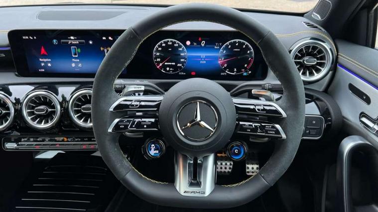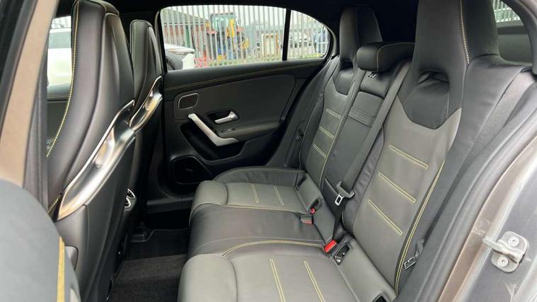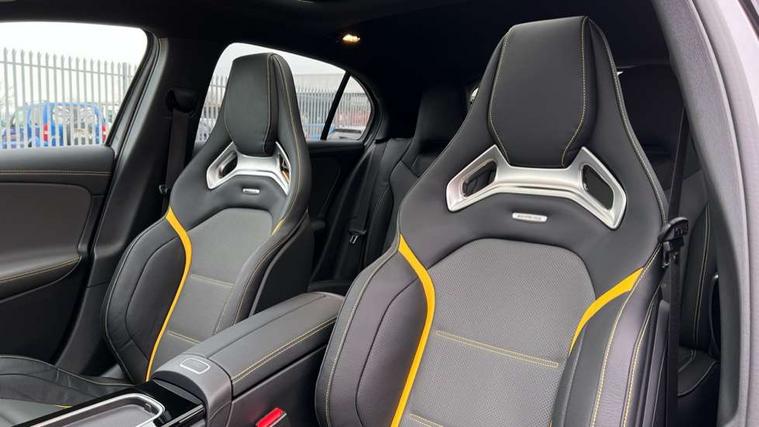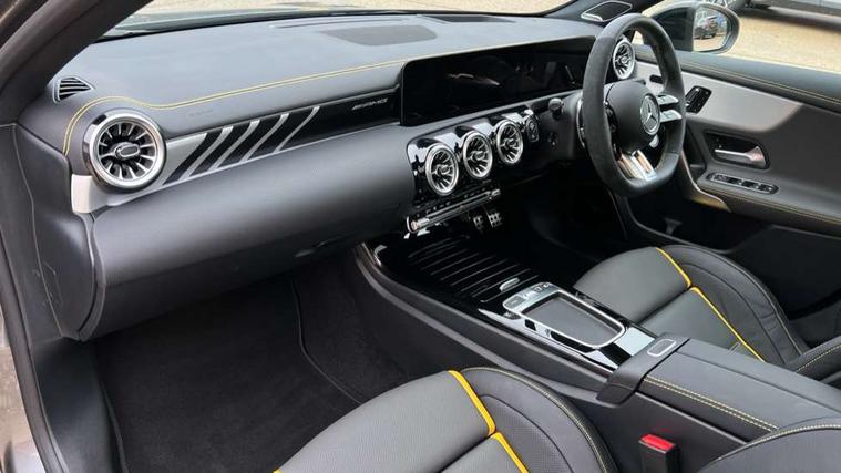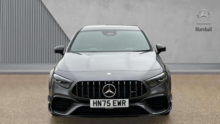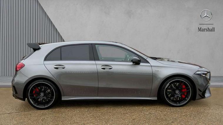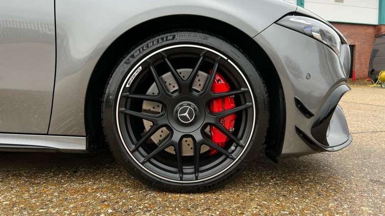 10.25 inch touchscreen central media display with AMG specific, AMG start up logo, visualisation of the AMG drive programs, vehicle and engine data, 10.25" Digital instrument cluster display screen, AMG DYNAMIC SELECT with drive modes(Slippery, Comfort, Sport, Sport+, Individual and Race) incl drift mode via steering wheel shift paddles+Race Start, AMG menu with sporty additional information - Gear indicator with yellow M symbol manual mode, Warm Up menu and Set Up menu, AMG speed sensitive steering with two sets of steering characteristics, Attention assist, Brake pad wear indicator warning light, Car wash mode, Direct steering, Dual bluetooth interfaces, ECO start/stop function, Engine start/stop button, Fluid level warning indicator for fuel, oil, coolant and washer fluid, Fluorescent jacket for driver, Hard-disk navigation, Head up Display, Hey Mercedes Voice activation, Lamp failure indicator, MBUX augmented reality for navigation, Mercedes me connect including emergency call system, accident recovery, breakdown and maintenance management, Mercedes me remote services, Outside temperature gauge, Owners manual in English, Pre-installation of private car share, Remote boot closing, Service indicator (ASSYST), Smartphone integration with Apple CarPlay and Android auto, Tailgate, Traffic sign assist, Trip computer in multifunction display with current consumption indicator, Wireless charging, AMG performance 4MATIC+ with torque control, AMG suspension including AMG specific axles and sporty spring/damper setup, Suspension with adaptive damping system, Burmester surround sound system (590W) with Dolby atmos, speakers - 1 center+4 doors+2 in C pillars, tweeter, subwoofer, DSP amp, burmester lettering, DAB Digital radio, MBUX multimedia system, 4 Electric Front and Rear windows, Adaptive brake lights, AMG A45 S bodystyling -rear apron, four vertical fins, side sill panels, roof spoiler lip, specific front apron, diffuser look and S label on boot lid, AMG real performance exhaust sound system, AMG specific radiator grille in high gloss chrome with AMG lettering, Beltline strips in High gloss Black, Body colour bumpers, Body colour door handles with chrome inserts, Body colour side skirt, Electric adjustable and heated door mirrors with integrated LED side indicators, Headlamp assist automatic headlamp activation, Heated glass rear windscreen + timer control, LED daytime running lights, LED High level third brake light, LED tail lamp, Multibeam LED headlamps with adaptive highbeam assist and cornering function, Panoramic sliding sunroof, Privacy glass, Radio aerial, Rain sensing windscreen wipers with two sensitivity settings, Rear fog lights, Rear side wing doors, Rear windscreen wiper, Surround lighting with logo projection, Two round twin tailpipe trim elements each measuring 90 mm in diameter and AMG lettering plus ribbing on the inside of the pipe, Valve control dependent on drive program, Wider wheel arches for AMG wheels, Window line trim strip in black, 3 seat bench in 2nd row, 3 Spoke flattened lower section sporty design AMG Performance steering wheel in nappa leather/microcut microfibre, 40:20:40 split folding rear seats, Air conditioning - Two zone thermotronic luxury automatic climate control with display, AMG brushed stainless steel sports pedals with rubber studs, AMG centre console finished with trim in silver chrome, AMG floor mats, AMG performance seats, AMG sporty centre console with raised front section and integral control switched for manual transmission mode, AMG steering wheel buttons, Automatic child seat recognition sensor, Black air vents with surround in silver chrome, Black roof lining, Electrically adjustable front memory seats including lumbar support and backrest inclination, Front centre armrest with stowage, Front seat head restraints, Height/reach adjustable steering column, Illuminated AMG front door sills with changeable cover, Interior lighting - 64 colour Ambient lighting, Interior mirror with reading lamps in black and frameless, Rear armrest with 2 cupholders, Rear head restraints, Seat occupancy sensor for front passenger seat, Silver coloured aluminium gear shift paddles on steering wheel, Single front passenger seat, Stowage compartment in centre console with retractable cover, Sunvisors with illuminated vanity mirrors, Twin front cupholders, Aerodynamic pack - A Class, AMG Driver's pack - A Class, AMG night pack - A Class, AMG performance high-end seat pack - A Class, Light and sight package - A Class, Mirror package - A Class, Multi-contour seat pack - A Class, Parking pack with 360 degree camera - A Class, Seat comfort pack - A Class, USB pack plus - A Class, Winter pack - A Class, 3 rear 3 point seatbelts, 3 stage electronic stability programme, ABS with Brake Assist, Active bonnet, Adaptive brake assist with hold function and hill start assist, AMG high performance brake system with red painted brake callipers and black AMG lettering at the front, ventilated and perforated brake discs, Black seatbelts, Bonnet with power domes, Childproof locks manually operated for rear doors and electrically operated for rear power windows, Crash responsive emergency lighting, Driver and passenger head and side airbags, Drivers knee airbag, Dual stage driver/passenger airbags, Electronic parking brake, ESP curve dynamic assist, ESP with ASR, Exit warning, Front and rear seatbelt reminder, ISOFIX and top tether child seat fixing points in two outer rear seats, Tyre pressure monitoring system, Warning triangle and first aid kit, Window airbags, Alarm system/interior protection/immobiliser, Guard 360 degree vehicle protection, Keyless entry lock/unlock, Keyless Go, Remote central locking and crash sensor with emergency opening function, Aluminium AMG design black/silver interior trim, 19" AMG cross spoke forged wheels painted in matt black with high sheen rim flange, Summer tyres, Tirefit sealant kit, Wheel arches with flared AMG wings with TURBO 4MATIC+ letterin