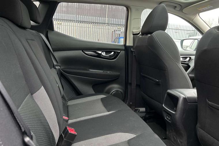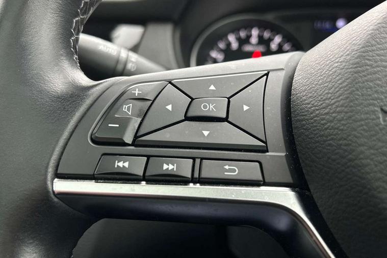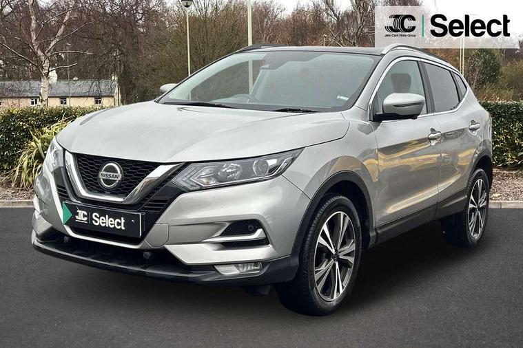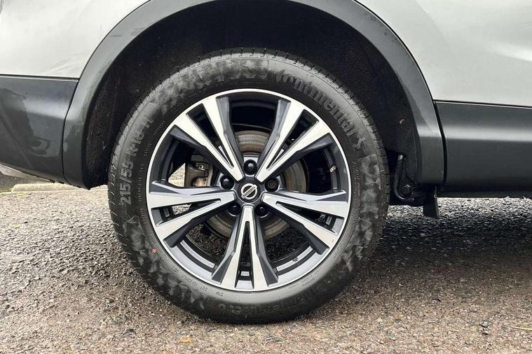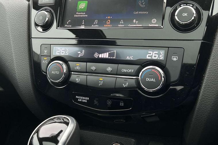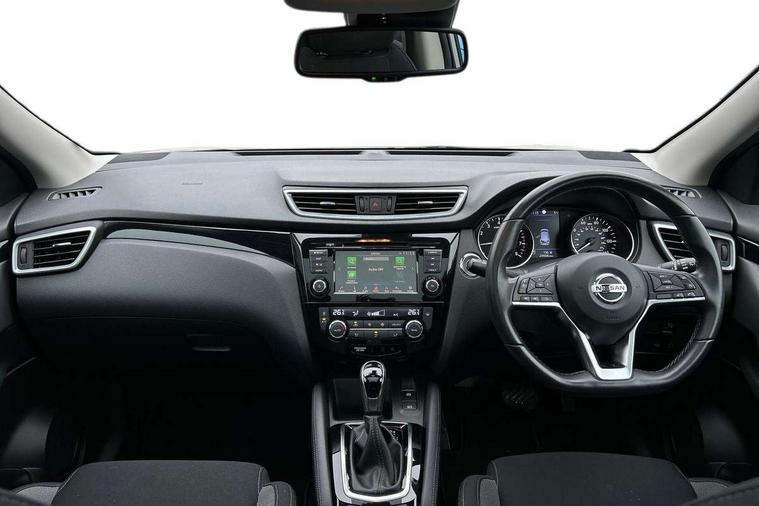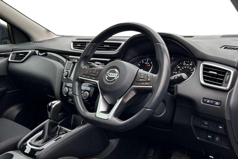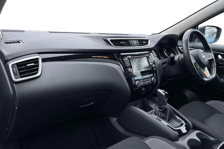 360 degree Intelligent around view monitor, Advanced drive assist display 5'' TFT coloured screen, Apple car play/Android Auto, Bluetooth connectivity, Cruise control + speed limiter, Electric speed sensitive power steering, Front parking sensors, Idle stop/start system, Intelligent park assist, Lane departure warning system, Nissan connect evo 7" touchscreen navigation and entertainment system, Normal or sport selectable steering, Outside temperature sensor, Premium Tomtom connected services, Push button starter, Rear parking sensors, Service interval indicator, Smartphone integration, Traffic sign recognition, Trip computer, Voice control system, Nissan chassis control (intelligent ride control, intelligent trace control, intelligent engine brake), 6 speakers, AM/FM radio, CD audio system, Aux-in socket, DAB Digital radio, Steering wheel mounted audio controls, USB port, Anti dazzle rear view mirror, Auto wipers, Body colour bumpers, Body coloured door handles, Body coloured door mirrors, Chrome window surround, Daytime running lights dip function when turn signal applied, Electric folding door mirrors, Electric front and rear windows with one touch illuminated window controls, Electrically adjustable door mirrors, Front fog lights, Halogen headlights, Heated door mirrors, High beam assist, Intelligent auto headlights, LED indicators in door mirrors, Matt silver roof rails, Privacy glass, Rear roof spoiler, Rear wiper with reverse link, Shark fin antenna, Signature LED daytime running lights, Silver rear styling plate, Underbody vortex generators, 2 X front 12v power sockets, 3 height adjustable rear headrests, 60/40 split folding rear seat, Ambient interior lighting, Ambient lighting around centre console, Bi-colour cloth upholstery, Boot lighting, Centre console storage box/armrest, Chrome interior door handles, Driver's seat manual height adjust, Dual zone climate control, Front and rear door pockets with bottle holders, Front and rear seat belt pre-tensioners with load limiters, Height adjustable front headrests, ISOFIX restraints on outer rear seats x2, Leather D shaped steering wheel, Leather gear lever, Leather knee pad, Luggage board system, Manual height adjustable passenger seat, Manual lumbar support on driver seat, Manual lumbar support on passenger seat, Monoform front sport seats with plastic backboard, Parcel shelf stow function under luggage board, Pollen filter, Rear armrest with 2 cupholders, Synthetic leather wrapped door handle with contrasting stitching, Tilt/telescopic adjustable steering wheel, Velour floor mats, Glass roof pack - Qashqai, 6 airbags - Driver, front passenger, curtain and side airbags, ABS, ESP, EBD and brake assist, Auto hold function, Child locks on rear doors, Electronic parking brake, Front and rear seat belt warning, Height adjustable front seatbelts, Hill start assist, Intelligent emergency braking with pedestrian recognition, Passenger airbag deactivation system, Three 3 point rear seatbelts, Tyre pressure monitoring system, Anti-theft immobiliser, Intelligent Key, Remote central locking, Thatcham Cat.1 alarm, Carbon graphite dash trim, 18" Two tone alloy wheels,