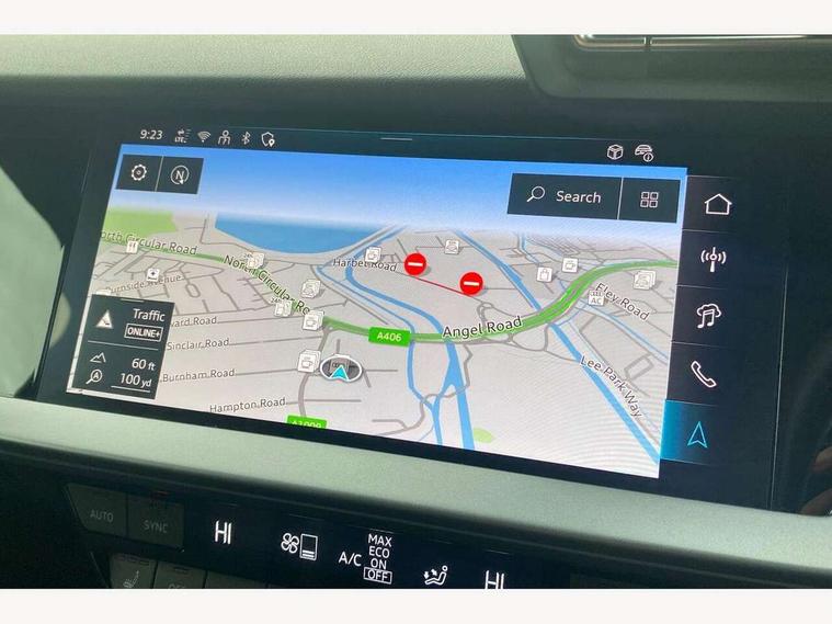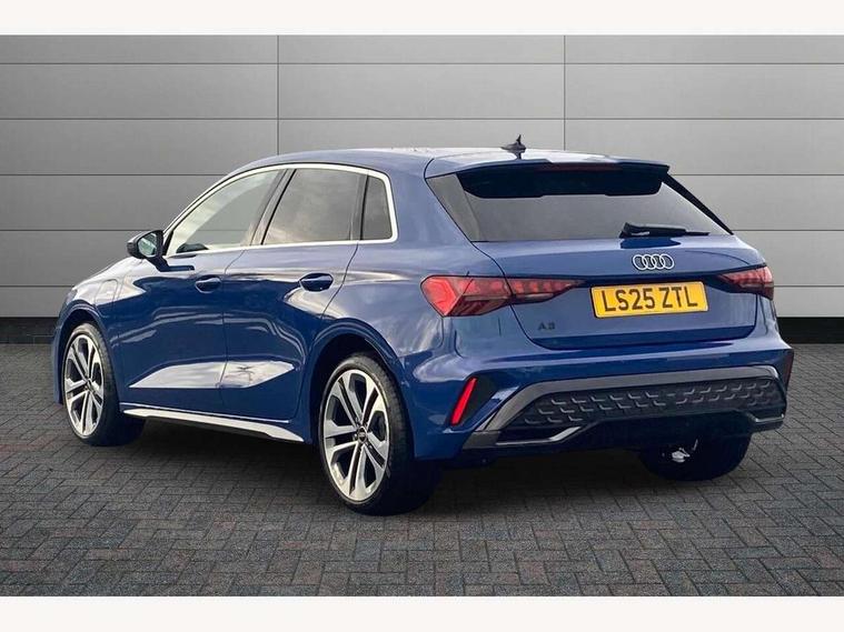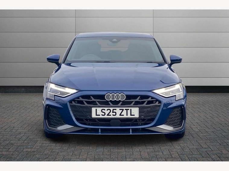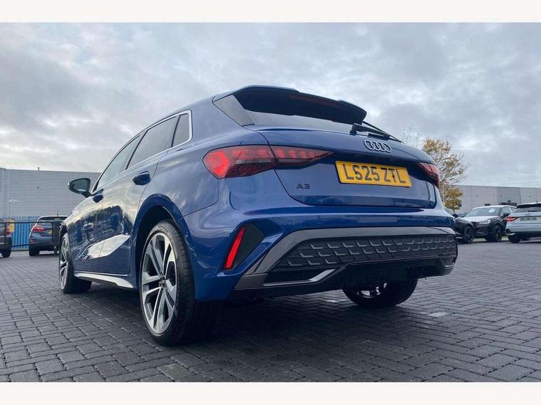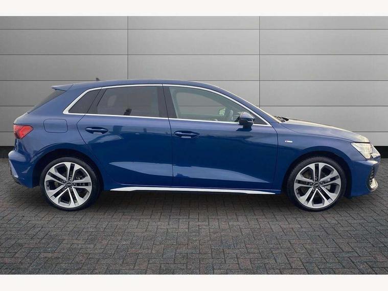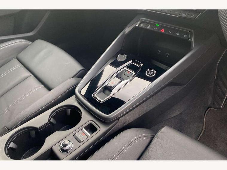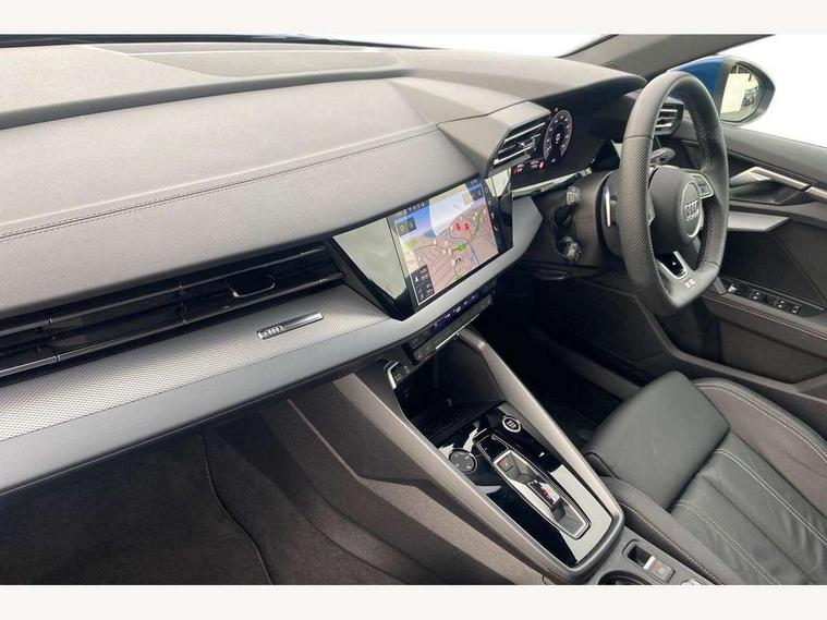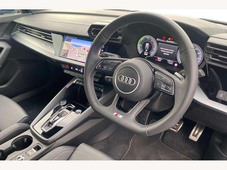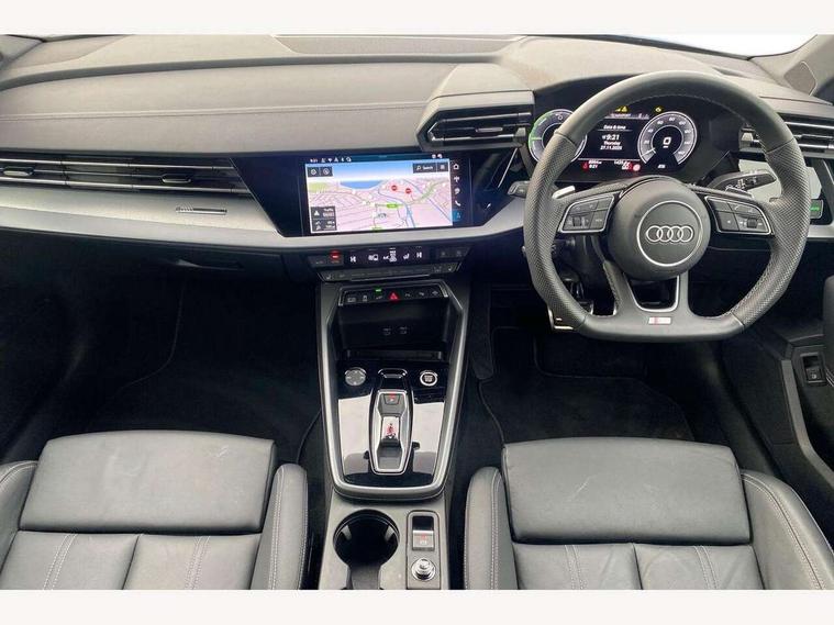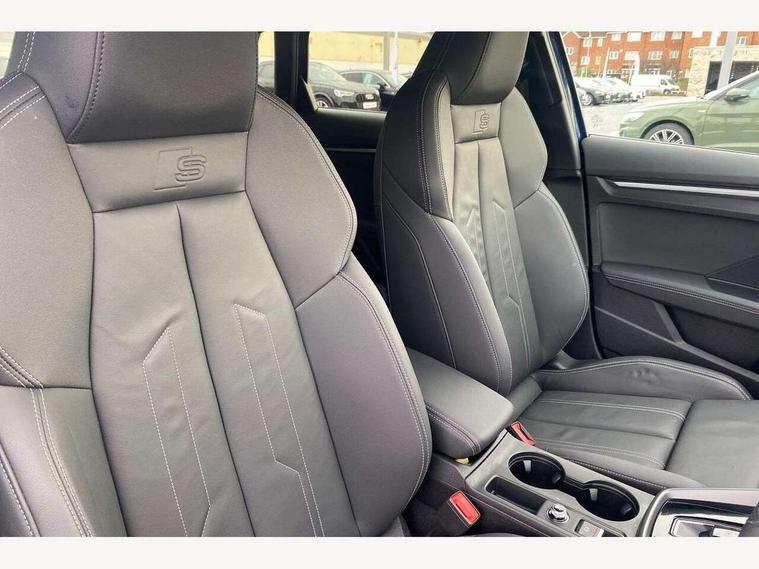 Adjustable speed limiter, Audi drive select, Audi smartphone interface with app store includes wireless Apple carplay, Android auto and Amazon alexa integration, Audi virtual cockpit plus - 12.3" full HD resolution dynamic digital instrument cluster, Automatic start/stop system with recuperation, Bluetooth interface, Camera based traffic sign recognition, Collision avoidance assistant, Cruise control, Distraction and Fatigue warning, e-Call (emergency call), Electromechanical power speed sensitive steering, Lane departure warning system, MMI Navigation Plus with high resolution 10.1" colour touch screen display, Park Assist with parking system Plus, Service indicator, Trip computer, Voice control system with natural language interaction, 3 pin 10 amp domestic charging cable, CCS socket for DC charging, Charging cable for public charging, mode 3 (type 2), up to 22 kW (AC), Compact charging system, Industrial connector CEE 32 A, 230 V, length 1.6 m, Standard suspension, Type 2 socket for AC charging, Audi Phonebox light with wireless charging, Audi sound system - 10 loudspeakers including centre loudspeaker and subwoofer, DAB Digital radio, USB ports with charging function in the rear, Acoustic glass windscreen, Aluminium window trim, Auto dimming frameless rear view mirror, Body colour exterior mirrors, Chrome exhaust tailpipes, Electrically adjustable/heated/folding/auto dimming door mirrors with integrated LED indications + kerb view function for passenger side, Exterior model badging, Front and rear side air inlets in grained matt black with dark liquid chrome frame, Front electric windows, Front radiator grill in high gloss dark chrome, Heat insulating glass windscreen, Illuminated door sills with aluminium inserts at the front with S logo, LED 3rd brake light, LED daytime running lights, LED headlights with LED rear lights and dynamic rear indicators, Light and rain sensors, Privacy glass - dark tinted rear window, rear door and side windows, Rear diffuser and grill in grained matt black with inlay in dark liquid chrome, Rear electric windows, Rear side wing doors, Rear wiper, S line bumpers, S roof spoiler, Side S line emblems on front wings, Side sill trim in dark liquid chrome, 12V socket and storage compartment in front centre console, 3 seat bench in 2nd row, 3 spoke flat bottomed leather multifunction sport steering wheel with gear shift paddles, 3-zone deluxe automatic air conditioning, 4 way electrically adjustable lumbar support for driver and front passenger, 40/20/40 split folding rear seat bench, Black cloth headlining, Convenience auxiliary air conditioning, Front and rear centre armrest in artificial leather, Front and rear centre armrest in artificial leather with contrasting stitching on armrests and instrument panel, Front and rear headrests, Front/rear floor mats, Heated front seats, Height and reach adjustable steering wheel, Manual boot compartment lid, Manually adjustable front seats, Rear cup holders, S badging on the steering wheel, Seat side bolsters, Single front passenger seat, Stainless steel pedals and front footrest in black, Twin leather upholstery with front sports seats S embossed logo, Aluminium interior elements pack - A3 Sportback, Multi-coloured LED interior lighting package - A3, 3x3 point rear seat belts, Acoustic vehicle alerting system, Driver and front passenger airbag with passenger airbag deactivation, Electronic Stabilisation Control (ESC) including ABS, ASR and EDL, First aid kit with warning triangle and 2 safety vests, Front side airbags with head airbags and interaction airbag, Hill hold assist, Pre-sense front with pedestrian and cyclist detection, Seatbelt monitoring, Tyre pressure loss indicator, Anti theft alarm, Anti-theft wheel bolts, Electronically operated child locks, Immobiliser, Remote central locking with safelock, Dash & door Inlay in dark aluminium Spectrum, Tyre repair kit,