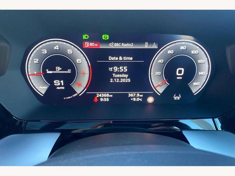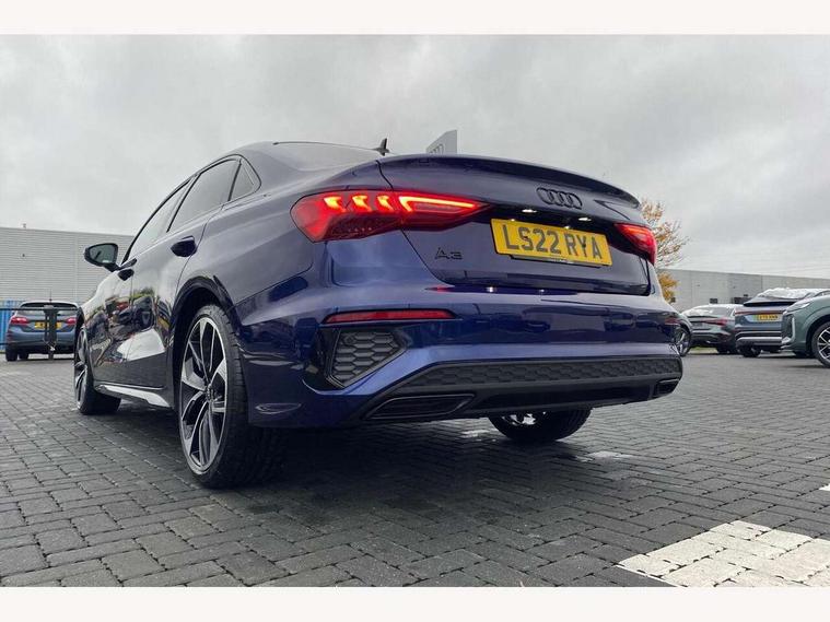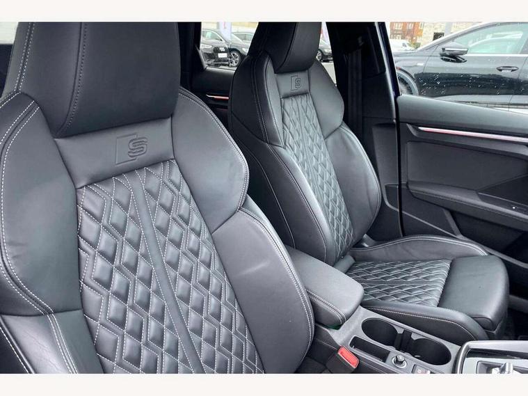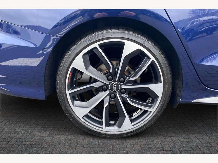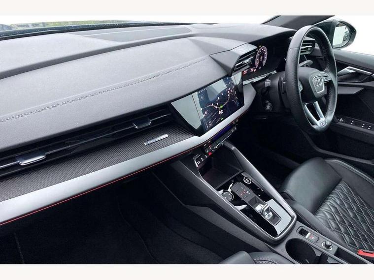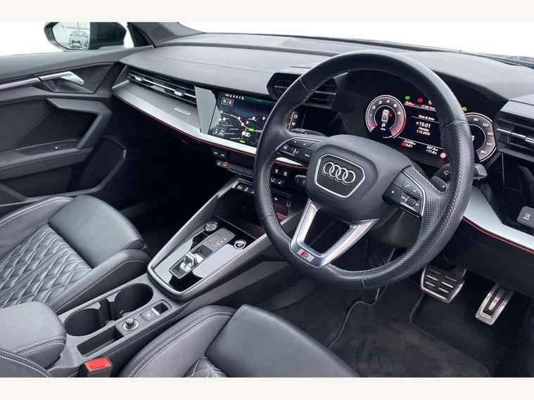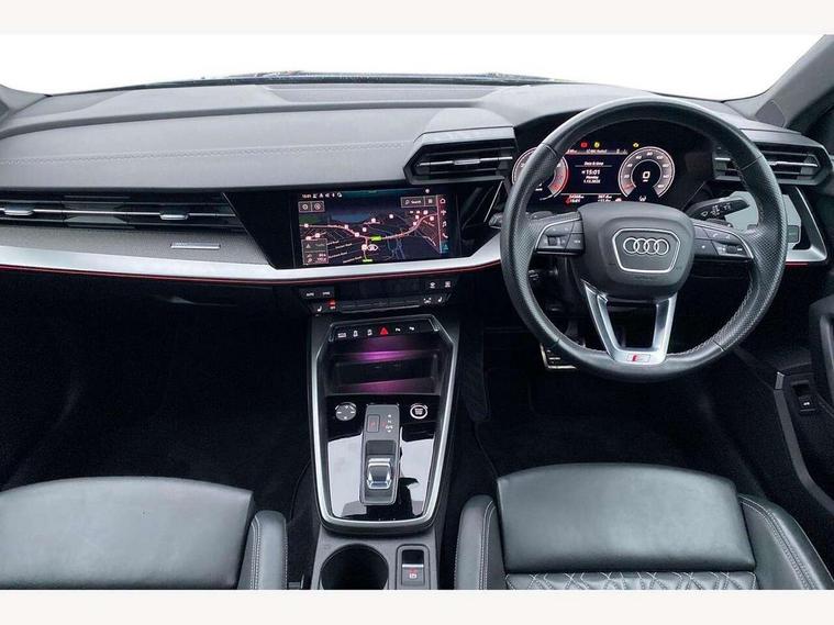 Audi connect emergency call and service, Audi drive select (Auto, Comfort, Dynamic, Efficiency and Individual), Audi smartphone interface, Audi virtual cockpit plus - 12.3" dynamic digital instrument cluster, Automatic start/stop system with recuperation, Bluetooth interface, Collision avoidance assistant, Electromechanical power speed sensitive steering, Head up Display, Lane departure warning system, MMI Navigation Plus with high resolution 10.1" colour touch screen display, Reversing camera, Service indicator, Voice control system with natural language interaction, S sports suspension with damper control and lowering by 15mm, 2x USB Type C ports (for charging and data transfer), Bang and Olufsen premium sound system with 3D sound, CD player, DAB Digital radio, 3rd brake light, Acoustic glass windscreen, Audi Beam uses LEDs to project Vorsprung onto the ground as you exit your A3, Audi matrix LED headlights, LED rear lights, dynamic front and rear indicators and headlight cleaning system, Auto dimming frameless rear view mirror, Electric panoramic sunroof, Electrically adj heated/folding + automatically dimming exterior mirrors + automatic kerb side function for passenger side exterior mirror, Front electric windows, Illuminated door sills with aluminium inserts at the front with S logo, Integrated LED indicators in door mirrors, LED daytime running lights, Light and rain sensors, Model and engine designation badges at rear, Privacy glass - dark tinted rear window, rear door and side windows, Rear electric windows, S roof spoiler, 12V socket and storage compartment in front centre console, 3 spoke leather multifunction steering wheel with gear shift paddles, 4 way electrically adjustable lumbar support for driver and front passenger, 40/20/40 split folding rear seat bench with cupholder, Black cloth headlining, Dual zone electronic climate control, Electrically adjustable front seats, Fine Nappa leather upholstery with front sports seats S embossed logo, Front and rear centre armrest in leather, Front and rear headrests, Front/rear floor mats, Heated front seats, Height and reach adjustable steering wheel, Interior lighting - glove compartment light and right hand side, Luggage compartment floor covering, Seat side bolsters, Stainless steel pedals and front footrest in black, Aluminium interior elements pack - A3 Saloon, Black styling pack - A3 Saloon Vorsprung, Driver Assistance pack - A3 Saloon, Extended ambient lighting pack - A3/S3 Saloon, LED interior lighting pack - A3 Saloon Edition 1/Vorsprung, 3x3 point rear seat belts, Driver and front passenger airbag with passenger airbag deactivation, Electronic Stabilisation Control (ESC) including ABS, ASR and EDL, First aid kit with warning triangle and 2 safety vests, Front side airbags with head airbags and interaction airbag, Hill hold assist, Pre-sense front with pedestrian and cyclist detection, Seatbelt monitoring, Tyre pressure loss indicator, Advanced key and power operated tailgate - Luggage compartment lid opens electrically, Anti theft alarm, Anti-theft wheel bolts, Electronically operated child lock, Immobiliser, Remote control central locking, Aluminium air vent surrounds, Aluminium trim elements, Carbon inlays, accent surfaces in the dashboard and centre console in platinum grey silk effect paint finish,