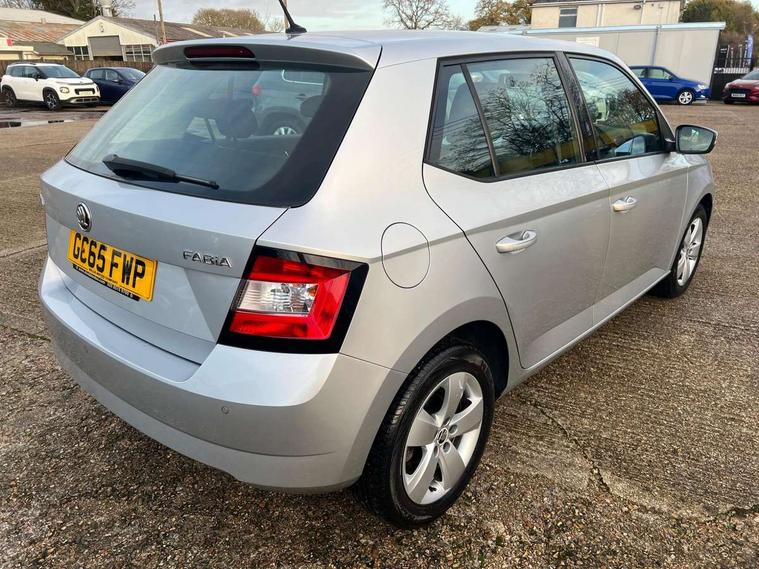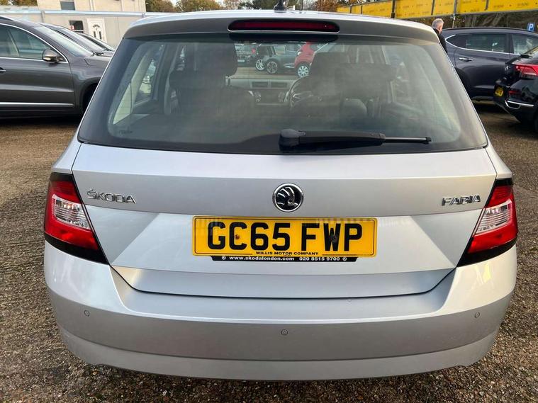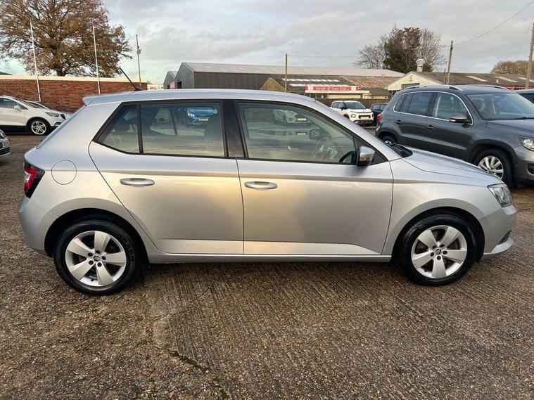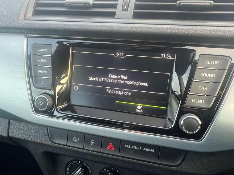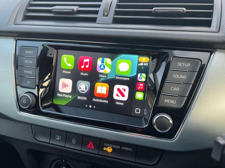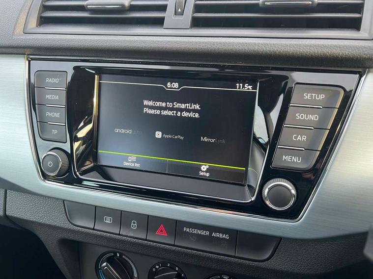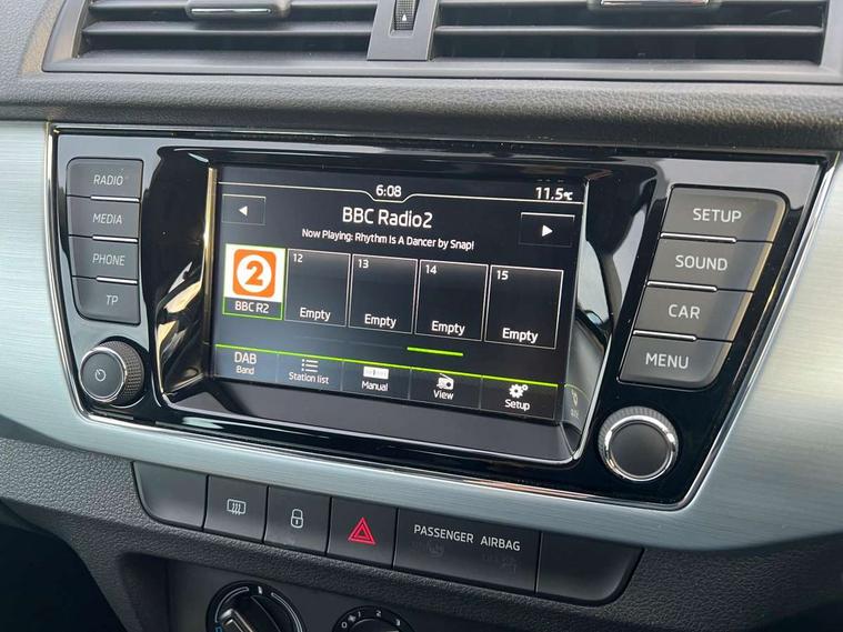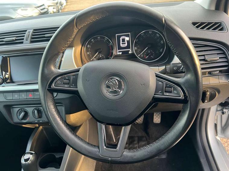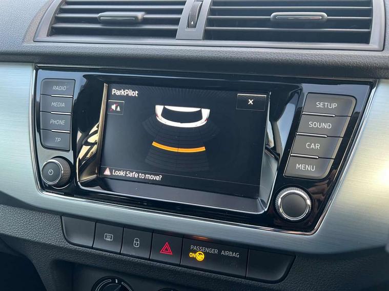 Bluetooth system, Exterior temperature gauge, Front assistant collision mitigation, Maxi dot trip computer, PAS, Service interval indicator, SmartLink, Auxiliary socket for external MP3 player, Bolero radio with telephone control, Mirror Link, USB and SD card, DAB Digital radio, Body colour bumpers, Body colour door handles, Chrome grille surround, Electric front windows, Electrically adjustable and heated door mirrors, Heated rear window, Height adjustable headlamps, Intermittent rear wash/wipe, Tinted rear windows, Tinted windscreen, 1.5L bottle holder in front door panels, 2 height adjustable rear headrests, 60/40 split folding rear seat, Boot stowage box, Cargo area storage tray, Cloth upholstery, Driver + passenger vanity mirrors, Folding grab handles, Front reading lights, Height adjustable driver's seat, Height adjustable front headrests, Height adjustable passenger seat, Height/reach adjust steering wheel, Interior light with delay, Leather gearshift, Leather handbrake, Lower glovebox cover, Luggage load hooks, Parcel shelf, Pollen filter, Rear courtesy light, Rear storage trays, Storage compartment under front seats, Ticket holder, Two rear outer seat isofix location points, Arkamys surround sound pack - Fabia, Chrome Pack - Fabia, 3x3 point rear seatbelts, ABS, Curtain airbags, Driver and passenger airbags, Driver and passenger side airbags, EDS, ESC with ASR, Front seatbelt pretensioners, Hill hold control, Hydraulic Brake Assist (HBA), Motor Slip Regulation (MSR) - Engine Drag Torque Control, Passenger airbag deactivate switch, Seatbelt warning, Tyre pressure monitor, Alarm with interior monitoring, Immobiliser, Locking wheel bolts, Remote central locking,