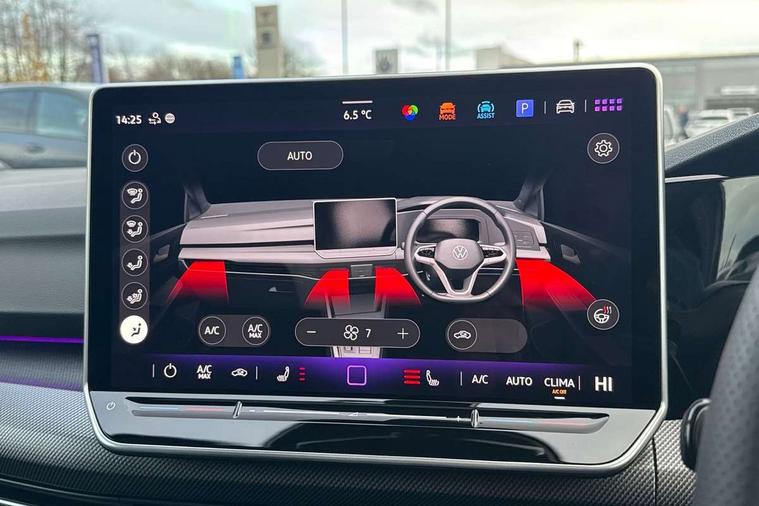 Activated carbon canister, Adaptive cruise control (ACC), Advanced driver attention and drowsiness monitor, Dynamic road sign display, Dynamic steering, E-Sim card for online connectivity, eCall emergency call system, Multi-color Digital cockpit pro, selection of different info profile possible, Multifunction front facing camera for distance control, Navigation system, Oncoming vehicle braking when turning including swerve support, Speed limiter, Speedo, rev counter, electronic odometer, trip, service interval display, exterior temperature and fuel gauge, Traffic jam assist, Voice enhancer and voice control, Warning signal and warning light for front and rear seatbelts not fastened, We connect plus preparation, We connect preparation, Wireless app connect, Hybrid propulsion system, Petrol Particulate Filter, Start-stop system with battery regeneration (recuperation - energy recovery during braking), XDS electronic differential lock for improved traction and handling, 2 USB C ports in front, 2 USB charging sockets on the centre console in the rear charging capacity upto 45W, Digital radio reception (DAB), Diversity antenna for FM reception, Gaming platform via car app, Infotainment system with 12.9" display, Mobile phone interface with inductive charging feature, 3rd brake light, Automatic headlamp activation with Coming home and Leaving home feature, Body colored bumpers in R-Line style, Body colour door handles, Exterior mirrors convex on the left and aspherical on the right, Front and rear electric windows, Heat insulating windshield made of laminated glass, LED separate daytime running light, Rear exhaust tailpipe, Rear fog light on one side and reversing lights on both sides, Rear side wing doors, Rear windscreen washer and wiper with interval delay, Remote electrically foldable door mirrors, puddle lights and reverse activated passenger's door mirror, Welcome light with surround lighting, 12V socket in front centre console, 12V socket in luggage compartment, 3 rear head restraints, 3 seat bench in 2nd row, Ambient lighting with 30 colour including LED light unit in front footwell with selectable light colour, Black roof lining, Brushed stainless steel pedals, Chrome plated radiator grille inserts, air vent surrounds and light switch surrounds, Door insert, side trim panel and arm support in leatherette, Front + rear black carpet mats, Front centre armrest, Front seat lumbar support adjuster, Integrated front head restraints, ISOFIX anchors for child seats on outer rear bench seats and on front passanger seat compatible for i-Size, Luggage compartment lighting, Manual height adjustable front passenger seat, Manually height adjustable driver seat, Plastic gear knob, Premium sports seats in front, Rear cupholder and loadthough, Sardegna cloth upholstery with front and outer rear seats Art Velour inner sides of bolsters, Single front passenger seat, Split folding backrest with centre armrest and unsplit rear seat bench, Sun visors with illuminated vanity mirrors, Titanium black instrument panel, 3 point height adj front seatbelts + pretensioners, 3 rear three point seatbelts, ABS, Autonomous emergency braking front assist with pedestrian and cyclist monitoring, Child locks on rear doors, Driver and front passenger airbag with front passenger airbag deactivation, Electronic parking brake with auto hold, ESC (Electronic Stability Control), Extended pedestrian protection measures, Hill start assist, Rear disc brakes, Two tone horn, Tyre pressure loss indicator, Volkswagen roadside assistance, Anti theft wheel bolts, Preparation for alcohol interlock, Decorative inserts carbon grey for dashboard and front door trim panels, Tool kit for tyre mobility set, Tyre mobility kit Includes 12V compressor and tyre sealant,