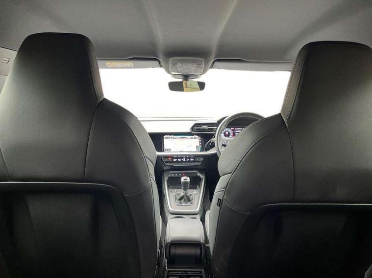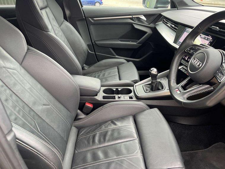 Audi drive select (Auto, Comfort, Dynamic and Individual), Audi smartphone interface, Audi Virtual Cockpit - 10.25" digital and colour instrument cluster, Automatic start/stop system with recuperation, Bluetooth interface, Collision avoidance assistant, Cruise control, e-Call (emergency call), Electromechanical power speed sensitive steering, Lane departure warning system, MMI Navigation Plus with high resolution 10.1" colour touch screen display, Rear parking sensors, Service indicator, Trip computer, Voice control system with natural language interaction, 2xUSB-C connection with data and charging functions, 6 passive loudspeakers, DAB Digital radio, 3rd brake light, Acoustic glass windscreen, Aluminium window trim, Auto dimming frameless rear view mirror, Electrically adjustable/heated/folding/auto dimming door mirrors with integrated LED indications + kerb view function for passenger side, Front electric windows, Illuminated aluminium inserts front door sills with S logo, LED daytime running lights, LED headlights with LED rear lights and dynamic rear indicators, Light and rain sensors, Privacy glass - dark tinted rear window, rear door and side windows, Rear electric windows, Rear side air outlets in grained matt black, Rear side wing doors, Rear wiper, S line bumpers, S roof spoiler, 12V socket and storage compartment in front centre console, 3 seat bench in 2nd row, 40/20/40 split folding rear seat bench with cupholder, Black cloth headlining, Dual zone electronic climate control, Front and rear centre armrest in leather, Front and rear headrests, Front/rear floor mats, Height and reach adjustable steering wheel, Illuminated vanity mirror, Interior lighting - glove compartment light and right hand side, Luggage compartment floor covering, Manual boot compartment lid, Manually adjustable front seats, Seat side bolsters, Single front passenger seat, Stainless steel pedals and front footrest in black, Twin leather upholstery with front sports seats S embossed logo, Aluminium interior elements pack - A3 Sportback, S line styling pack - A3 Sportback, 3x3 point rear seat belts, Audi pre sense front, Driver and front passenger airbag with passenger airbag deactivation, Electronic Stabilisation Control (ESC) including ABS, ASR and EDL, First aid kit with warning triangle and 2 safety vests, Front side airbags with head airbags and interaction airbag, Pre-sense front with pedestrian and cyclist detection, Seatbelt monitoring, Tyre pressure loss indicator, Anti theft alarm, Anti-theft wheel bolts, Immobiliser, Manual child locks, Remote control central locking, Accent surfaces in the dashboard and centre console in platinum grey silk effect paint finish, Dark spectrum aluminium inlays,