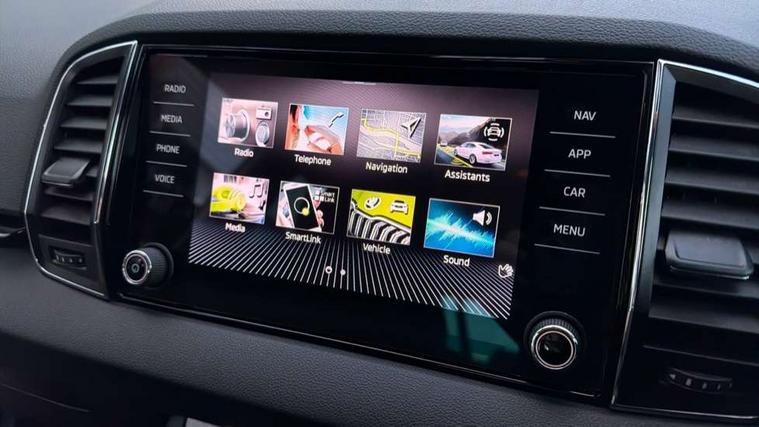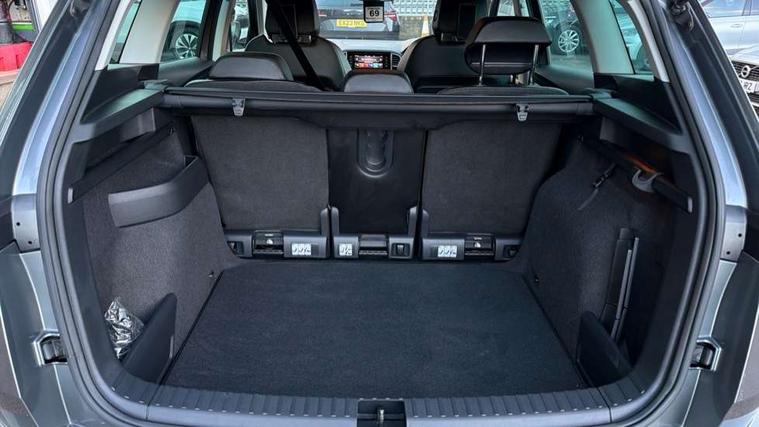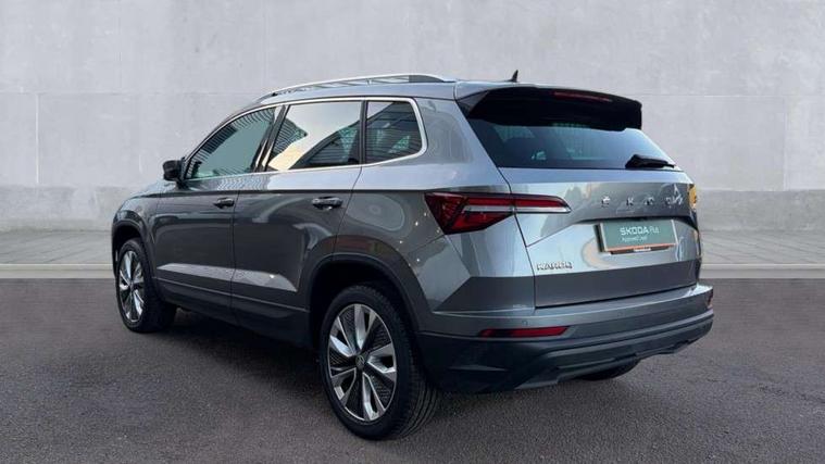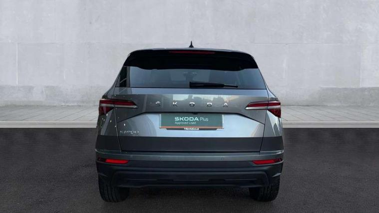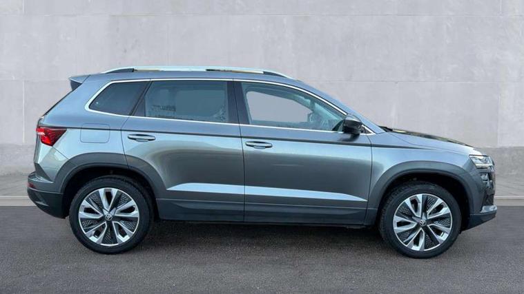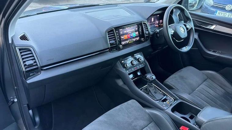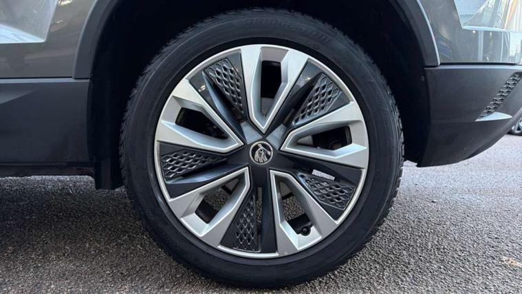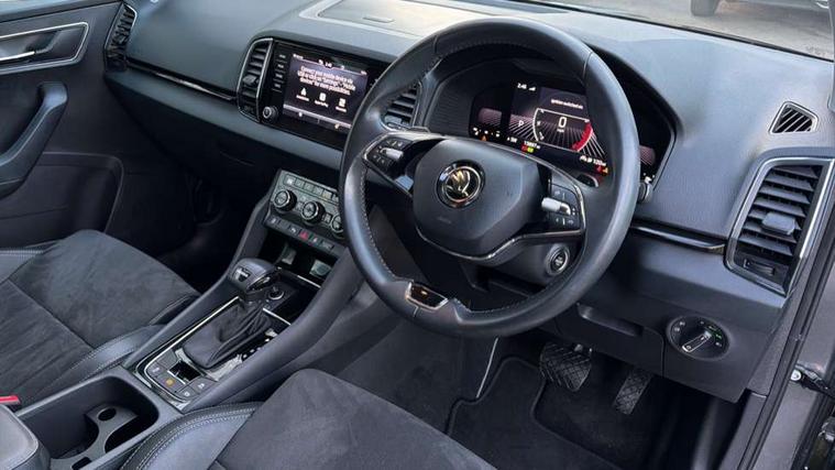 8" Digital display, Care connect, Driver fatigue sensor, Emergency services call system, Outside temperature gauge, Service interval indicator, SmartLink wireless for Apple and wired for Android, Start/stop system with regenerative braking, USB C Port x 2 in front centre console, 8 Speakers, DAB radio with Bluetooth, USB connection, Acoustic glass, Aero front windscreen wipers with intermittent function, Auto dimming rear view mirror with light and rain sensors, Black electric window control buttons, Body colour door mirrors and handles, Dynamic headlight range control with cornering light function, Electric front and rear windows with child proof lock, Heated rear windscreen, LED daytime running lights, LED rear lights with high functionality welcome effect and dynamic indicators, Light assistant (coming/leaving home/tunnel light), Plastic scuff plates, Privacy glass, Rear side wing doors, Rear spoiler, Rear window wiper with washer system and intermittent control, Safety reflectors on front doors, 1.5 litre bottle holders in driver and front passenger door panels, 12V socket in boot, 12v socket in front centre armrest with storage compartment and rear air vents, 2 Folding hooks and nets in boot, 2 spoke leather heated multifunction steering wheel with DSG paddles, 2 x Tablet holder, 3 rear height adjustable headrests, 3 seat bench in 2nd row, 4 foldable roof handles with rear coat hooks, Black floor carpet, Chrome inner door handles, Decorative door sills with KAROQ badging, Double sided boot floor, Foldable hooks in the boot, Front head restraints, Height adjustable front three point seats belts with tensioners, Height/reach adjust steering wheel, Ice scraper, Illuminated glovebox, Illuminated luggage compartment, Isofix child seat preparation for front passenger seat, Isofix child seat preparation outer rear, Manual lumbar support for front seats, Pen holder, Pollen filter, Rear boot cover, Rear reading lights, Rubbish bin door, Safety vest holder, Single front passenger seat, Storage box in upper central dashboard closed, Sunvisors with illuminated vanity mirrors, Textile floor mats, Ticket holder, VarioFlex seats with standard rear seat release, Chrome roof rails + chrome pack - Karoq, Parking pack - Karoq, Automatic door unlocking in case of crash, Automatic fuel cut off in case of crash, Child locks on rear doors, Driver airbag, Electronic parking brake with auto hold function, Emergency rear braking signal, ESC including ABS, MSR, ASR, EDS, HBA, DSR, RBS, MKB and traction control, Front side airbags, Hill hold control, Knee airbags, Passenger airbag with switch-off function, Pedestrian monitor, Seatbelt reminder signalisation and pretensioner for all seats, Three point seatbelts rear, Two tone horn, Tyre pressure display, Tyre pressure monitor, Alarm with interior monitoring, back up horn and tilt sensor with safe function, Electronic engine immobiliser, Keyless entry and start/stop, Remote central locking with 2 remote folding keys, Chrome framed air vents, Anti-theft wheel bolts protection, Storage on wheel cover, Tool kit,