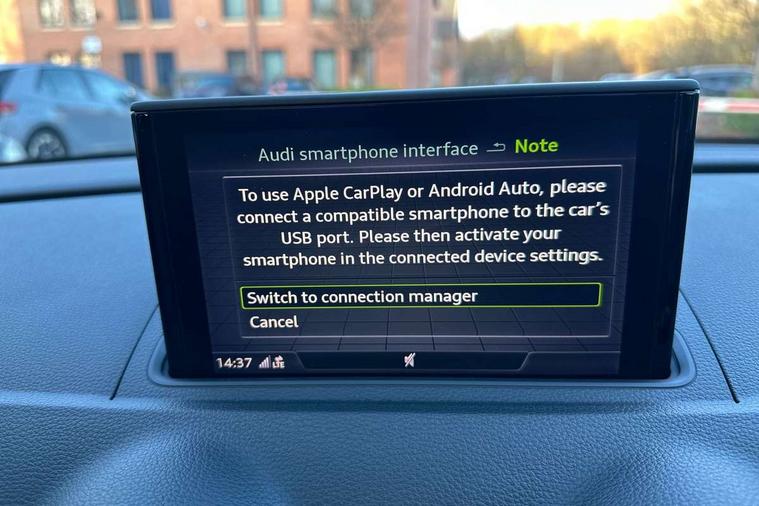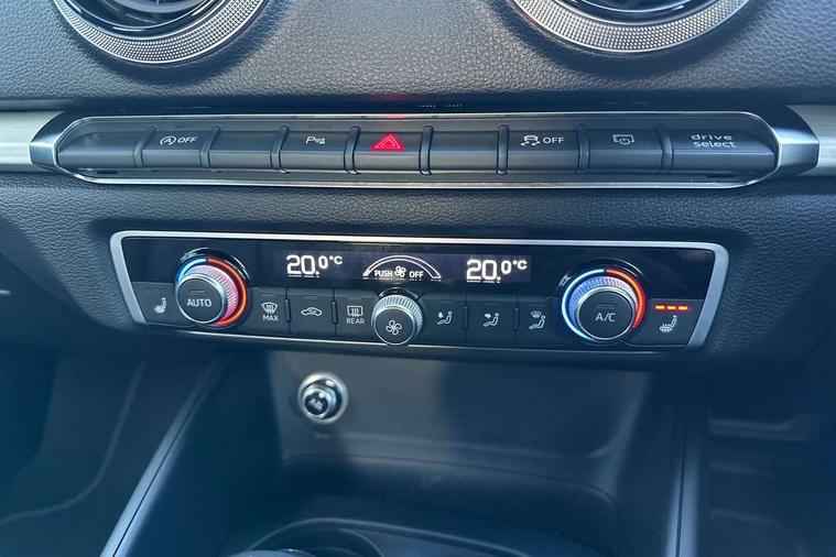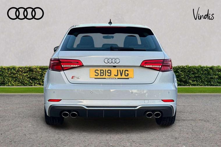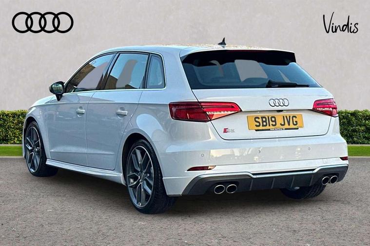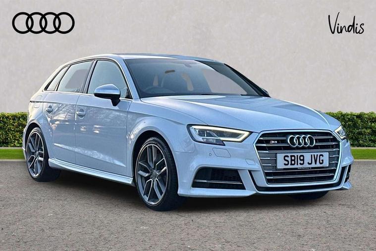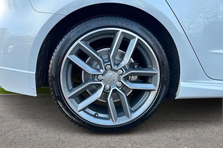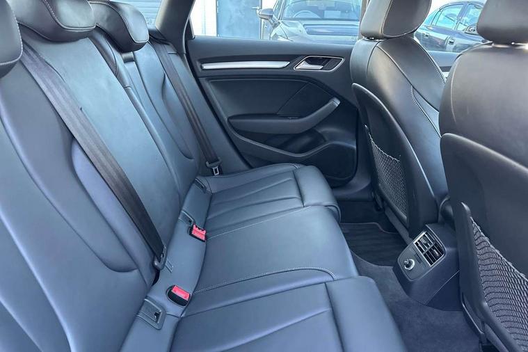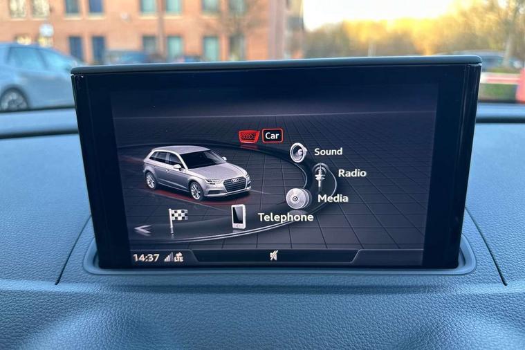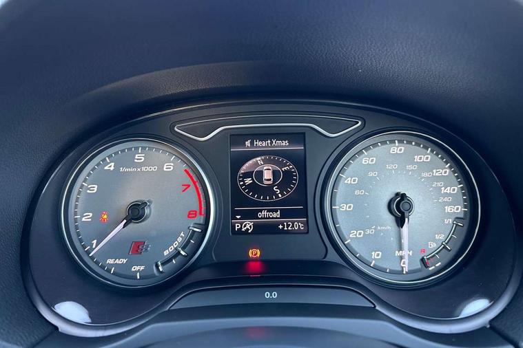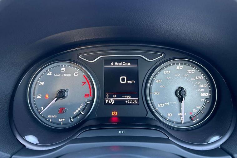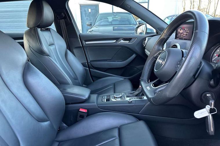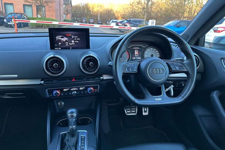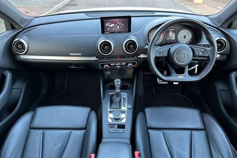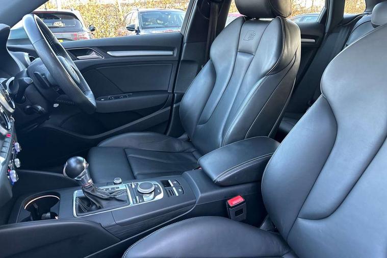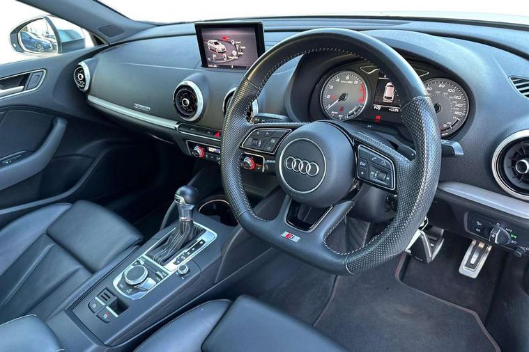 Audi connect, Audi drive select, Audi smartphone interface, Automatic start/stop system, Colour driver's information system display, Instrument dials with S3 logo, Mobile telephone preparation - bluetooth interface, Progressive power assisted steering, SD card based satellite navigation system, Service interval indicator, Speed limit display, Voice control system, Voice recognition for navigation system, S sports suspension, 2 USB interfaces and Aux-In jack, Audi music interface, CD player, DAB Digital radio, MMI radio plus with 7" colour MMI screen and MMI controller, Aluminium door mirror housings, Aluminium window trim, Audi Beam uses LEDs to project the Audi Sport logo, Auto dimming rear view mirror with light and rain sensors, Electric front windows, Electric rear windows, Electrically adjustable and heated door mirrors with integrated LED side indicators, Headlight washers, Heated windscreen washer jets, LED daytime running lights, Matt black radiator grille, Rear wiper, S body styling with front bumper 'S' specific air intake grille, rear diffuser with platinum grey insert, roof spoiler, Sport specific side air inlet grille and diffuser insert, Twin oval chrome trimmed exhaust tailpipes, 3 adjustable rear headrests, 4 lashing points to secure luggage, Adjustable front centre armrest, Black cloth headlining, Dual zone electronic climate control, Front and rear interior lights with delay, Front/rear floor mats, Glovebox light, Height and reach adjustable steering wheel, Illuminated door sill trims with S logo, Isofix child seat preparation for front passenger/outer rear seats inc passenger airbag deactivation, Stainless steel pedals, Storage compartments in doors side trims, centre console and under front drivers seat, LED interior light pack - A3/RS3, Non smoking pack - A3, Storage and luggage pack - A3/RS3, 3 point seatbelts on all seats, ABS/EBD, Active bonnet, Active front headrests, Airbags - front driver/passenger, front & rear side, curtain, drivers knee, ASR, EDL, Electromechanical parking brake, ESC - Electronic Stability Control + traction control, Front passenger airbag deactivation, Hill hold assist, Manual rear child locks, Multi-Collision braking, Seatbelt warning, Tyre pressure warning, Warning triangle and first aid kit, Anti theft alarm, Anti-theft wheel bolts, Remote control central locking, Thatcham category 1 alarm + immobiliser, Aluminium air vent surrounds, Aluminium trim elements, Matt brushed aluminium inlays, Tool kit, Tyre repair kit,
