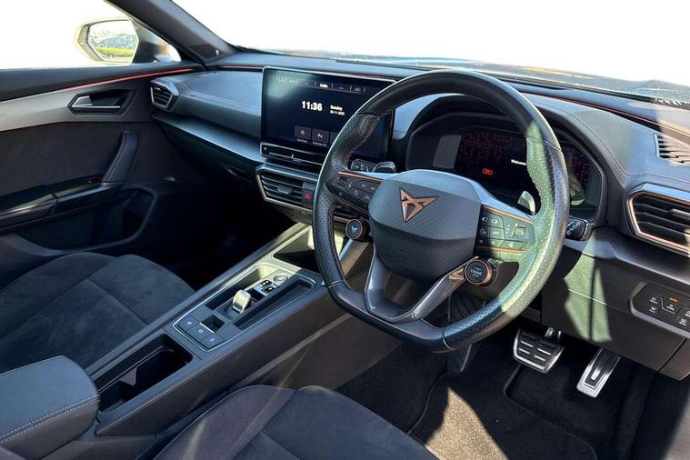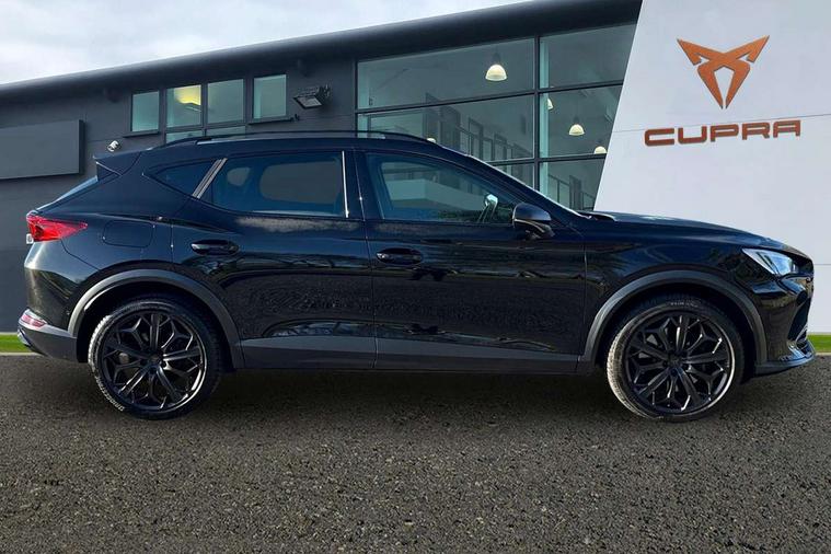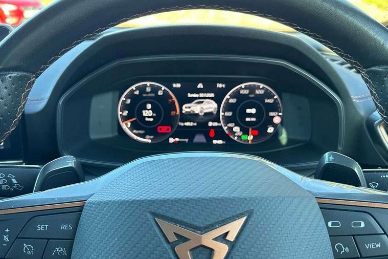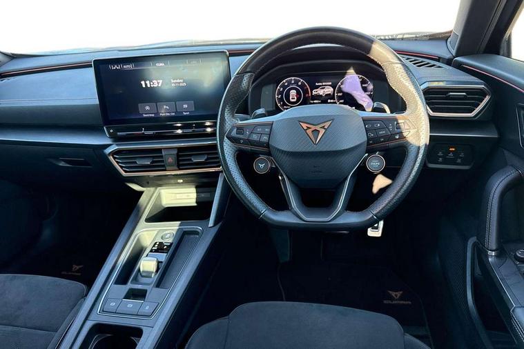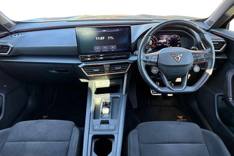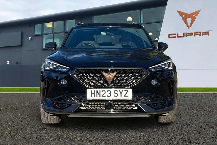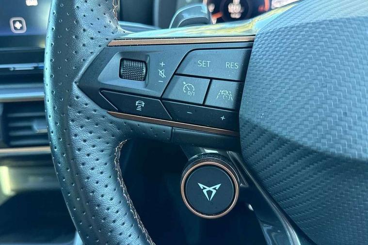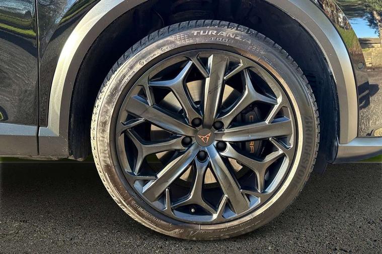 Digital cockpit and configurable dashboard, Driver alert system, Dynamic chassis control with driving profile selection (Comfort, Sport, CUPRA, Individual), Forward collision warning with automatic braking, Lane assist, Navigation system with 12'' Touchscreen Display, Park assist (inc front/rear parking sensors), Predictive adaptive cruise control with speed limiter, RPM, trip computer, outside temp gauge, instrument light brightness, low fuel warning light, lights on reminder, gearshift indicator, Service interval indicator, Speed sensitive power steering, Start/stop system with regenerative braking, Top view camera, Virtual pedal and electric tailgate, Voice control system, Wired Android Auto, Wireless apple carplay, Wireless phone charger, Electronic locking differential and dynamic traction support, Sports suspension with front shock absoption, 2 front and 2 rear USB type C sockets, Auxiliary input socket, Beats audio with 9 speakers plus subwoofer and 340W amplifier, DAB radio, Auto dimming rear view mirror, Body colour door handles, Body coloured bumpers, Cupra exterior black lettering, Daytime running light with automatic headlight control and coming home feature, Dynamic headlight range control, Electric front/rear windows, Electrically adjustable heated and folding door mirrors with memory function, Front fog lamps with cornering function, Front grill, cladding parts and exterior mirros housing painted in sport black matte, Gloss black roof rails and window surrounds, LED Taillights with dynamic indicator, Matrix LED headlights, Panoramic sunroof, Rain sensing wipers, Rear diffuser with twin exhaust pipe on each side, Rear side wing doors, Rear wash/wipe, Sports bumpers, Third brake light, Tinted rear windows, Welcome lights, 12v power supply in centre console, 12V socket, 12v socket in loadspace, 2 front and 2 rear reading lights, 230V socket, 3 seat bench in 2nd row, 60/40 split rear bench seat with armrest and mechanical seat release, Black headlining, Cupra sports pedals, Dinamica/leather upholstery + bucket seats, Dust/pollen filter, Electrically adjustable with memory function for driver seat, Front and rear head restraints, Front centre armrest, Heated front seats, Height/reach adjust steering wheel, Illuminated interior front door sills, Illuminated sunvisor with mirror, Isofix, Leather heated multi-function sports steering wheel with start stop, CUPRA mode button and gear shift paddles, Luggage tie-down hooks, Single front passenger seat, Three zone climate control with control panel in rear, Variable luggage/load compartment floor, Wraparound lighting, Safety and driving pack (XL) - Formentor, 3 point seatbelts on all rear seats, ABS, Brake control system - ESC and brake booster, Child proof door locks, Driver and front passenger airbags with front passenger airbag de-activation, Electronic parking brake, Front and rear disc brakes, Front side curtain airbags, Hill hold control, Public e-call, Seat belt reminder for front and rear seats, Tyre pressure monitoring system, Anti theft alarm system, Keyless entry and start system (KESSY), Locking wheel bolts, Copper and aluminium interior detailing, Leather dashboard, dinamic door insert and side trim panel, 19" Sport matt black alloy wheels, Tyre repair kit,