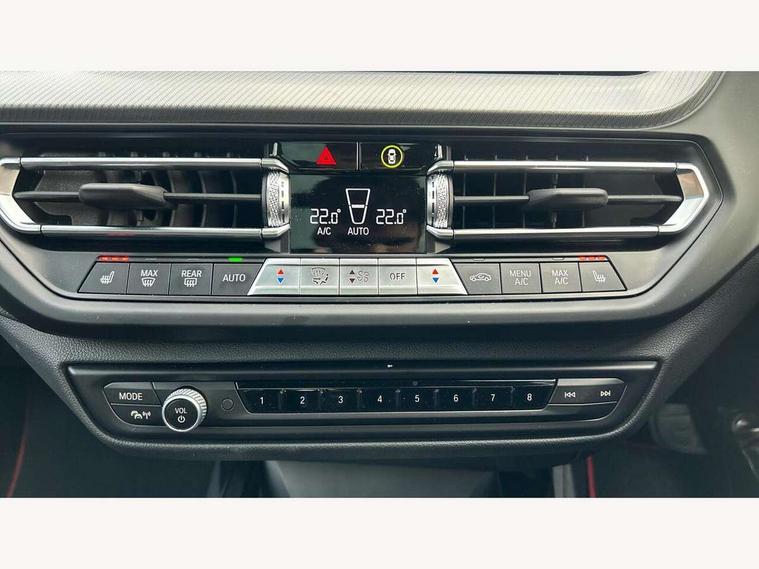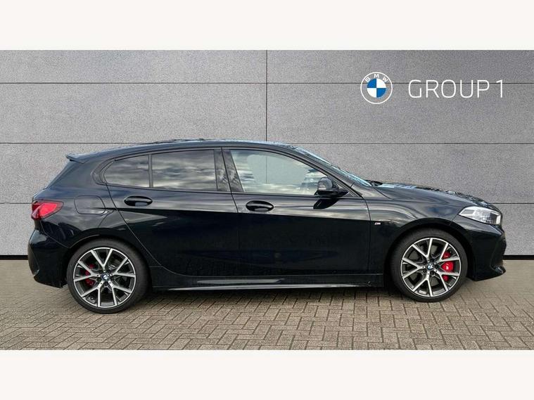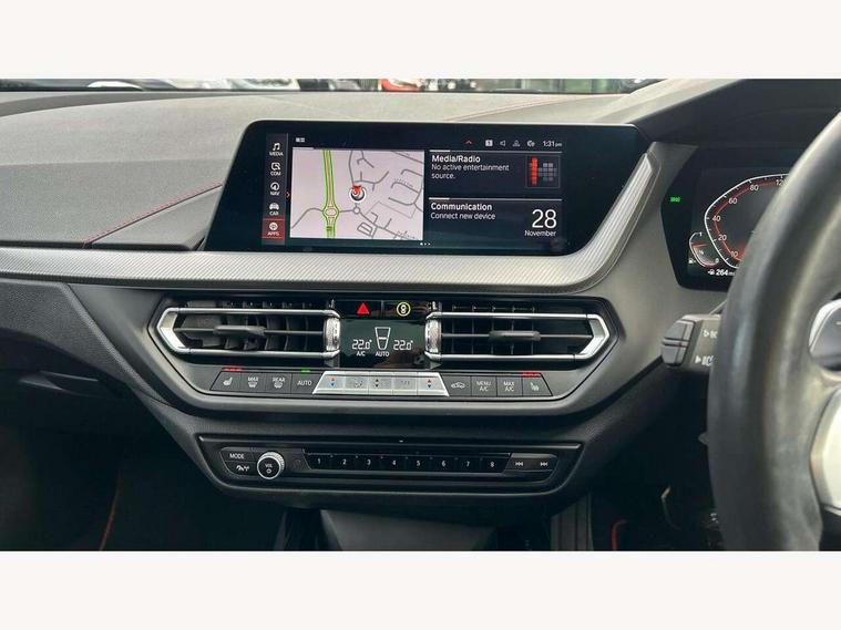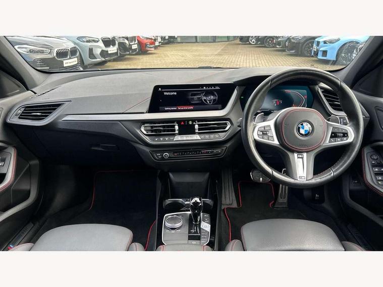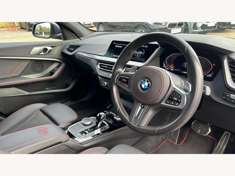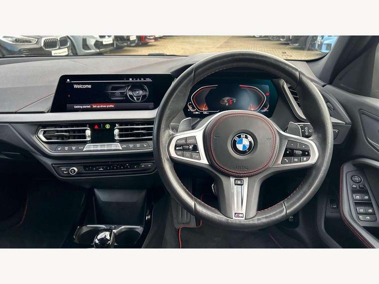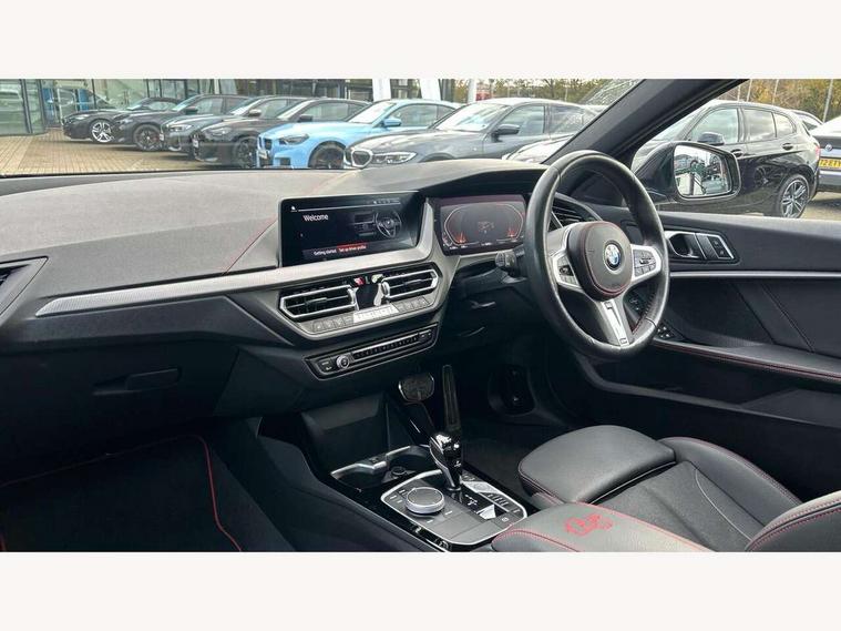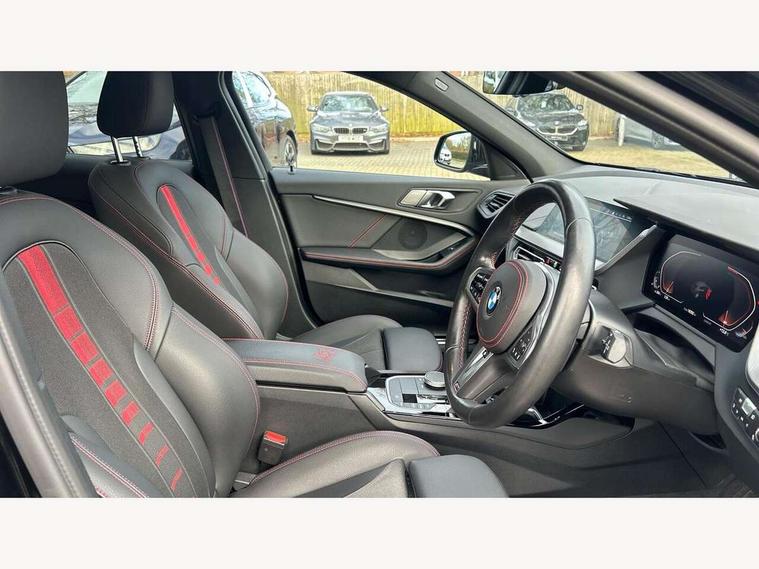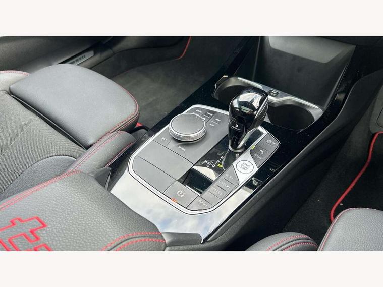 Active guard plus, Attentiveness assist, BMW ConnectedDrive online services, BMW Teleservices, Check Control warning system for monitoring of lights and door/luggage compartment open warning, Cruise control with brake assist, Eco pro mode, Electric power steering with Servotronic steering optimised at all speed ranges, Front axle single joint with specific axle kinematics to minimise drive influences on steering + provide increased rigidity agile driving behaviour, Integrated owners handbook, Lane departure warning system, Oil sensor for level and grade, On board computer, Optimum shift indicator, Personal Profile, Pull away assistant, Rigidly mounted rear subframe - Multi link construction with separate spring / damper configuration and excellent driving characteristics, Speed limit Info including no-overtaking indicator, Speed limiter, Aluminium lightweight construction, Anti roll bar front and rear, Balancer shaft, Double VANOS twin scroll turbocharging system, Drive Performance Control, Eight speed sport automatic transmission with gearshift paddle switches, Electronic differential lock, High precision injection, Larger fuel tank capacity (50 litres), M sport suspension with M128i xDrive specific settings, Petrol Particulate Filter, Twin tube gas filled shock absorbers with degressive characteristic curve, VALVETRONIC engine management, DAB Digital radio, Auto dimming rear view mirror, Automatic headlight beam throw control, Automatic windscreen wipers and automatic headlight, Black chrome tailpipe finishers, BMW individual high gloss shadow line with extended content, Body colour door handles, Body colour mirror caps, Body colour roof trims, Chrome 'M' logo side designation, Chrome kidney grille frame with Satin Aluminium struts, Direction indicator side lights in exterior mirrors, Fading support, Folding side mirrors with auto dimming/folding wing mirrors with auto dimming, Follow me home headlights, Front and rear bumper system with replaceable deformation elements, Front and rear electric windows with open and close fingertip control, anti trap facility and comfort closing, Front door sill finishers in black plastic with M designation in metallic look, Green tinted heat protection glazing, Heated, electrically adjustable exterior mirror aspheric on driver side, convex on passenger side, High gloss shadowline window frame, Recess cover mirror frames and B/C pillar embelisher trim, High level third brake light, Integrated front windscreen with washer jets, Kidney frame and struts in high gloss black extended, LED daytime running lights, LED eyebrow turn indicators, LED front fog lights, LED Headlights, Lightweight engineering, Matt black air guide grilles, Matt black wheel arch trim, Model designation on electric bootlid, Nearside reverse light in rear light cluster, Preparation for high beam assistant, Rear fog lights, Rear side wing doors, Rear window wiper, Shark fin antenna, Trailer stabilisation logic, Visible VIN plate, Welcome lighting, 12V power socket in front centre console with blanking plug, 3 rear seat head restraints, 3 seat bench in 2nd row, Anthracite headlining, Black boot net with lashing eyes, Cargo function on 2nd seat row, Centre armrest in black/red highlight including embroidered 'ti' designation in red, Child seat ISOFIX attachment for two outer rear seats and front passenger seat with anchorage points, Conditioned based service, Driver and front passenger seat heating, Floor mats with red binding, Folding rear clothes hook, Four grab handles integrated in roof lining, Front and rear door pockets with bottle holders, Front and rear side armrest integrated into door trim, Front armrest, Front sports seats, Glove compartment, Height adjustable front head restraints, Instrument panel top section , door armrests and door panels in black/red highlight, Luggage compartment for bag hooks on left and right, foldable luggage compartment liner and four lashing eyelets, Manual adjust steering wheel, Multi-function controls for steering wheel, Single front passenger seat, Storage compartment in centre console, Sun visors with vanity mirrors and insert tab, Three spoke M sport design multi function leather steering wheel in unique red stitching, Two front centre console cupholders, Two zone automatic air conditioning, Additional interior lighting pack - 1 Series, BMW live cockpit professional pack- 1 Series, Connected pack professional - 1 Series, Interior lights pack - 1 Series, M Sport exterior styling aerodynamics pack - 1 Series, 2 tone horn, 3 point seatbelts on all seats, front pyrotechnic belt tensioners, stopper and belt force limiters, rear coded belt buckles, Airbags - Front driver/passenger, front and rear curtain head protection, front side, manual deactivation of front passenger airbag, Anti lock braking system (ABS) with brake assist, BMW emergency call, Brake drying, Braking readiness, Child proof locking system in rear door, City braking function, Comfort modes, Cornering brake control, Crash sensor activating central locking release, hazard warning lights, fuel cut off, interior lighting + activation of safety battery terminal clamp, Driver and front passenger seat belt security check, Dynamic stability control + (DSC+), Dynamic Traction Control - DTC, Electrically operated hand brake including automatic hold function, Front and rear disc brakes, M Sport brakes with red calipers, M Sport seatbelts, Seatbelt warning, Side impact protection, Tyre pressure monitoring system, Warning triangle and first aid kit, Central locking switch for all doors, fuel filler cap and luggage compartment, Deadlocking function system to all doors, Drive away locking system on all doors and luggage compartment with de-activated in iDrive settings, Locking wheel bolts, Remote control with integrated key with High-gloss Black inlay and M designation and 1 button for open/ close lock, window, open luggage compartment, Start/stop button illuminated in centre console with keyless e
