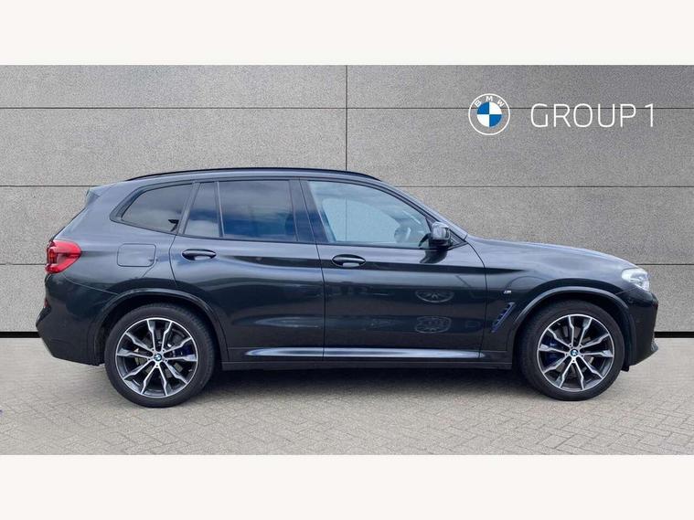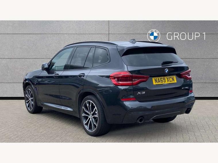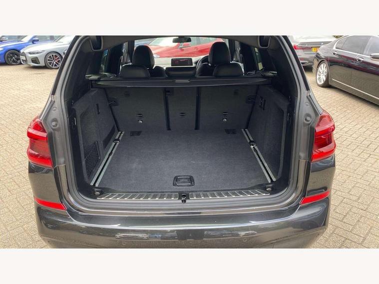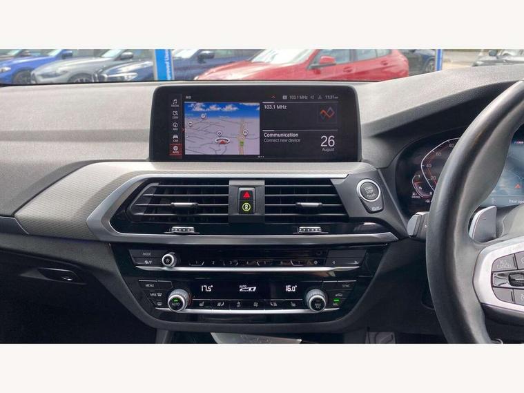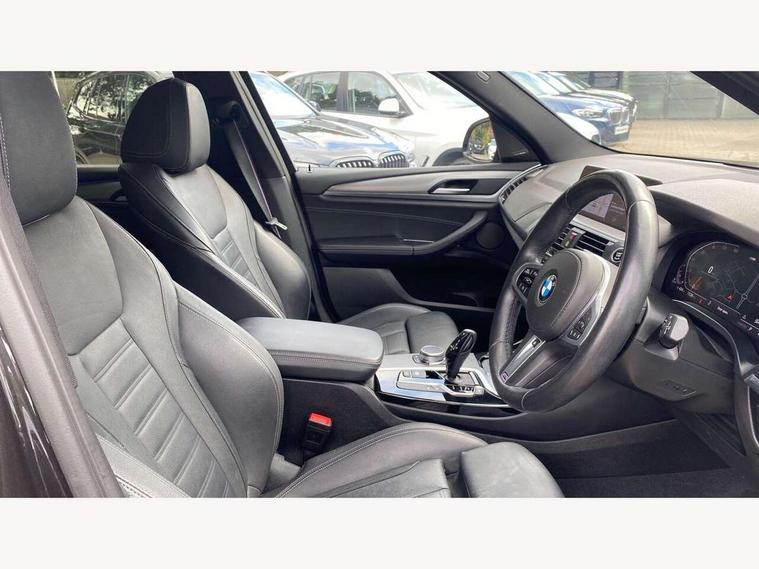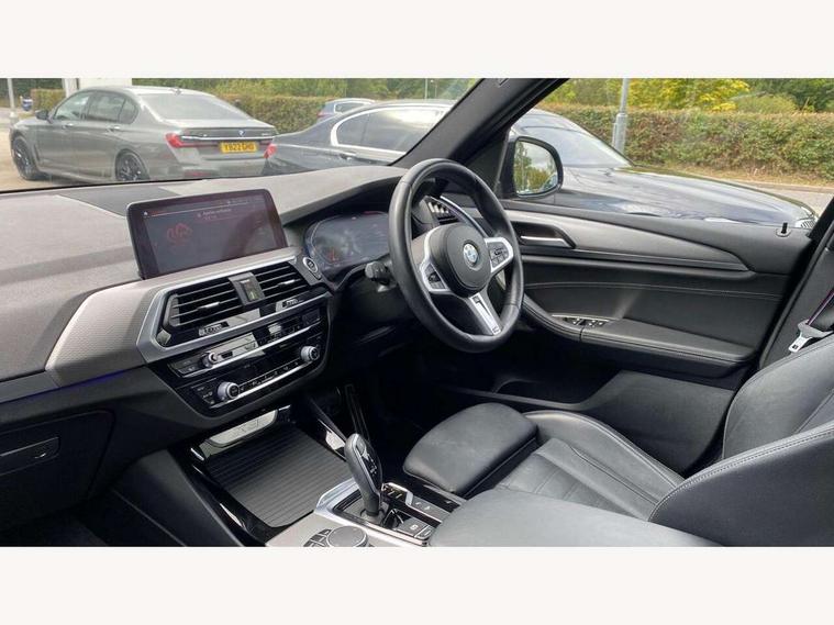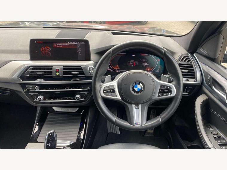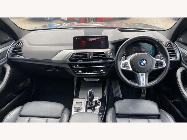 Active Guard incl speed limiting and lane departure functions with auto steering, and front collision warning with brake intervention, Attentiveness assist, Automatic tailgate operation, BMW Live Cockpit Professional sat nav system including 10.25" high resolution display and Intelligent Voice Assistant, BMW Online services, BMW Teleservices, Brake pad wear indicator in front and rear, Check Control warning system for monitoring of lights and door/luggage compartment open warning, Control display - 6.5" colour display screen, Electric Power Steering (EPS) with Servotronic, Front/rear Parking distance control, iDrive Controller with 8 favourite buttons, Lights on warning by audio warning signal when ignition is switched off, Navigation system - BMW Professional multimedia with Hard disc drive (HDD) and 10.25" touch display, Oil sensor for level and grade, warning by check control system, On board computer - average speed+fuel consumption, service interval, clock/date, odometer/trip meter, outside temperature display and ice warning, Optimum shift indicator, Personal Profile - automatic lock when driving away selectable, Real time traffic information, Semi digital instrument cluster, Stop/start system, Automatic transmission with gearshift paddles, Diesel particulate filter, Incorrect fuelling protection, Larger capacity fuel tank, Multi-link rear suspension, Performance Control, Auxiliary socket for external MP3 player, BMW professional radio/CD/MP3, DAB Digital radio, Acoustic glazing, Black finish on B pillars, Body colour door handles, Body colour electric adjust heated aspherical door mirrors, Body colour roof mouldings, Body coloured bumpers, Chrome kidney grille with high gloss black vertical slats, Direction indicator, side repeaters, integrated in exterior mirrors, Dual chrome exhaust, Dynamic brake lights, Exterior mirrors - electrically folding with anti-dazzle, Fingertip control / anti-trap function on electric window, Follow me home headlights, Front and rear bumper system with replaceable deformation elements, Front and rear electric windows, Green tinted heat insulating glass, Heated windscreen washer jets, Height adjustable headlamps, High gloss black door sill finishers, High gloss black shadow line roof rails, High gloss shadowline exterior trim in decorative moulding side frame/recess cover/guide rail/B, C pillars/mirror frame and triangle with mirror base, High level 3rd brake light incorporating LED Technology, Interior rear view electrochromatic mirror with automatic anti dazzle function, LED front fog lights, LED tail lights, Lightweight engineering, M aerodynamic bodystyling, Model designation, Rain sensor including auto headlights activation, Rear wiper, Shark fin antenna, Visible VIN plate, Welcome lighting, Windscreen wipers with adjustable interval, 12V socket in centre console and luggage area, 3 rear headrests, 3 zone automatic air conditioning, 4 lashing points to secure luggage, Ambient lighting, Anthracite headlining, Anthracite Velour floor mats, Driver/passenger sunvisors with ticket holders + illuminated vanity mirrors, Foldable boot floor with storage compartment, Four grab handles integrated in roof lining, Front and rear bottle holders integrated into door trim storage compartments, Front and rear side armrests integrated into door trim, Front centre armrest with storage compartment, Front footwell lights, Front sports seats, Front/rear courtesy lights with soft on/off dimming, Front/rear reading lights, Height adjustable front/rear head restraints, Isofix rear child seat preparation, Leather gear knob, Luggage area underfloor compartment, Luggage compartment lighting, M Sport multifunction leather steering wheel, Parcel shelf removeable and storable under boot floor, Reach and rake adjustable steering column, Rear centre armrest with 2 cupholders, Rear seat centre armrest with two cupholders, Removable / retractable luggage cover, Slope adjustable rear seats, Storage compartment in rear centre console and front/rear door trims, Through loading system with 40/20/40 split folding rear seat, Toolkit located in luggage compartment, Two front cupholders with removable oddments tray/lid, Vernasca leather upholstery, Connected pack professional - X3, ABS/EBD, ADB - Automatic Differential Brake, Automatic Stability Control (ASC), Battery safety cut-off, BMW emergency call, Brake assist, Brake assist function, Brake drying, Brake energy regeneration, Braking pre-tensioning, Child locks on rear doors, Cornering brake control (CBC), Crash Sensor - activation of central locking release, hazard warning light and interior lighting, Deactivation of fuel pump in the event of a crash, Driver and front passenger front and side airbags with passenger deactivation and ITS front and rear head airbags, DSC+, Dynamic brake control, Dynamic Traction Control - DTC, Electromechanical parking brake, Front seat belts warning, Hill descent control, Hill start assist, Seatbelt security check for front seats, Side impact protection, Three point seatbelts to all seats with front and outer rear pyrotechnic belt tensioners and seat belt force limiters, Two tone horn, Tyre pressure monitoring system, Ventilated front and rear disc brakes, Warning triangle and first aid kit, Central locking switch for all doors, fuel filler cap and luggage compartment, Electronic engine immobiliser, Locking wheel nuts, Remote control including two integrated key - one button for open/close all lockable content, windows and separate button for open luggage compartment, Remote control Thatcham category 1 alarm, Start/stop button with Comfort Go keyless engine start and auto Start/stop deactivation button, Low rolling resistance tyres,