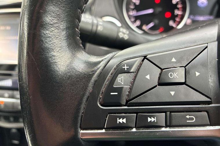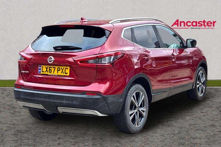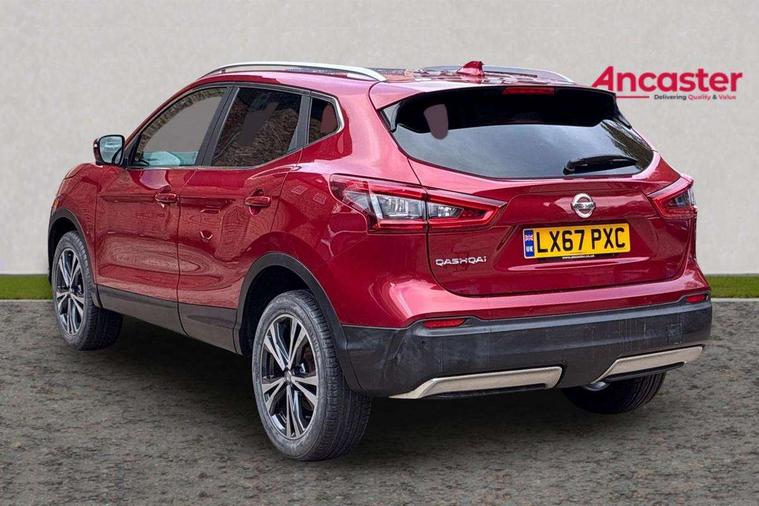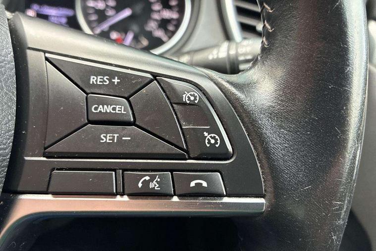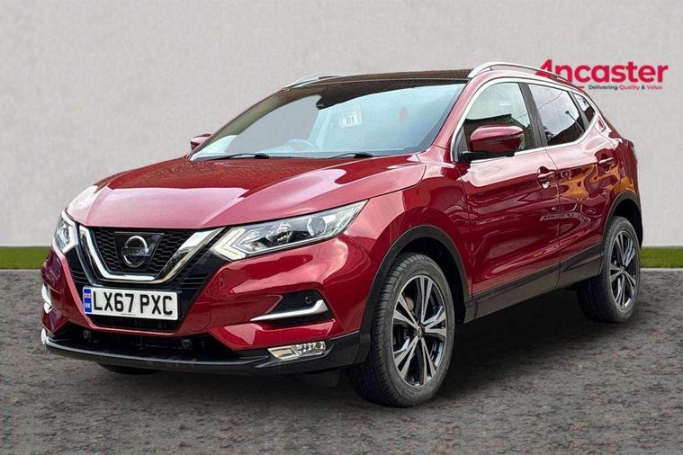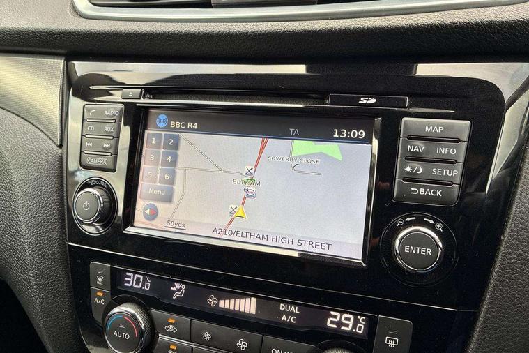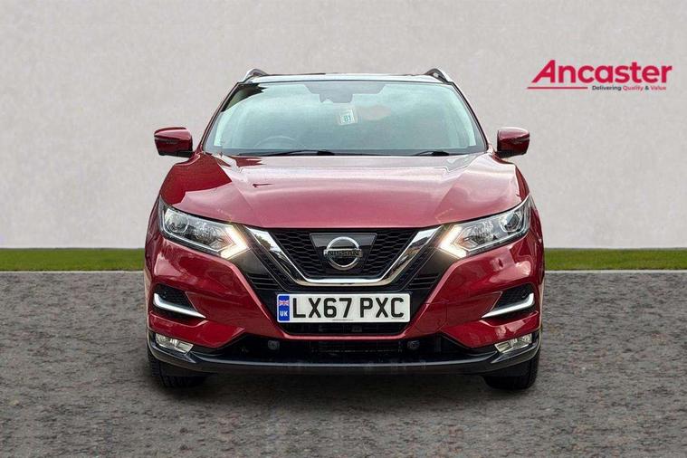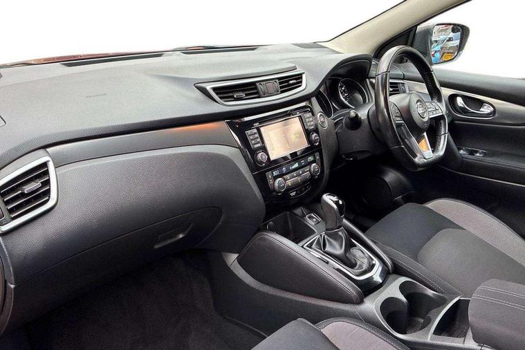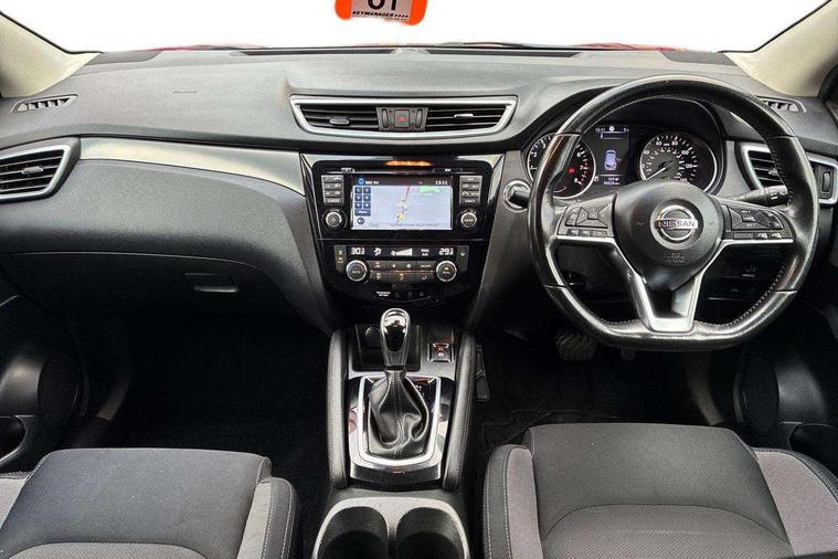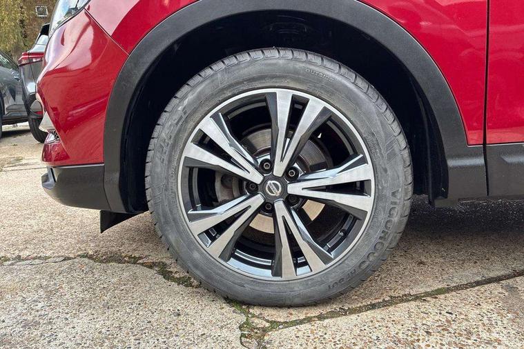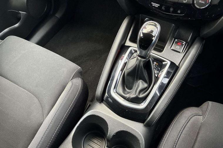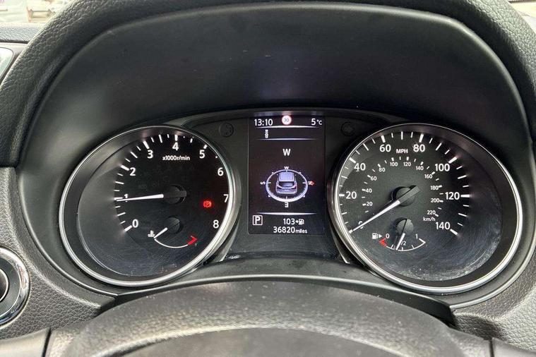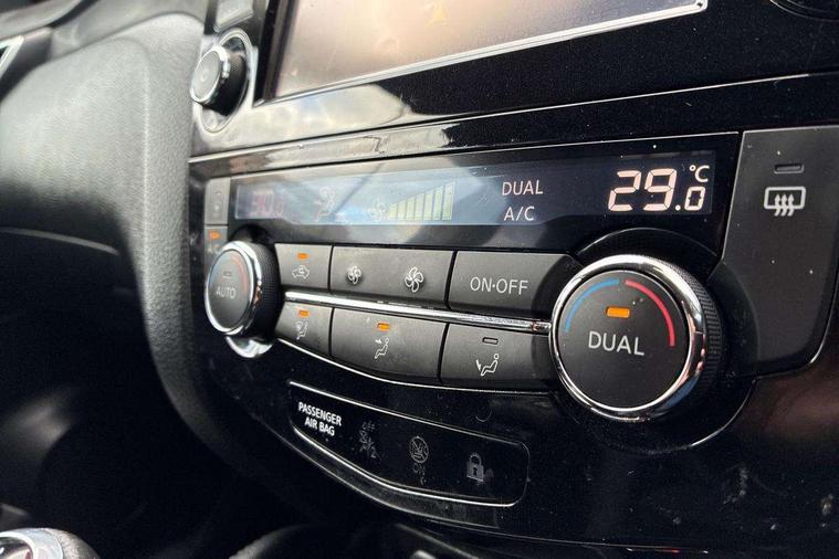 5" TFT driver information centre, Around View Monitor, Bluetooth phone integration system, Cruise control, Electric speed sensitive power steering, Front and rear parking sensors, Lane departure warning system, Nissan connect sat nav system, Outside temperature display, Push button starter, Rear view camera, Service interval indicator, Speed limiter, Traffic sign recognition, Trip computer, 'Shark fin' mobile antenna, 6 speakers, DAB Digital radio, Radio/CD, Smartphone apps, Steering wheel mounted audio controls, USB/aux input socket, Automatic headlamp activation, Body colour bumpers, Body colour door handles, Body colour door mirrors, Chrome window surround, Electric folding and heated door mirrors, High beam assist, Interior mirror with auto anti dazzle, LED indicators in door mirrors, Matt silver roof rails, One touch electric front/rear windows, Privacy glass, Rain sensor windscreen wipers, Rear roof spoiler, Rear wiper, 2 X front 12v power sockets, 60/40 split folding rear seat, Ambient interior lighting, Centre console with armrest, Chrome interior door handles, Cloth upholstery, Configurable luggage board system, Driver + front passenger lumbar support, Dual zone climate control, Front and rear door pockets with bottle holders, Front headrests, Front seat belt pre-tensioners with load limiters, Height adjustable driver's seat, Height adjustable passenger seat, Illuminated electric window switch, Isofix child seat preparation, Leather gearknob, Leather interior door handles, Leather knee rest, Leather steering wheel, Luggage compartment lighting, Parcel shelf, Pollen filter, Rake/reach adjustable steering wheel, Rear headrests, ABS, brake assist and EBD, Child locks on rear doors, Curtain airbags, Driver/front passenger airbag, Electronic parking brake, ESP + traction control, Forward emergency braking, Front passenger airbag deactivation, Height adjustable front seatbelts, Hill start assist, Seatbelt warning, Side airbags, Three 3 point rear seatbelts, Tyre pressure monitoring system, Alarm, Immobiliser, Intelligent Key, Remote central locking, Piano black interior trim, 18" Bi-colour alloy wheels, Tyre puncture repair kit,